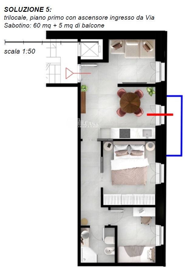 Trilocale al piano primo, con ascensore di 60 mq, con ingresso autonomo composto da ingresso su soggiorno con cucina open-space, una camera da letto matrimoniale, una cameretta, un bagno con doccia con areazione forzata, e balcone di 5 mq. La parte acquirente potr se richiesto apportare modifiche inerenti la distribuzione interna degli spazi, secondo le proprie necessit, scelta dei materiali ed eventuali personalizzazioni.