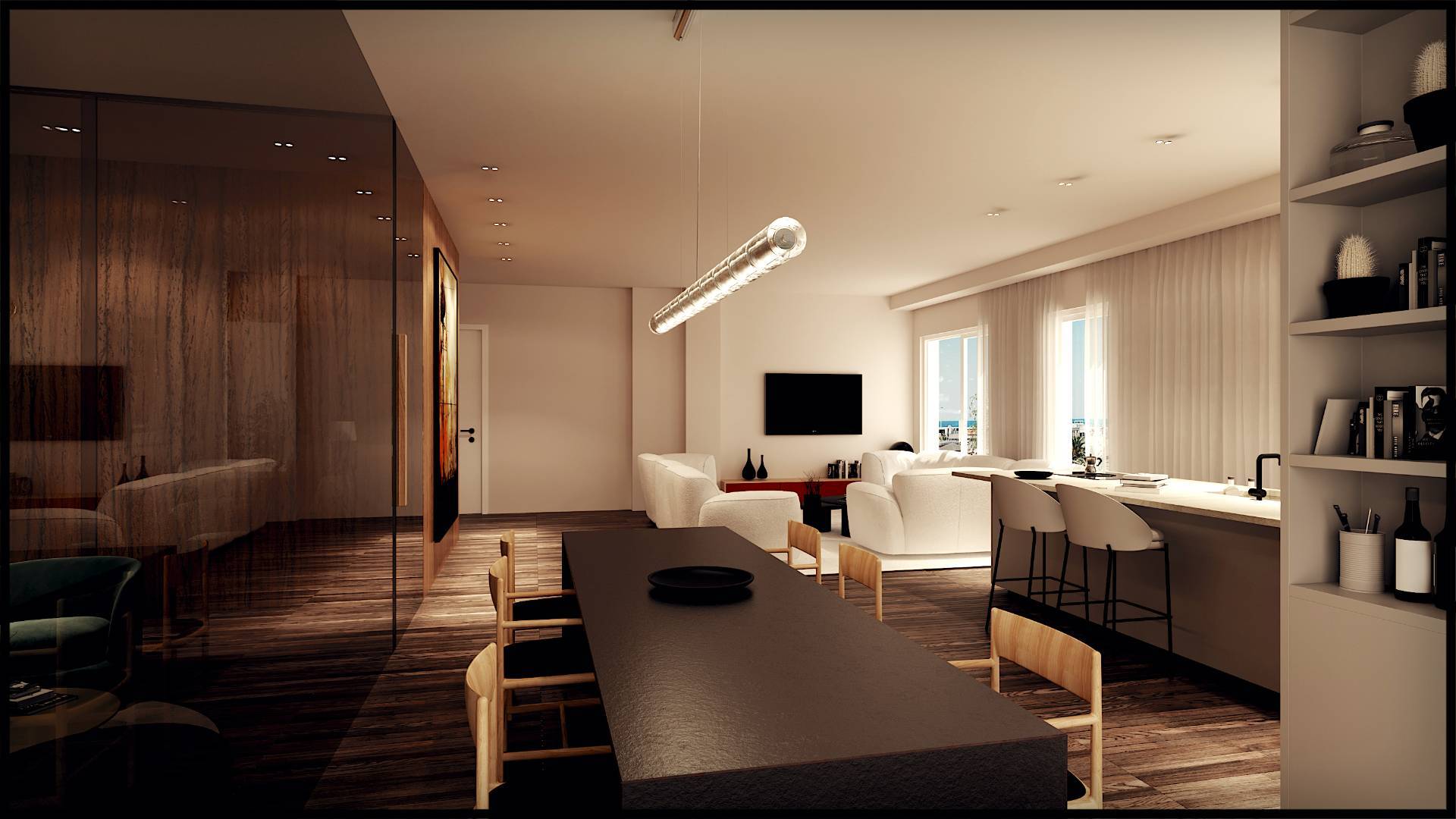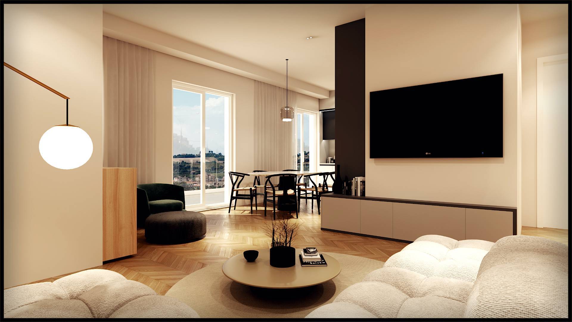 Nellipotesi distributiva proposta lappartamento si sviluppa con ingresso su un ampio salone soggiorno con angolo cottura, tre grandi camere matrimoniali, uno studio utilizzabile anche come quarta camera da letto, quattro bagni di cui tre finestrati, locale lavanderia e corridoio dedicato alla zona notte.