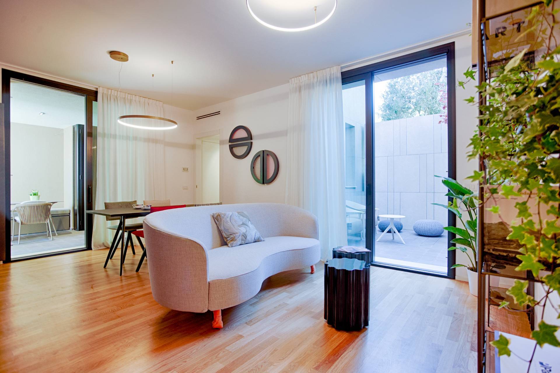 L'unit si trova in una piccola palazzina di tre piani, parte del prestigioso complesso residenziale Caroselli Garden House, una soluzione abitativa esclusiva e accessibile solo ai residenti tramite tastierino numerico all'ingresso.