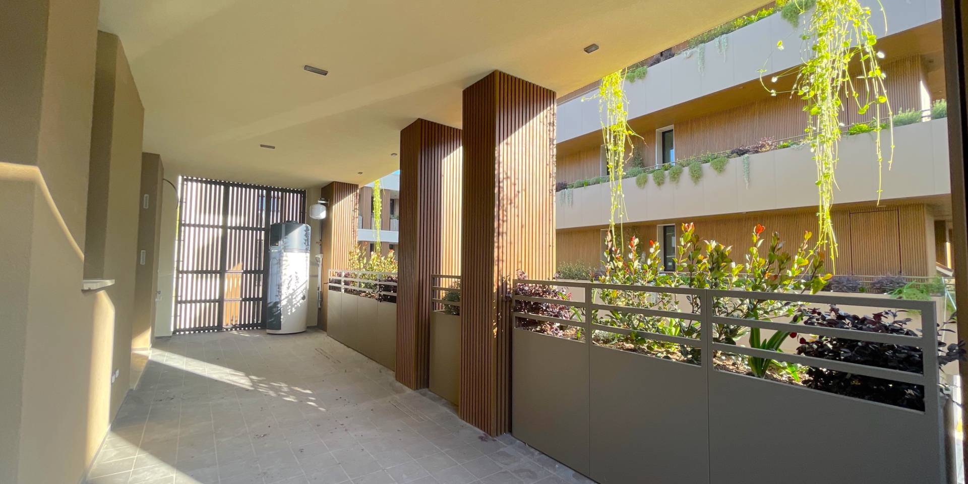 Il complesso circondato da un incantevole giardino interno, con piante ornamentali su tutte le balconate e logge esterne, e l'irrigazione gestita da un sistema centralizzato con accumulo d'acqua.
