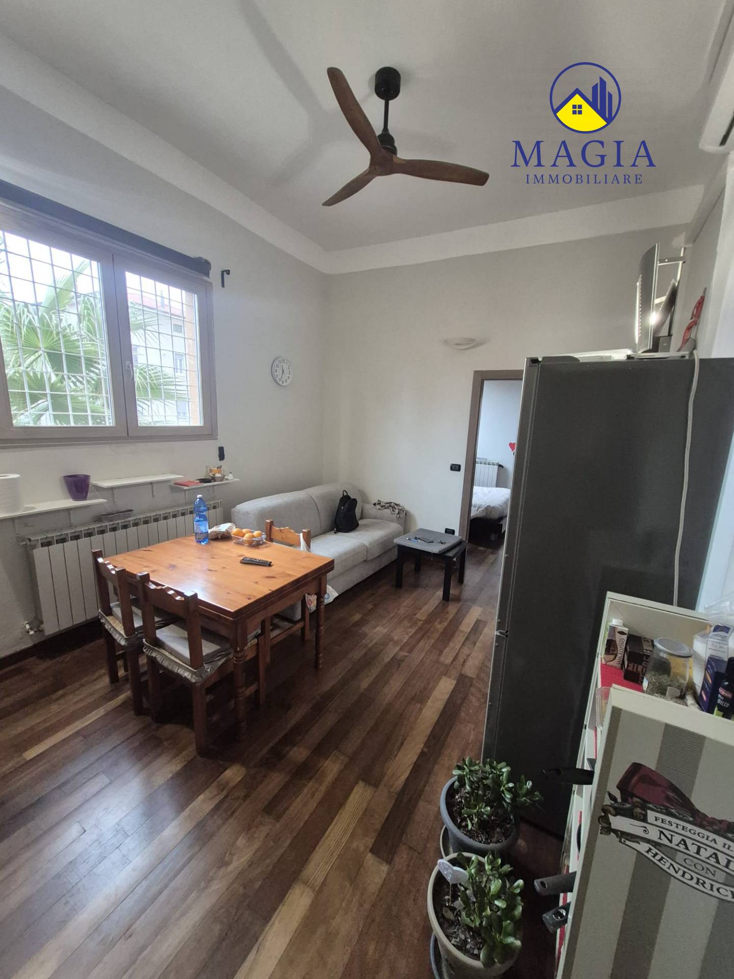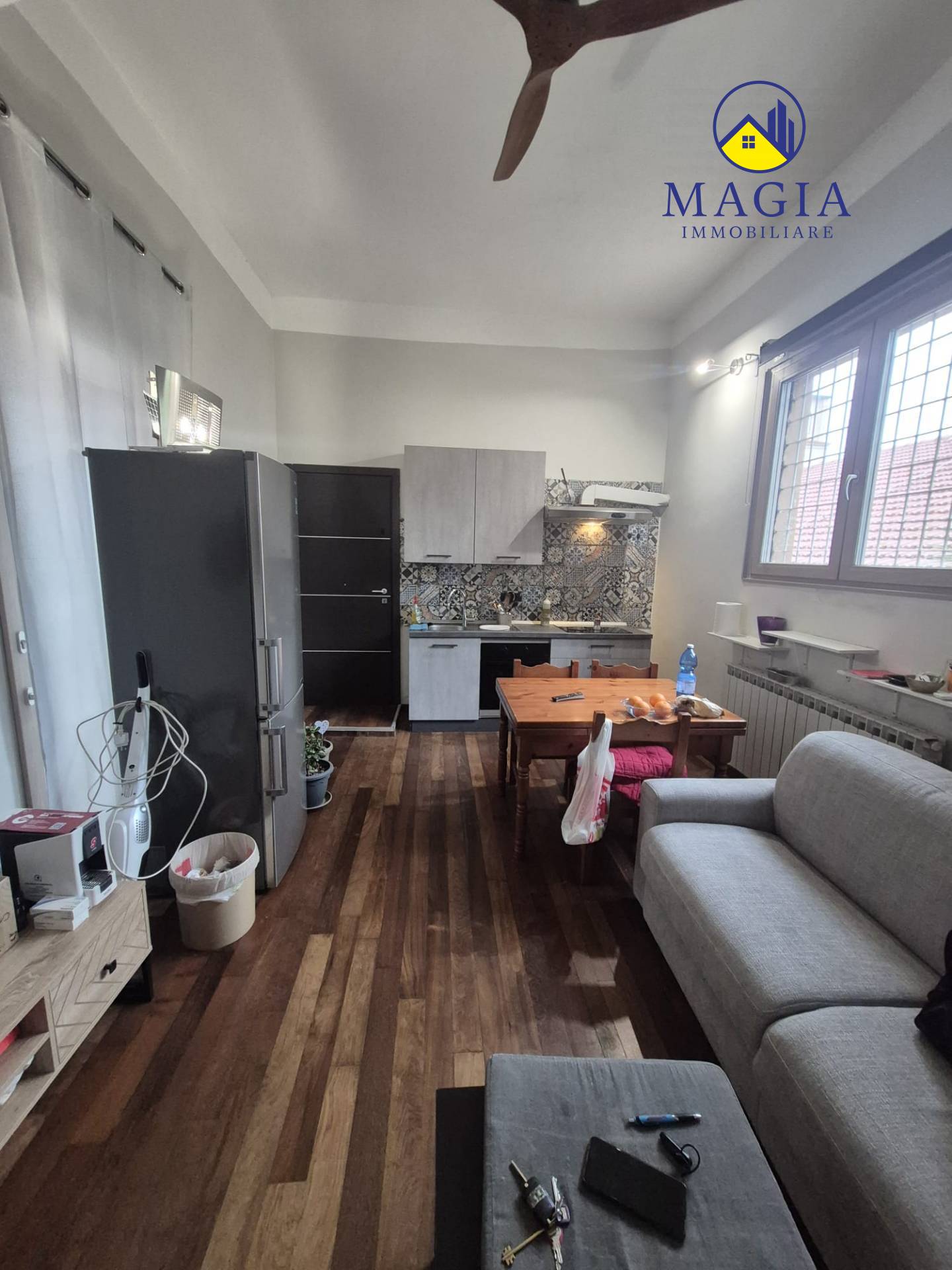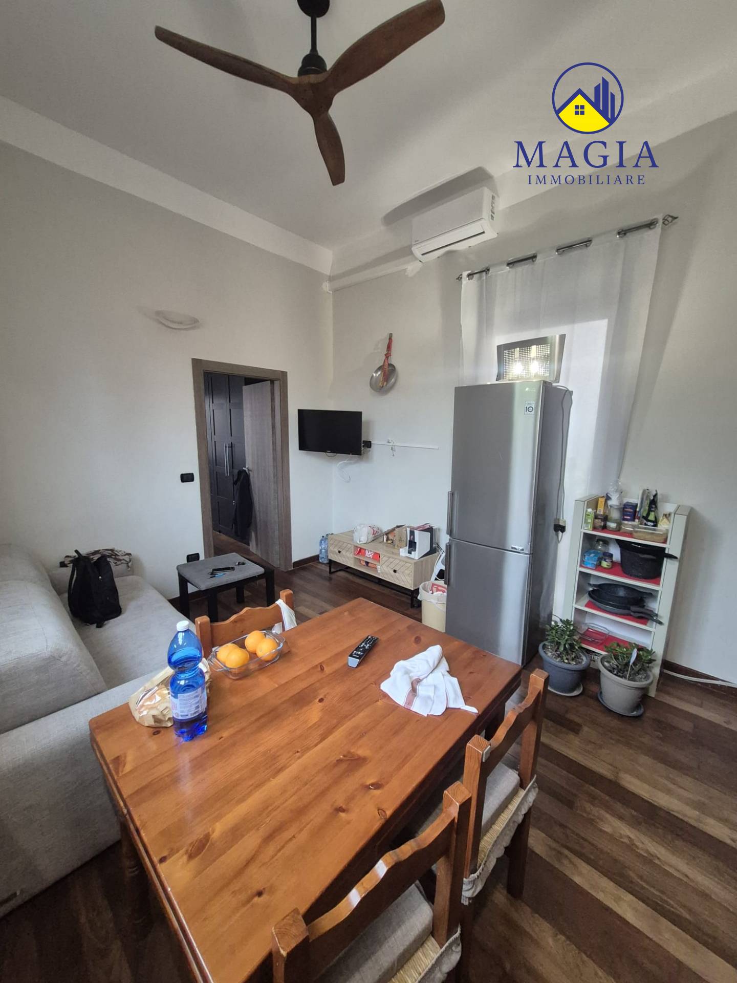 Lingresso si apre su un luminoso soggiorno con cucina a vista, ambiente ben organizzato e funzionale.