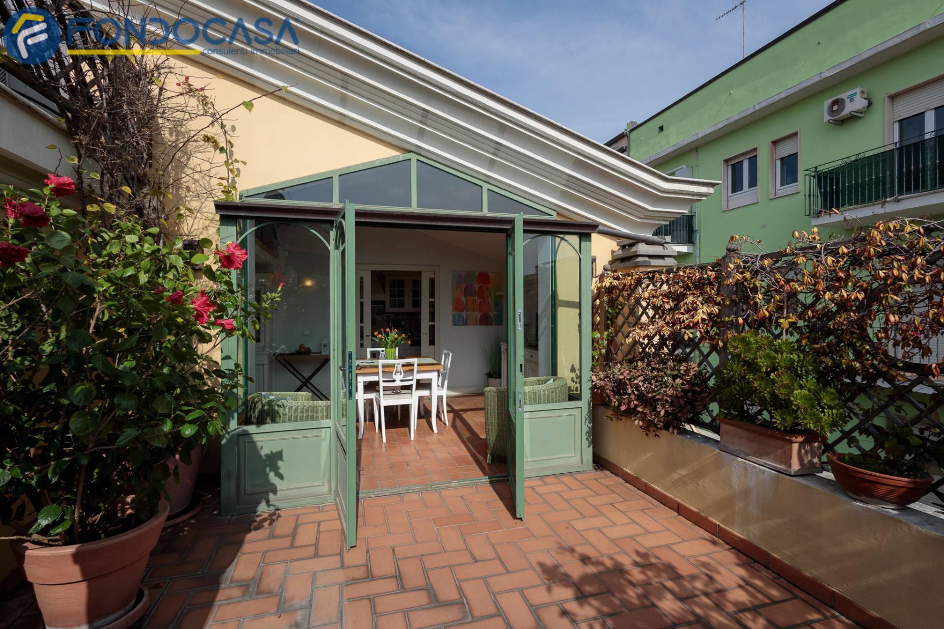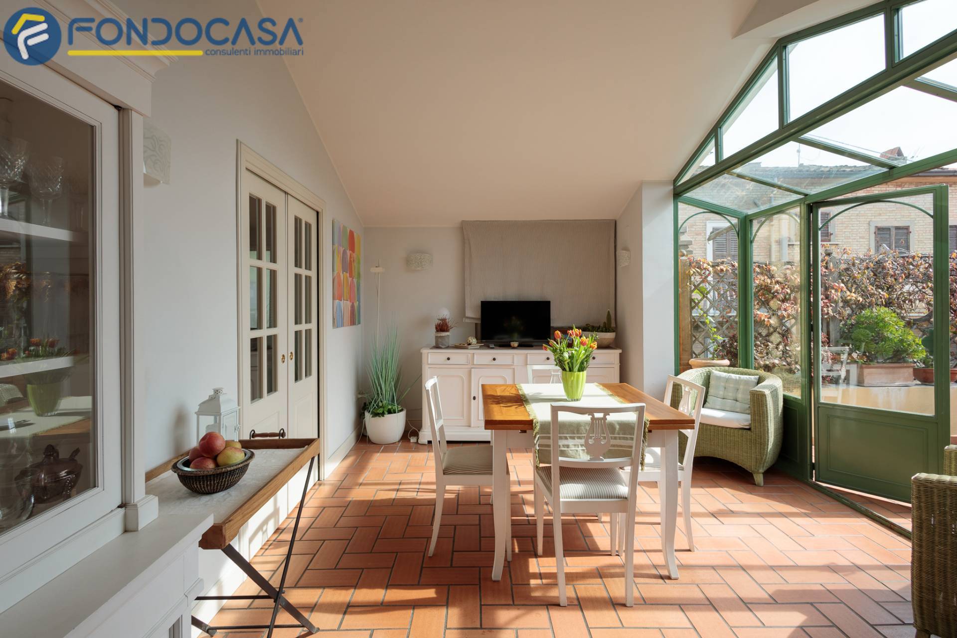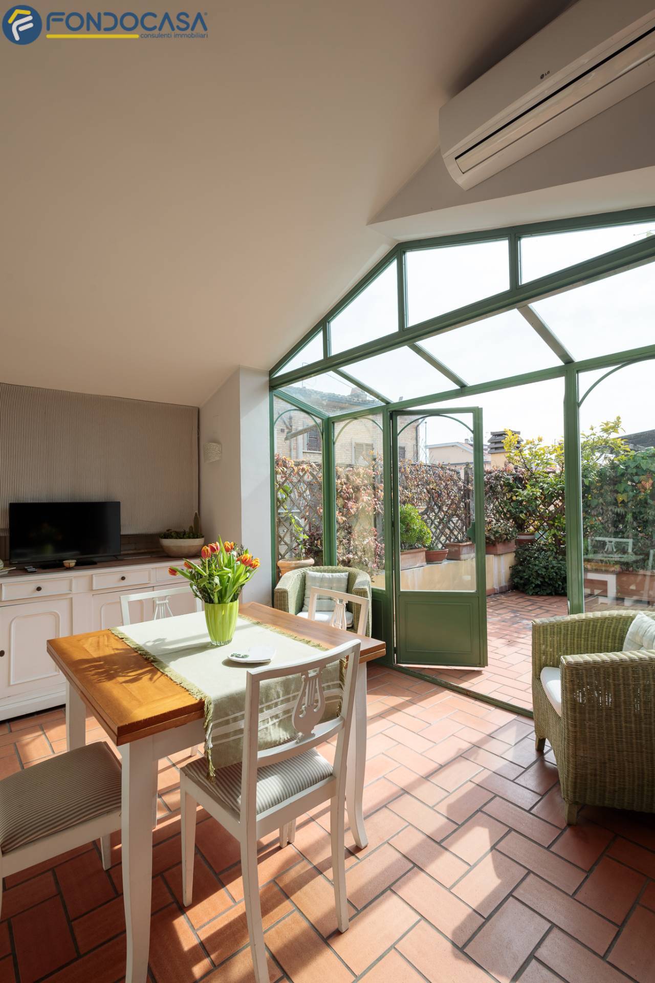Salendo, il superattico regala unatmosfera unica: una cucina con sala pranzo verandata affacciata sul terrazzo, un ambiente da vivere in ogni stagione, luminoso e scenografico, con esposizione estsud.