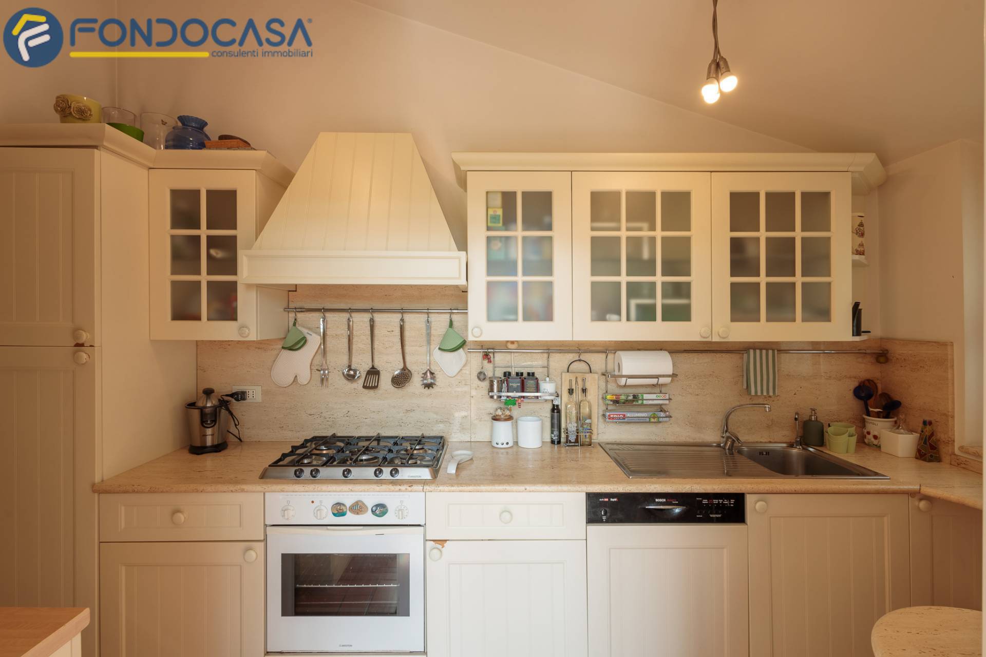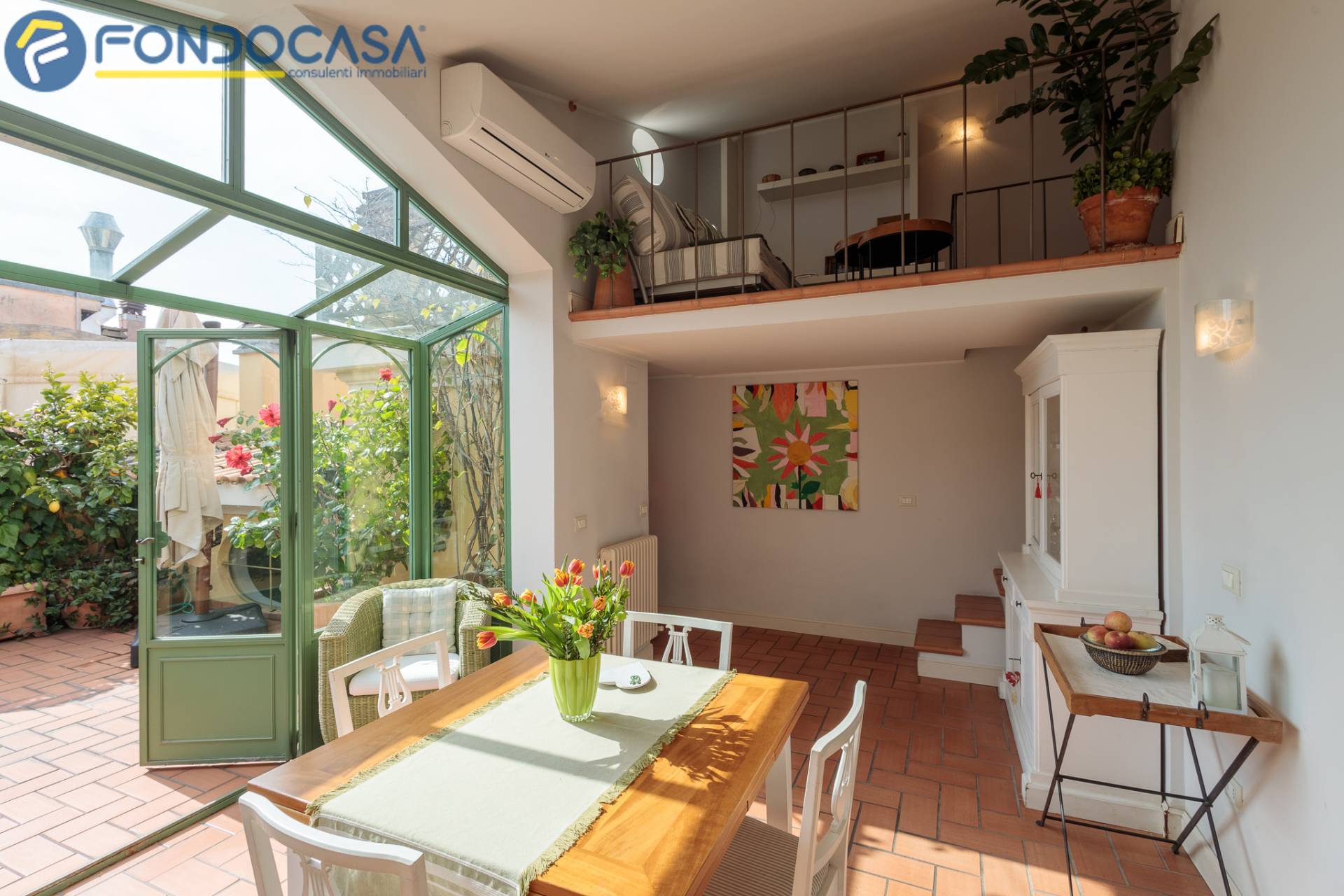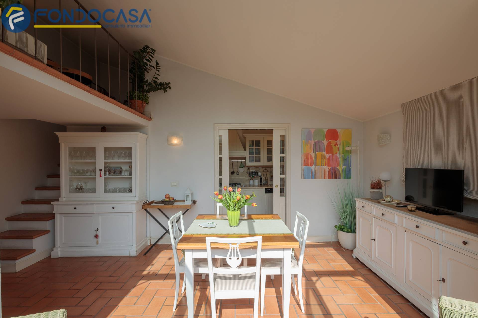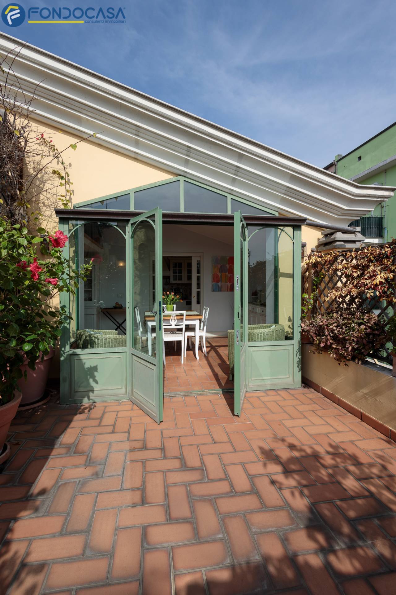 Salendo, il superattico regala unatmosfera unica: una cucina con sala pranzo verandata affacciata sul terrazzo, un ambiente da vivere in ogni stagione, luminoso e scenografico, con esposizione estsud.