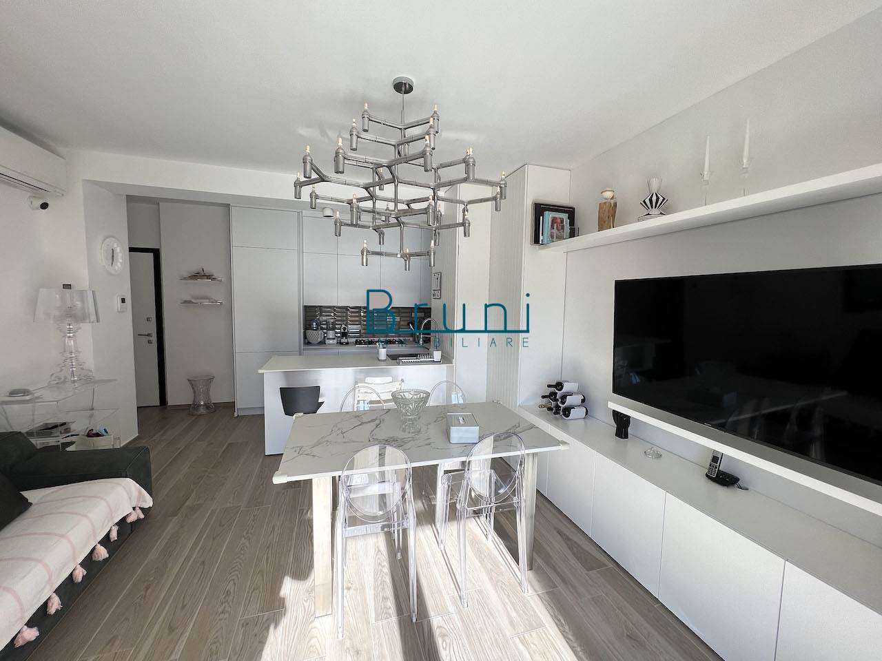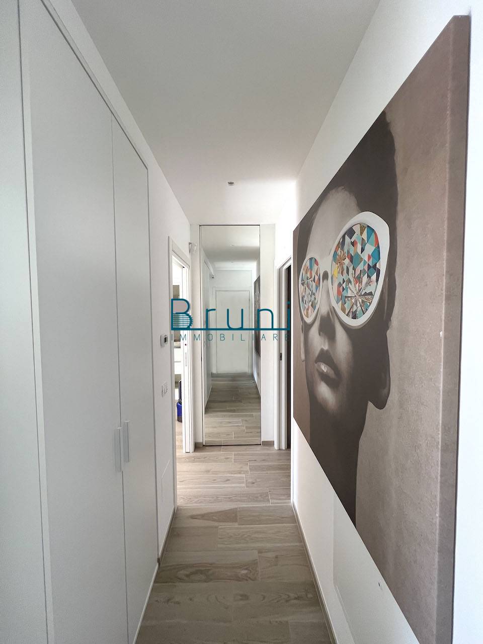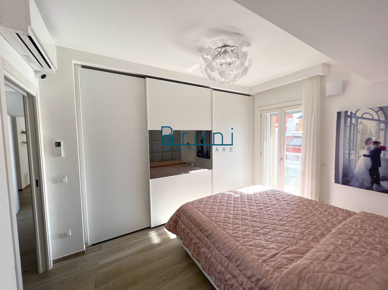 Cos composto: ingresso su disimpegno, soggiorno con cucina a vista, due camere da letto di cui una matrimoniale, una doppia, un ripostiglio, due bagni di cui uno in camera matrimoniale con finestra e cabina doccia, uno ad areazione forzata con cabina doccia, oltre a balcone perimetrale di circa 12 mq. L'immobile in oggetto si presenta in ottime condizioni, con pavimentazione in gres taglio parquet su tutta la superficie, tapparelle motorizzate, infissi in pvc con doppio vetro, aria condizionata in tutti gli ambienti, impianto di allarme, riscaldamento a pavimento, pannelli solari fotovoltaici, videocitofono, impianti a norma, autonomo.