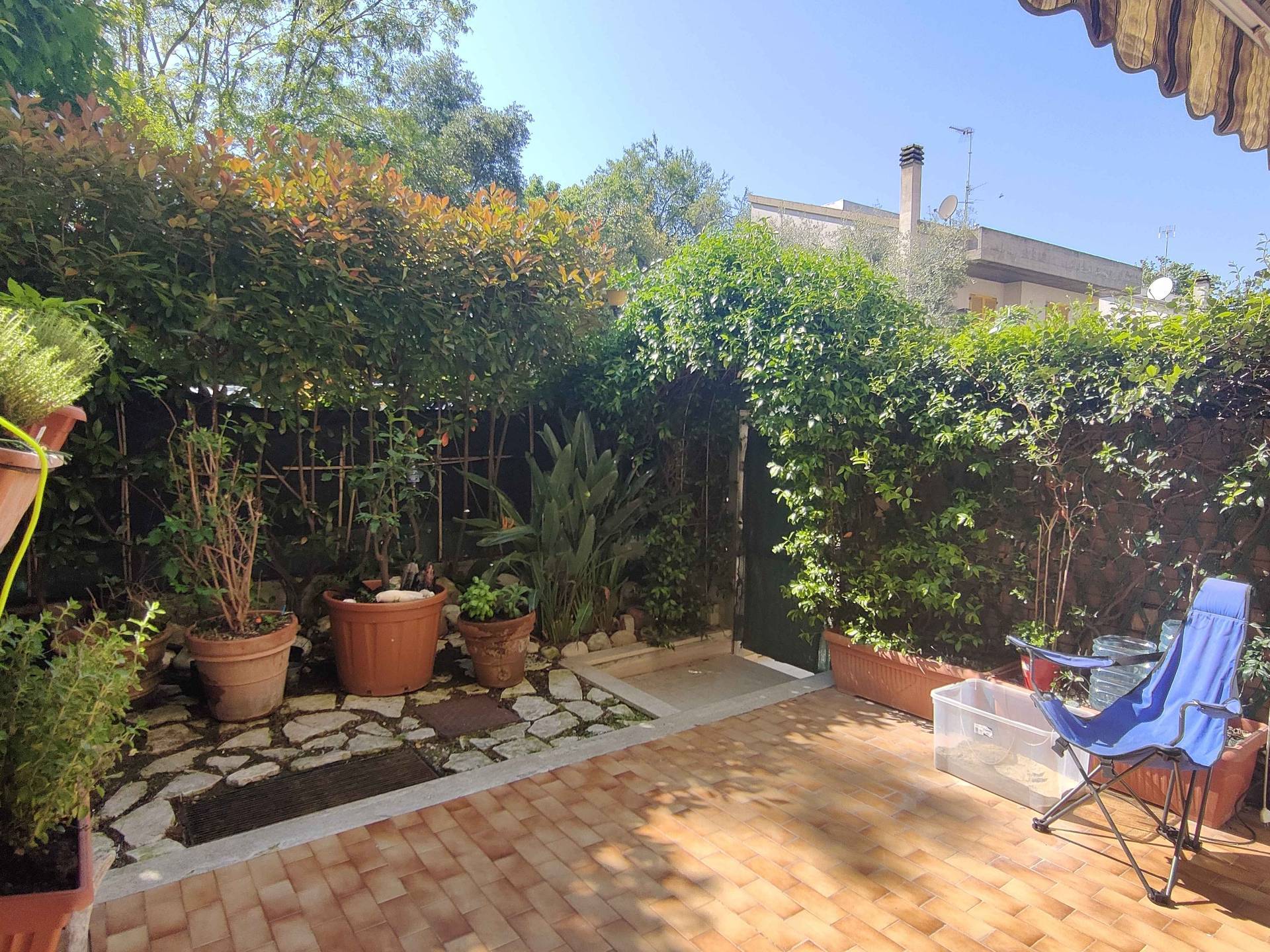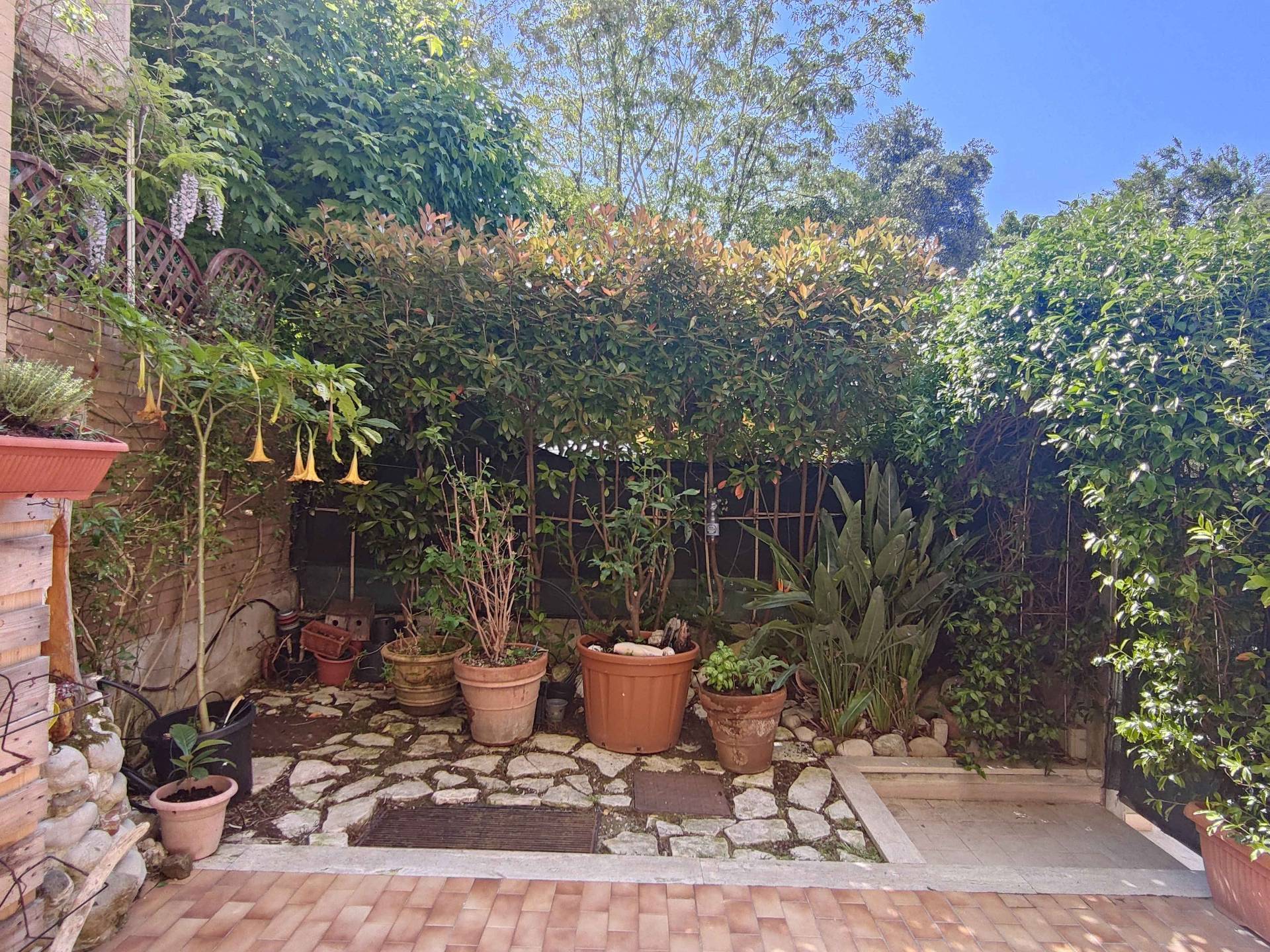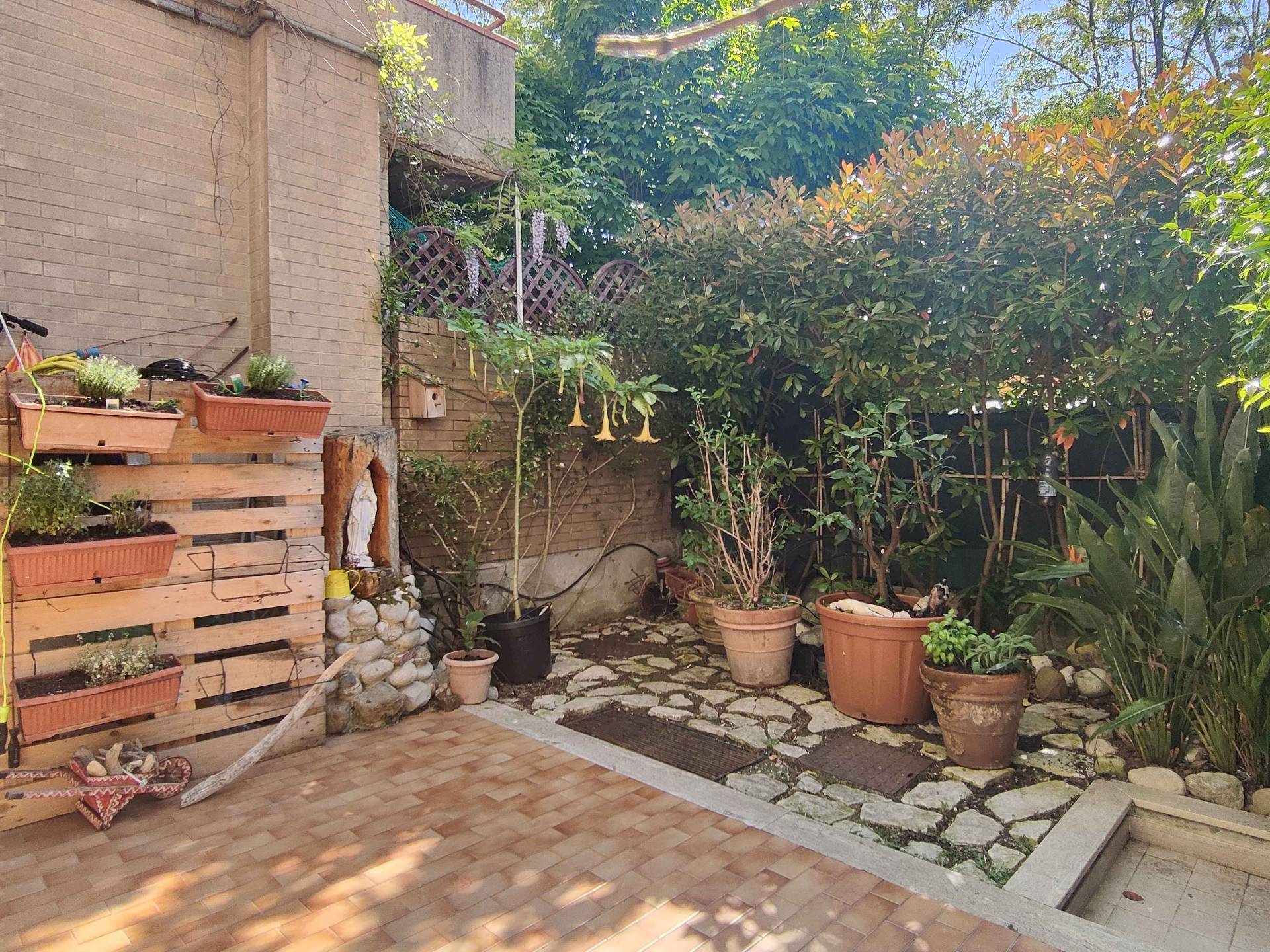 Completano la propriet due corti private, una esposta ad est (in corrispondenza delle camere) e l'altra ad ovest (adiacente la cucina) per complessivi mq 70 circa, un fondaco di mq 7 ed un garage di mq 17, entrambi posti al piano seminterrato dello stesso stabile.