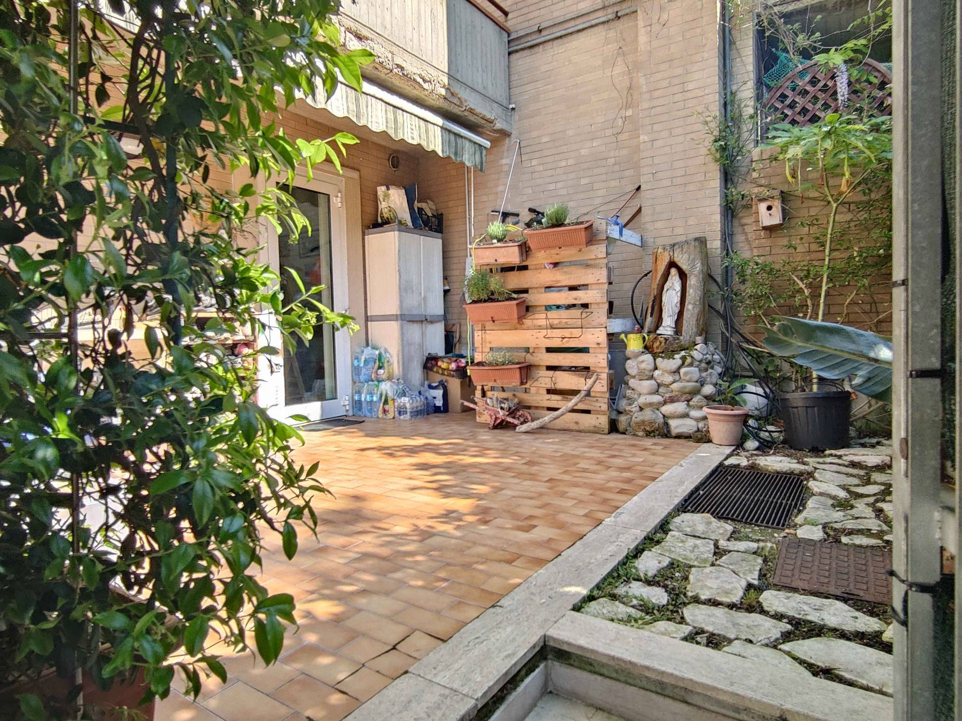 Appartamento con ingresso indipendente, in vendita in territorio di Acquaviva Picena, a ridosso del confine con il comune di San Benedetto del Tronto, posto al piano terra di un piccolo condominio, delle dimensioni di circa mq 60 coperti oltre a due corti/giardino di circa mq 70, un comodo fondaco di circa mq 7 ed un garage di circa mq 17. L'alloggio, completamente ristrutturato nel 2010 per modificare la distribuzione interna dei locali, cos composto: ingresso indipendente da corte privata/giardino, cucina abitabile, disimpegno, due camere (una matrimoniale e una singola), un ripostiglio/cabina armadio ed un bagno con doccia e finestra.