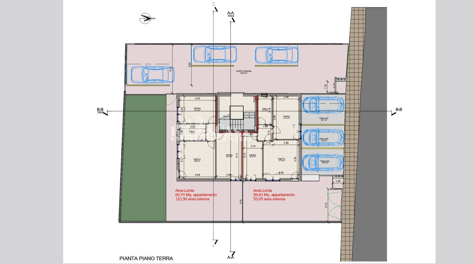 Appartamento 61 mq al piano terra con ingresso autonomo composto da ingresso su ampio soggiono con cucina open space, due camere da letto di cui una matrimoniale ed una doppia, un bagno con doccia, corte esterna per complessivi 123,50 mq di cui 70 mq a giardino e 53,50 corte pavimentata.