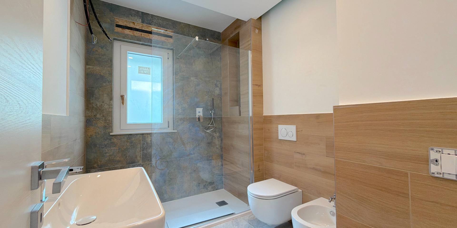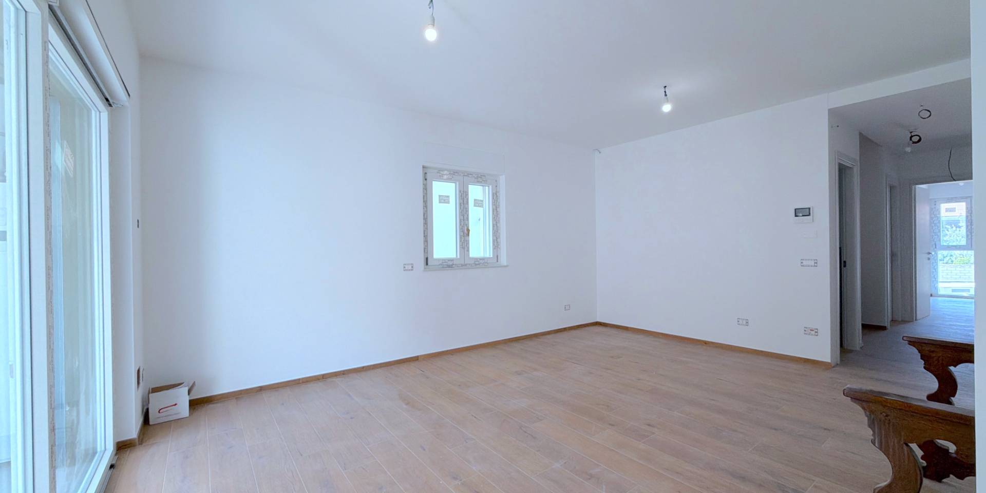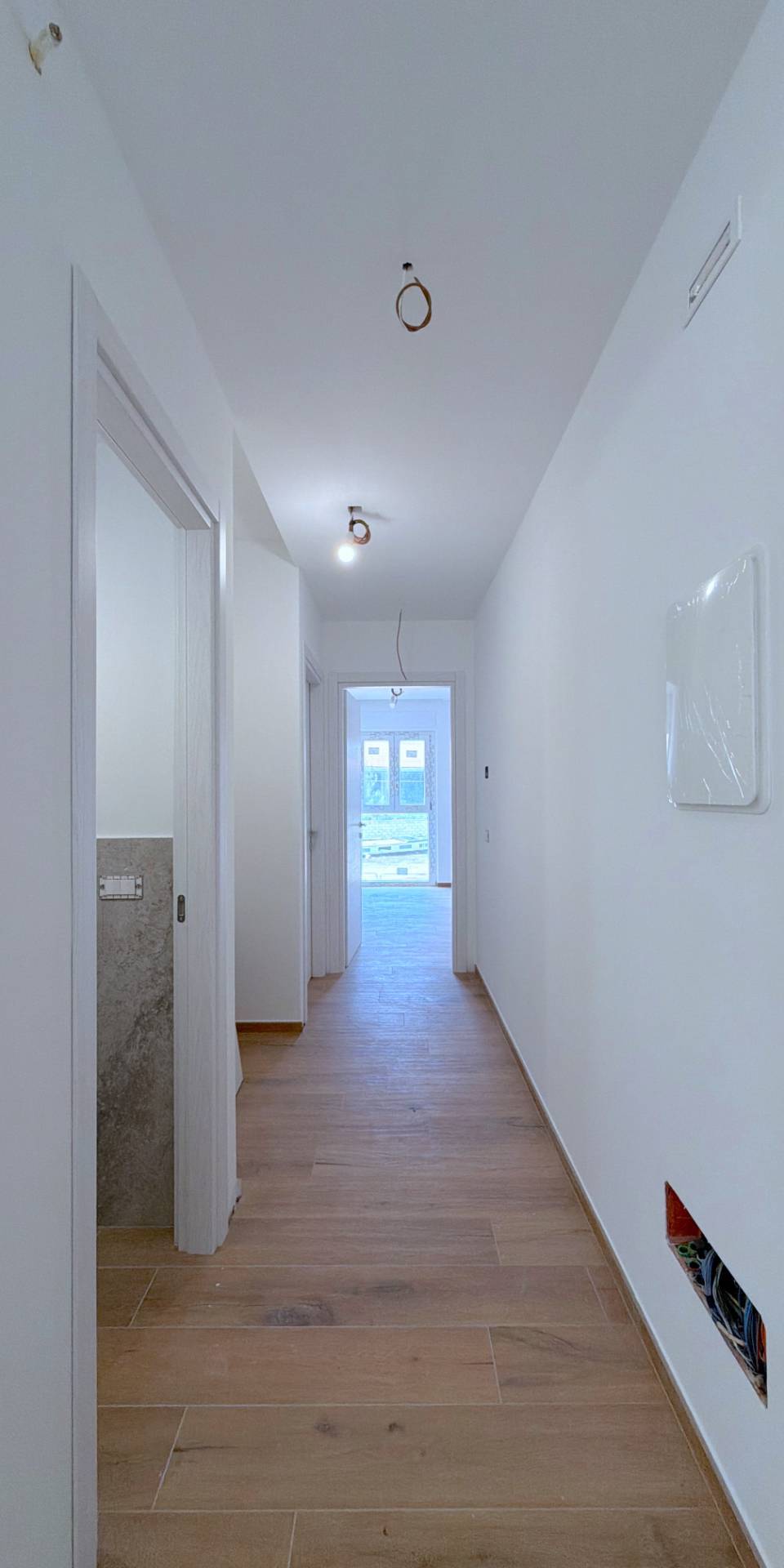 L'appartamento, di nuova costruzione, ben rifinito con pavimentazione in gress porcellanato, infissi di qualit Shuco, riscaldamento a pavimento, numerose controsoffittature con luce riflessa, tapparelle elettriche, impianto di allarme predisposto, controllo domotico del riscaldamento/clima a distanza, predisposizione completa per aria condizionata in tutte le stanze (mancante solo dello split nella stanza, ma gi fornito di inverter esterno), impianto fotovoltaico privato di 3,5 Kw per ogni singolo appartamento, con accumulo privato di 7 Kw per ogni appartamento.