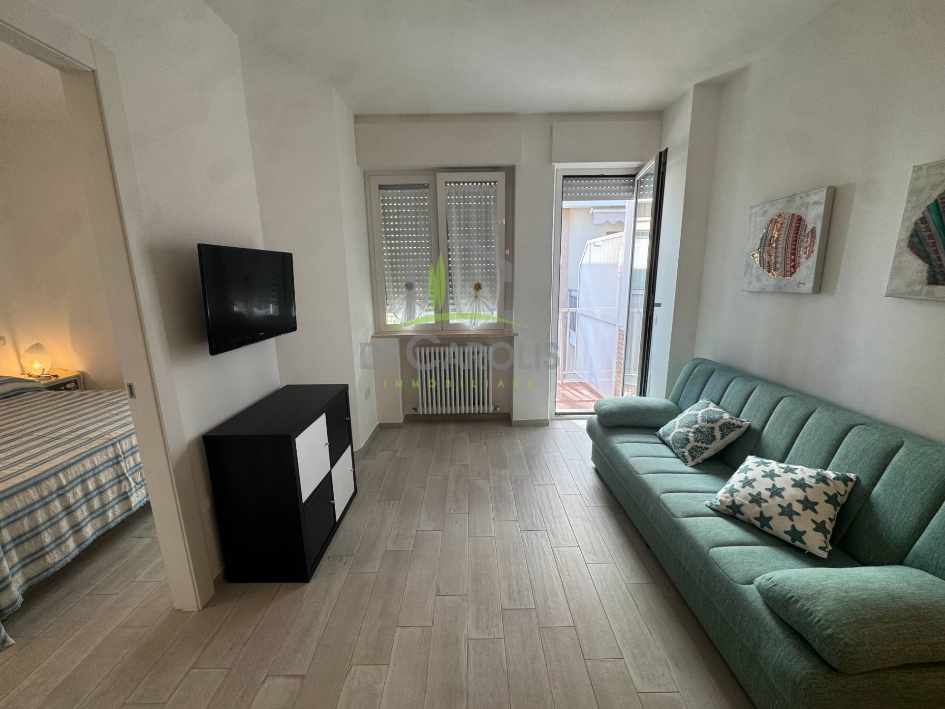 L'appartamento completamente ristrutturato e con tutti i comfort di ultima generazione composto da ingresso, soggiorno con cucina a vista due camere, un bagno, balcone con vista mare laterale.