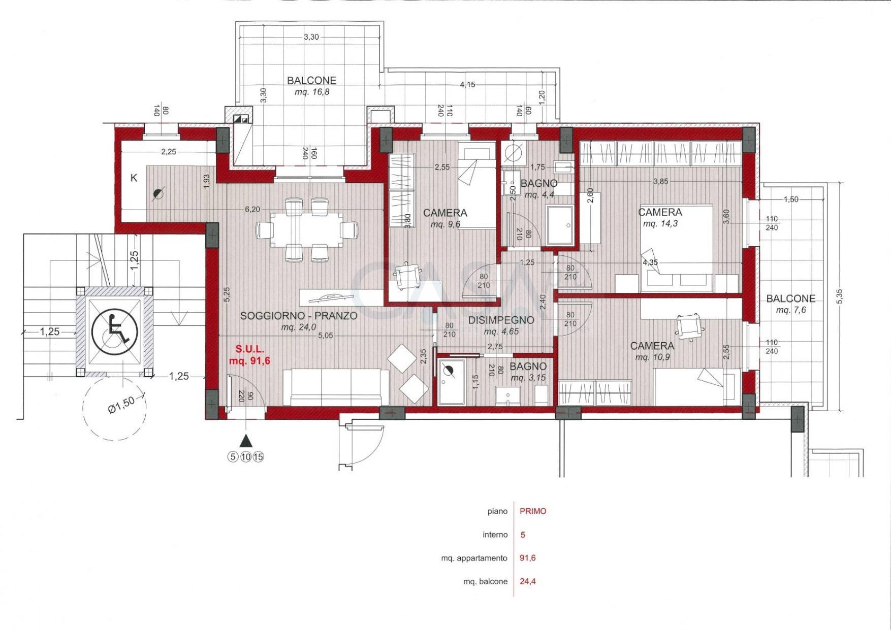 L'unit abitativa si compone di soggiorno/pranzo servita da balcone di 17 mq circa, cucina, una camera matrimoniale, due camere singole, un balcone al servizio della camera matrimoniale e di una singola oltre a due bagni di cui uno con finestra l'altro con areazione forzata.