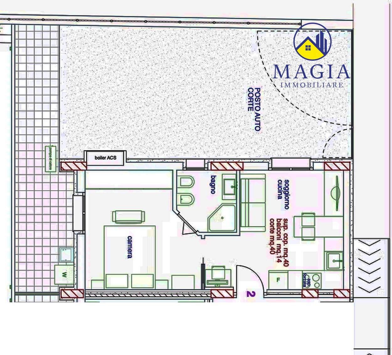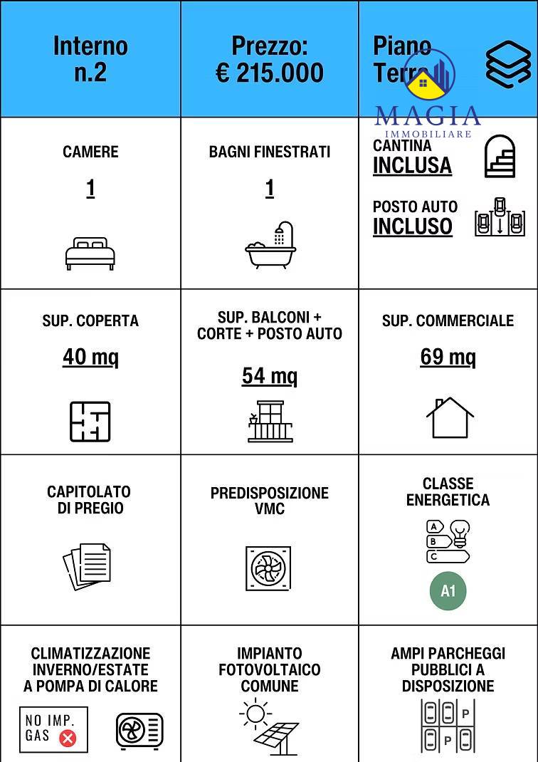 Lappartamento di mq. 40 si trova al Piano Terra, con Corte Privata per una superficie di 54 mq. Suddiviso internamente, con una zona giorno con Ingresso su soggiorno e cucina a vista, una camera matrimoniale e bagno.