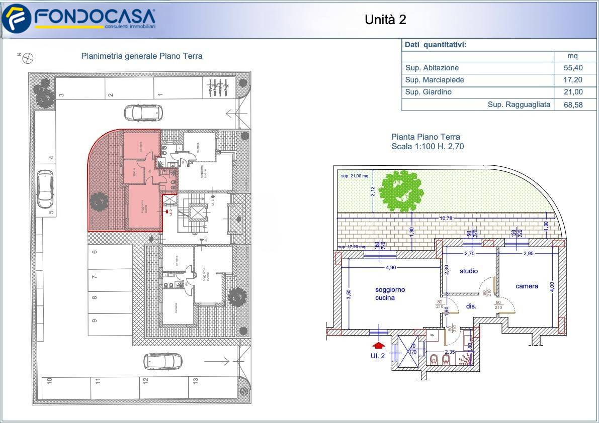 Proponiamo in vendita un appartamento al Piano terra di Mq 55,40 con corte privata di Mq 38,20 composto da: ingresso su soggiorno con angolo cottura, disimpegno su zona notte con un bagno, n.1 camera matrimoniale e n. 1 studio/camera.