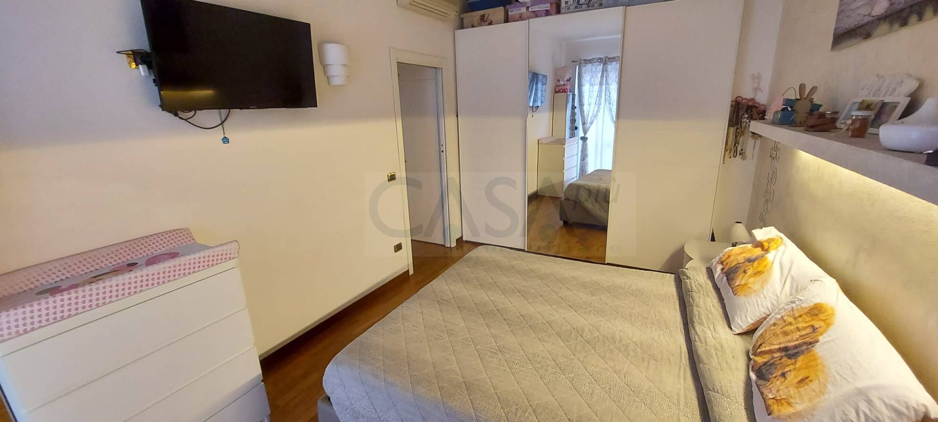 L'appartamento presenta pavimento in travertino nella zona giorno e parquet nella zona notte, infissi in legno con doppio vetro e persiane, videocitofono, aria condizionata, controsoffitto con faretti, porte a scrigno e portoncino blindato.