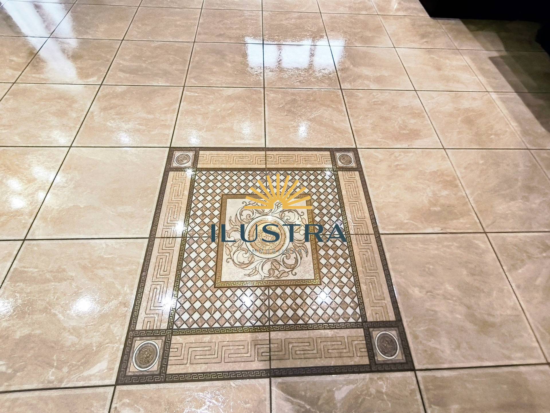 Design: Pavimentazione in gres con mosaico e controsoffitto con illuminazione integrata.