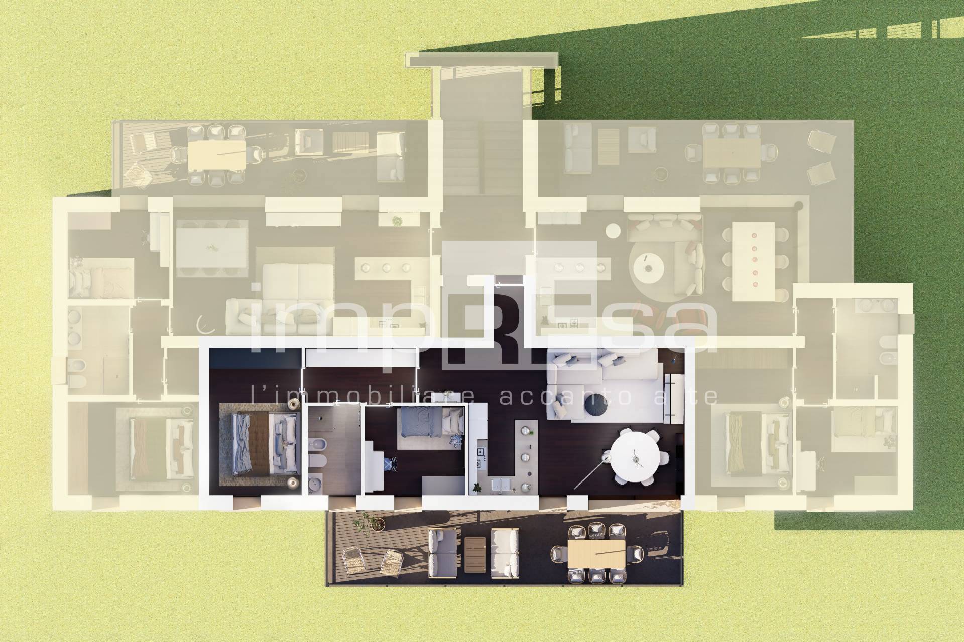 La superficie totale di circa 122 mq ospita un'ampia zona giorno con cucina a vista ed un terrazzo abitabile.