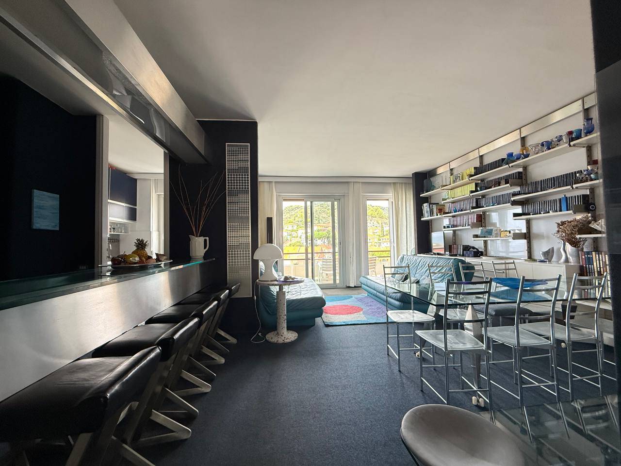 La zona living, elegante e panoramica, da cui si accede direttamente al terrazzo vista mare ed armoniosamente collegata alla cucina.