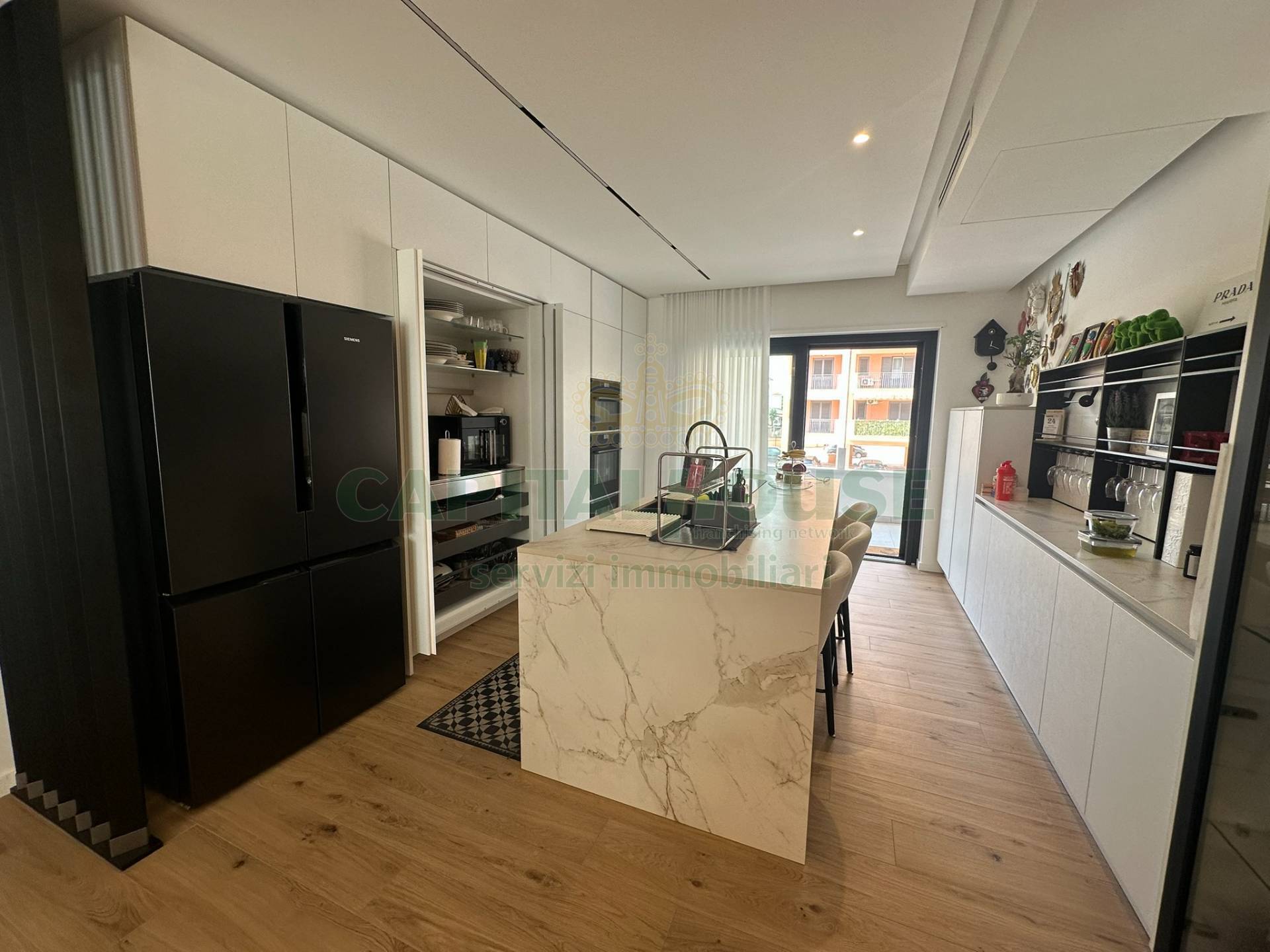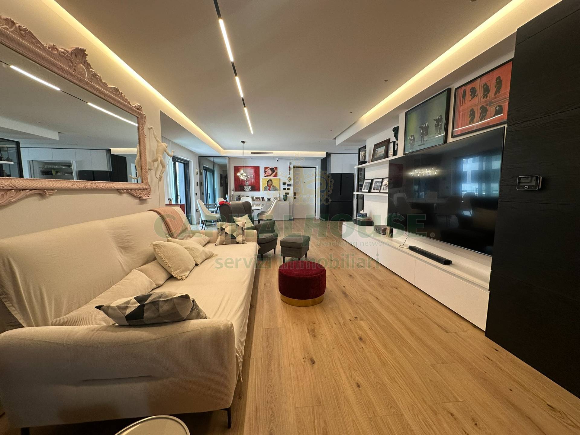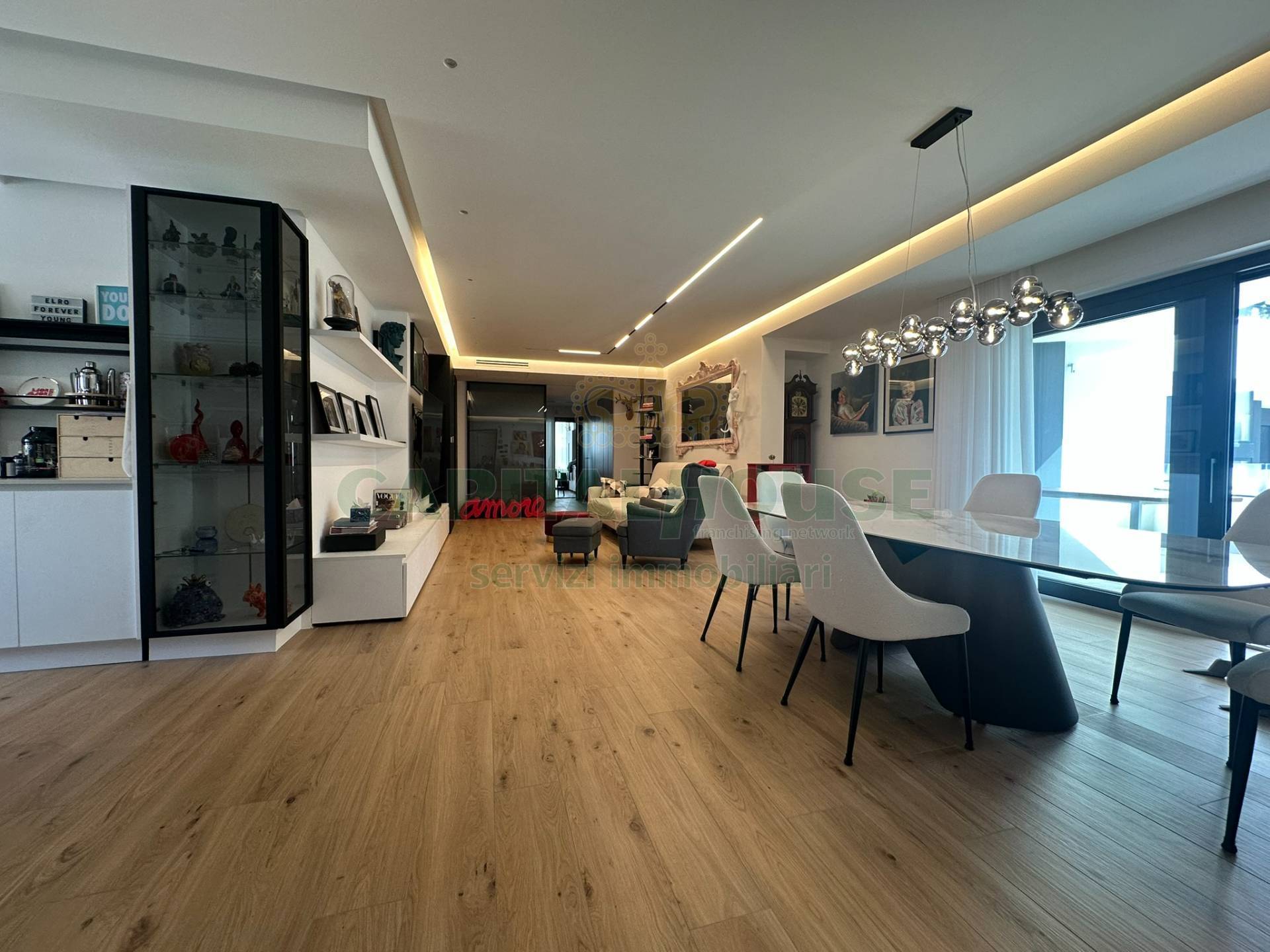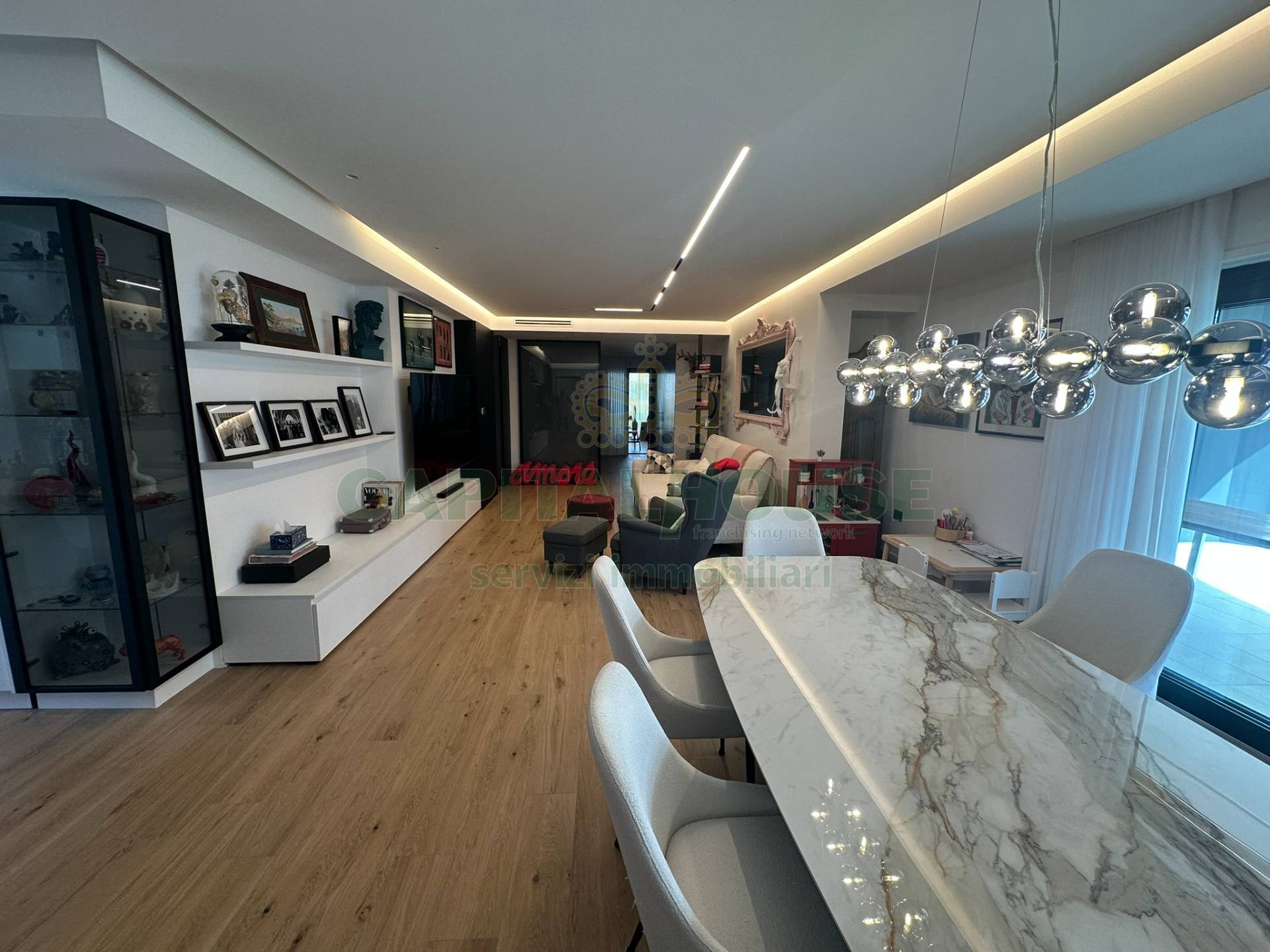 Nello specifico la soluzione sita al 1 piano e si estende su una superficie interna di ***.*******.** 142 mq , all'ingresso troviamo un salone-cucina living, arredato con : ingresso completo di cappottiera , una cucina ampia e moderna costituita da isola totalmente attrezzata con elettrodomestici di alta gamma, tavolo Cattelan compreso di sedie, parete attrezzata con tv QLed 85 2025 , divano 3 posti con predisposizione elettrica, libreria a muro Cattelan.