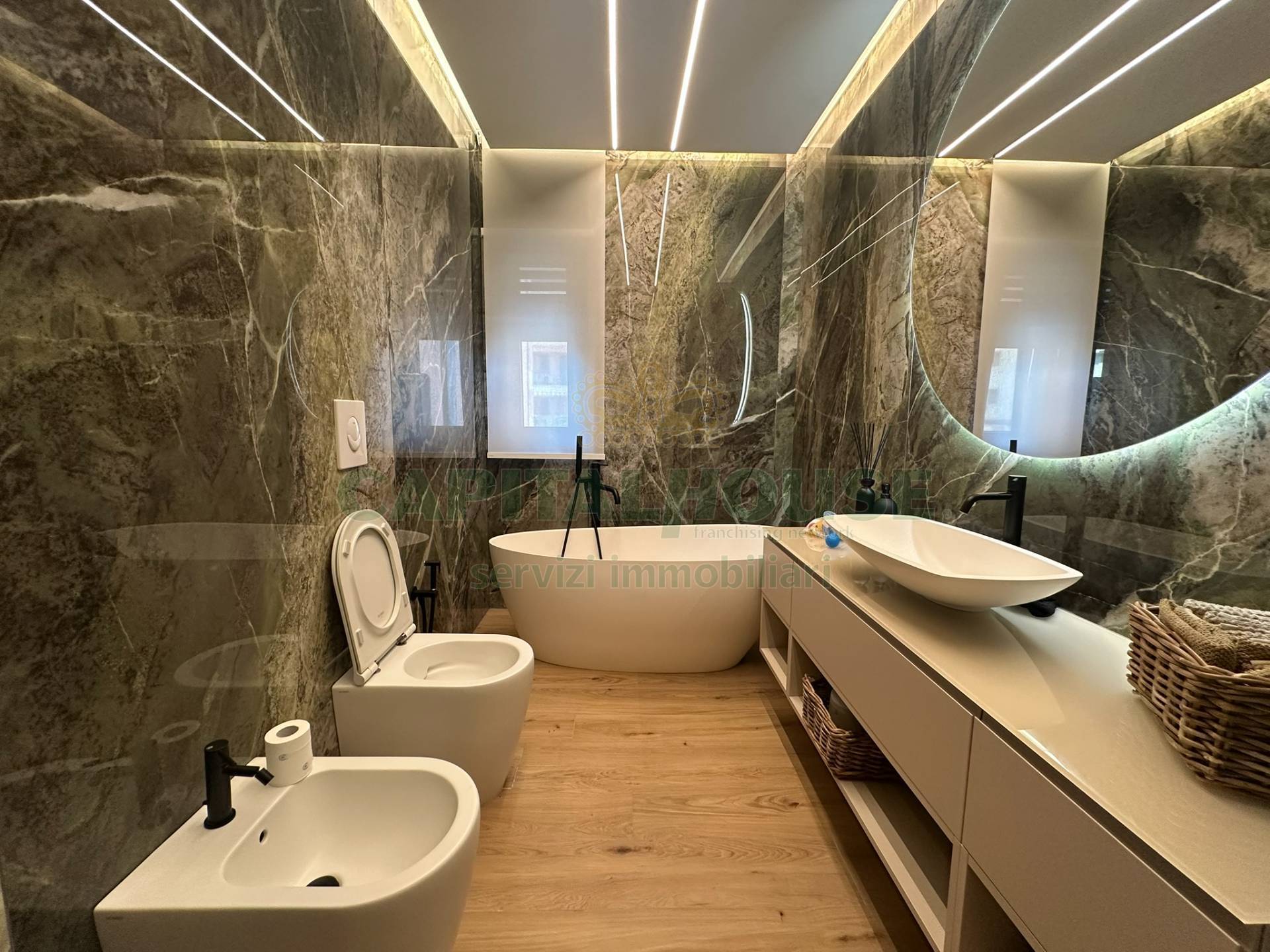 Due camere da letto con cabina armadio, due servizi di cui uno in camera con vasca idromassaggio e vano lavanderia.