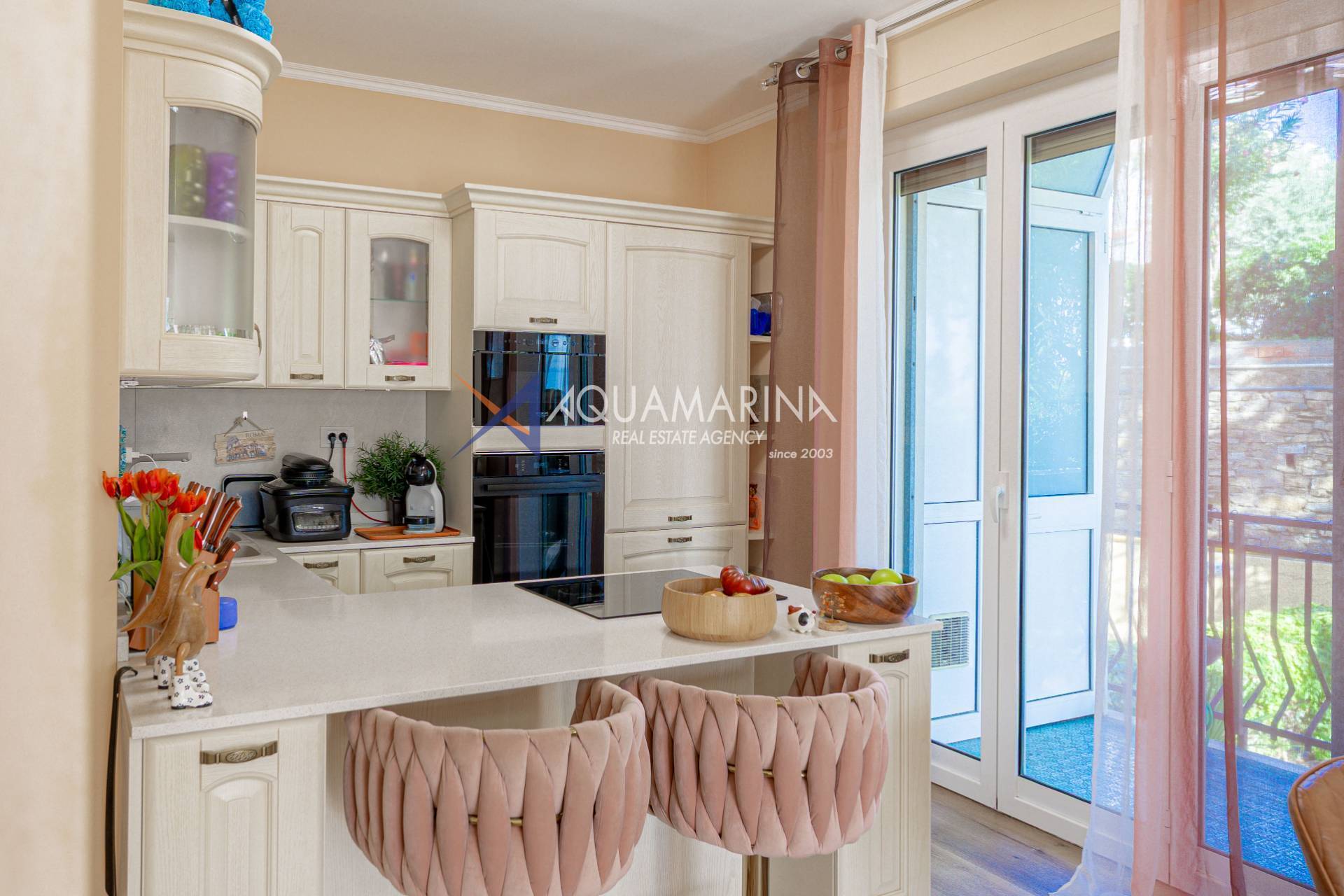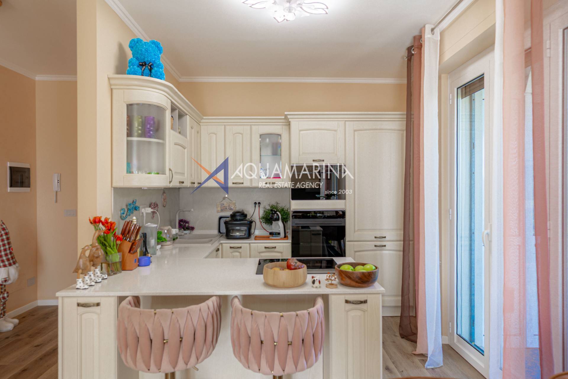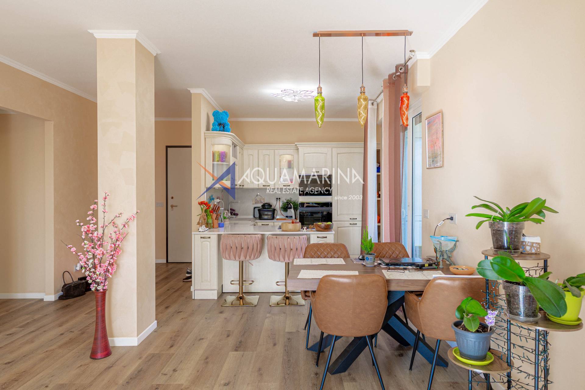 Composizione: due ampie camere da letto; due bagni, di cui uno con accesso diretto dalla camera; soggiorno con cucina a vista; ampio balcone con vista aperta sul mare e giardino, ideale per momenti di relax allaria aperta.