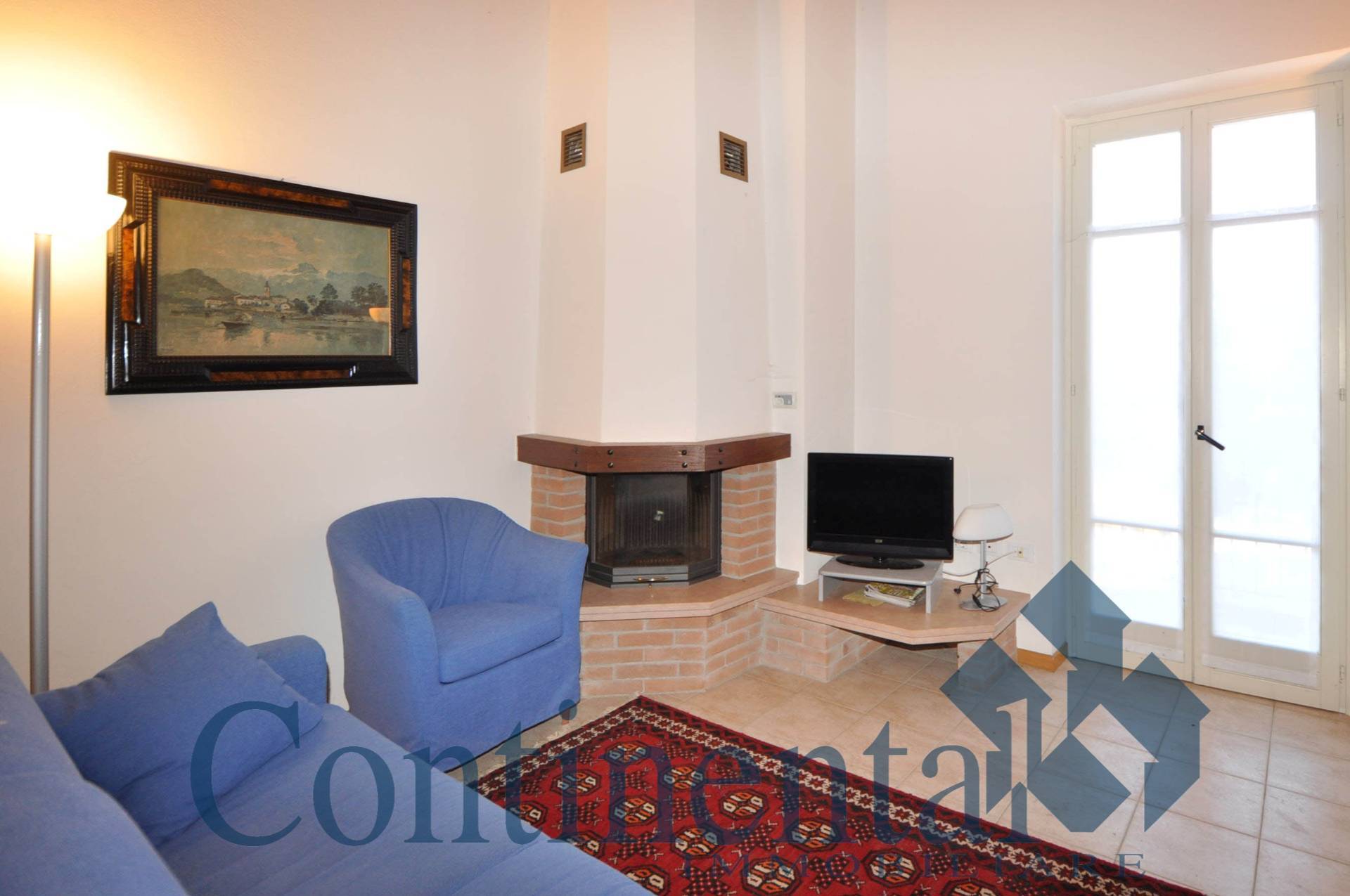 Lingresso si apre direttamente sulla zona giorno dotata di caminetto, balcone e angolo cottura.