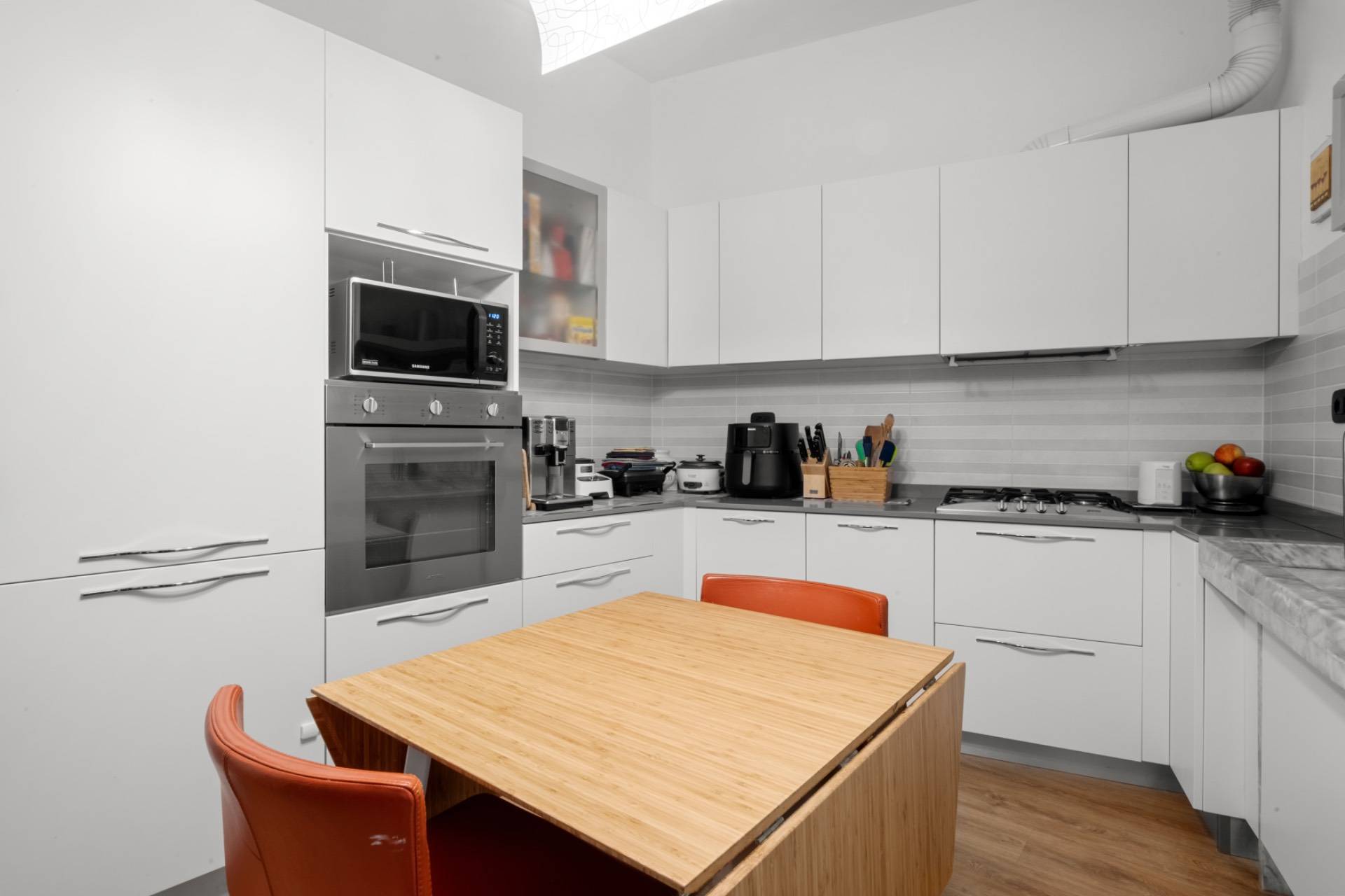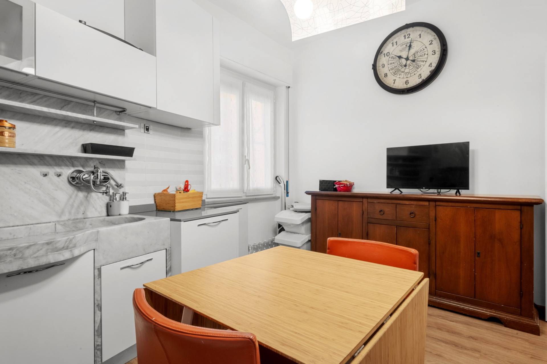 La cucina abitabile, realizzata su misura, uno degli elementi distintivi della casa: progettata attorno al tipico lavandino ligure in marmo, unisce tradizione e praticit, offrendo uno spazio perfetto per la quotidianit.