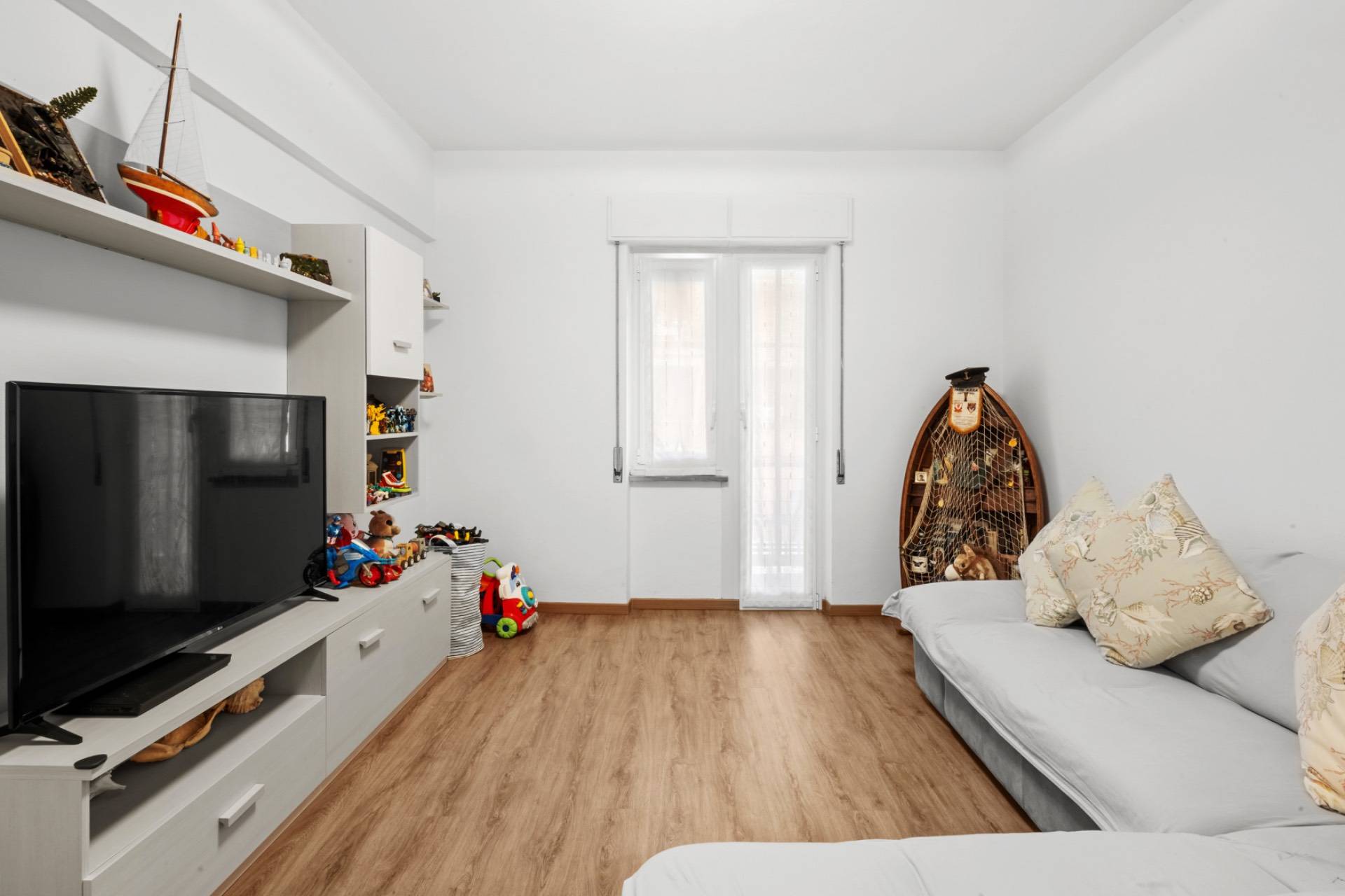 Lingresso conduce a un soggiorno accogliente e luminoso, arricchito da un balcone con tenda parasole, uno sfogo esterno sempre pi ricercato che regala luce e vivibilit agli ambienti.