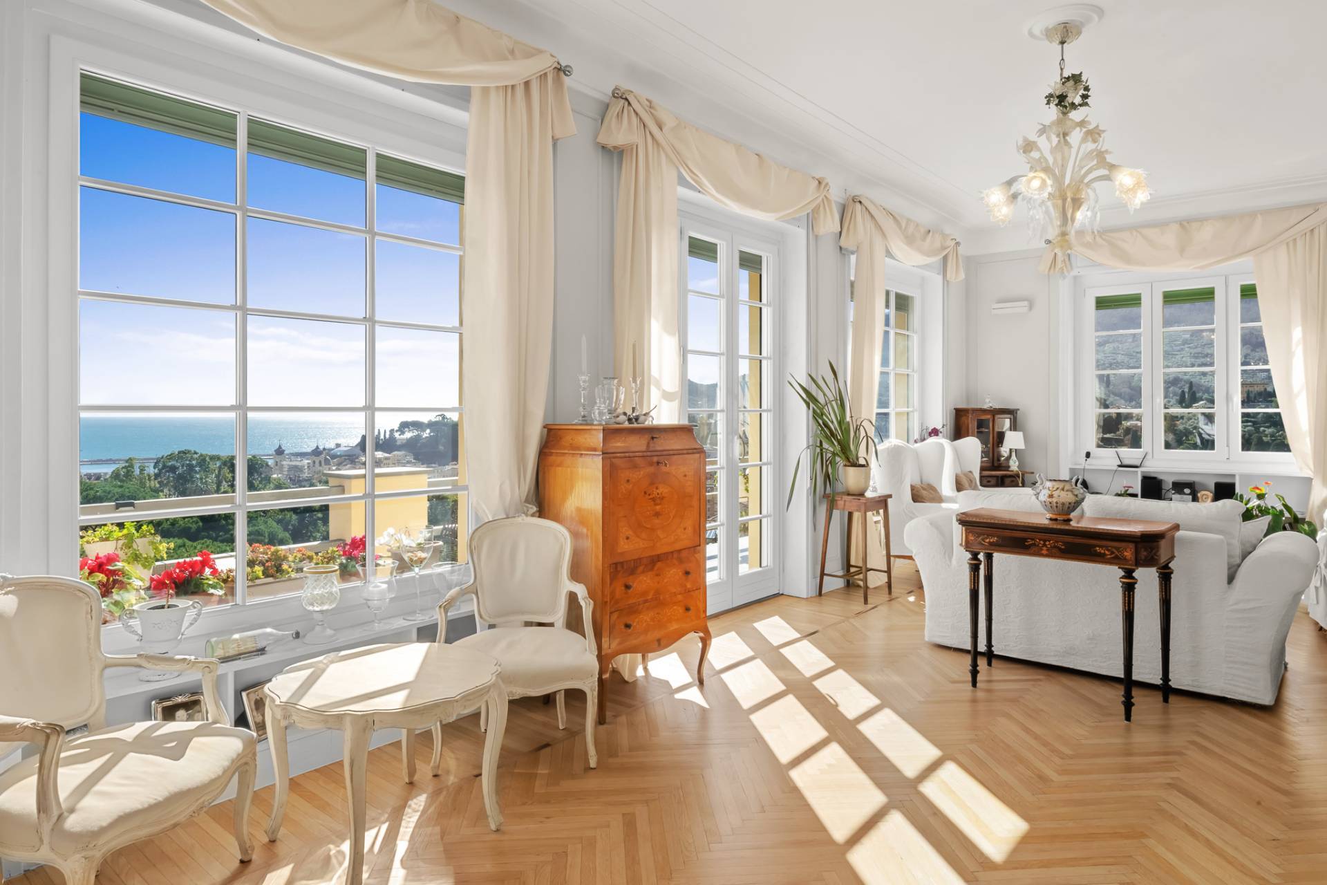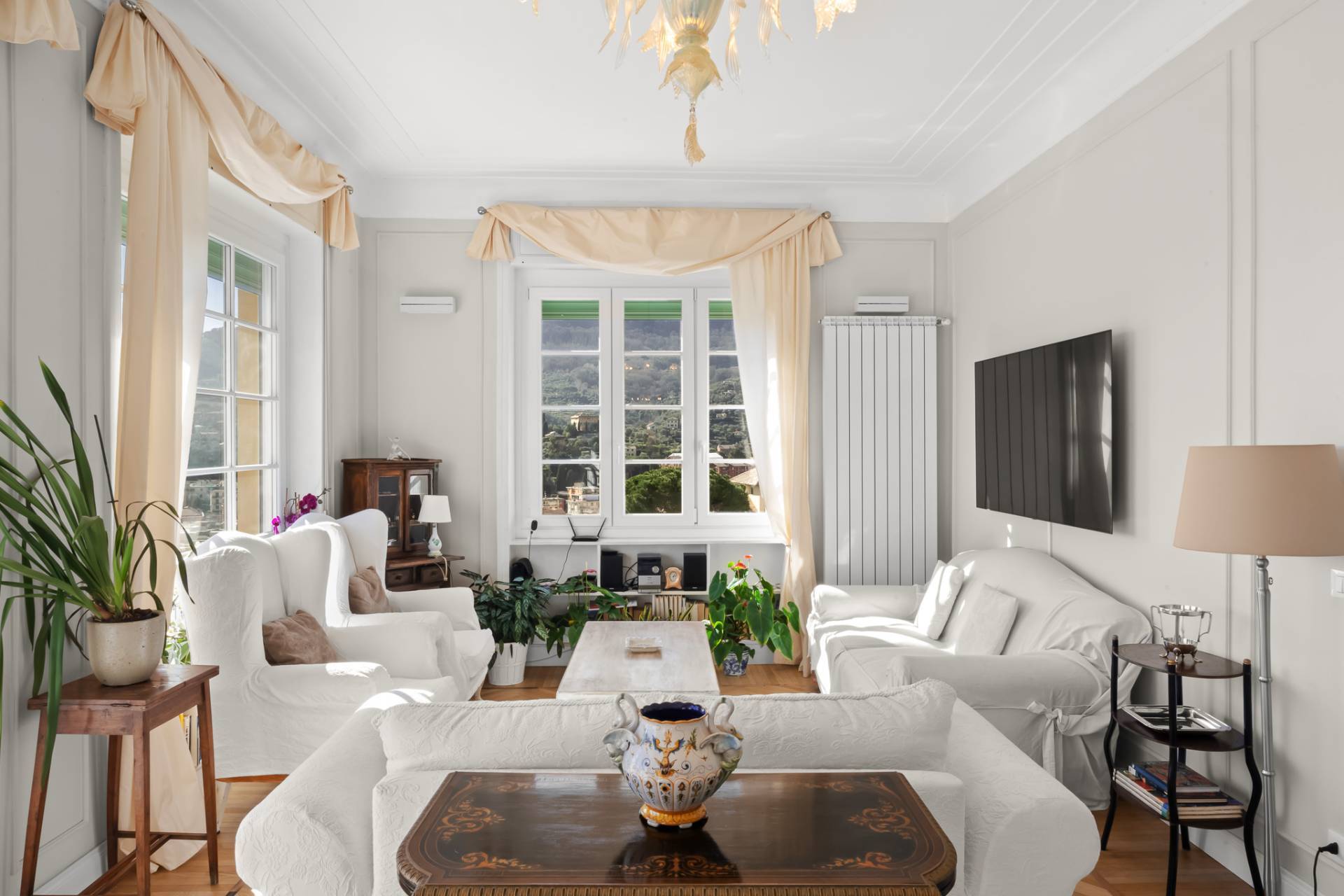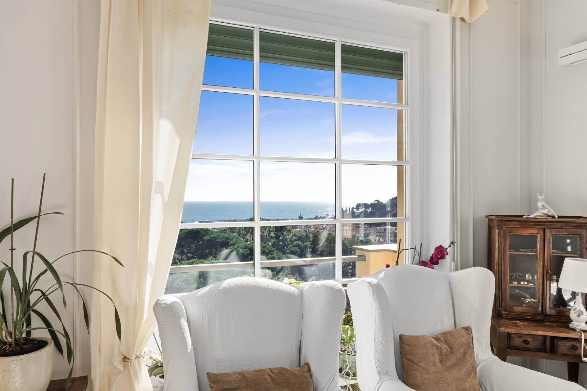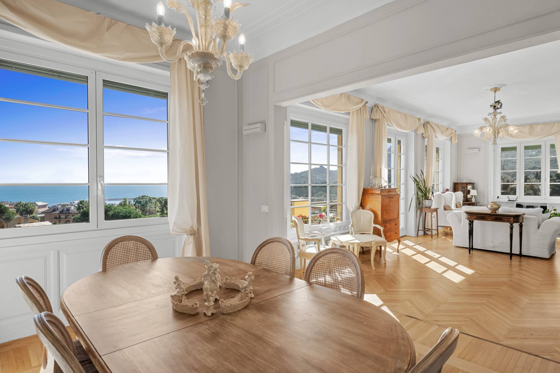 Ledificio, costruito nei primi anni 40 su progetto dellarchitetto razionalista Ignazio Gardella, conserva leleganza delle linee originarie ed stato oggetto di un attento intervento di riqualificazione delle facciate nel 2023. Larrivo gi unesperienza: lascensore conduce direttamente allinterno dellabitazione, aprendo su un ingresso che accompagna con naturalezza verso il cuore della casa. Qui si sviluppa un salone triplo di grande rappresentanza, dove le ampie aperture incorniciano il mare e conducono al balcone panoramico.
