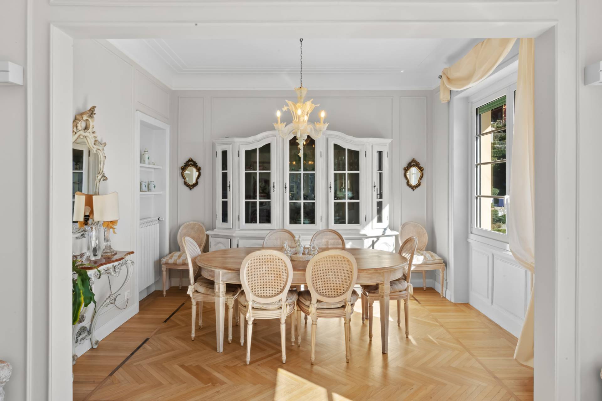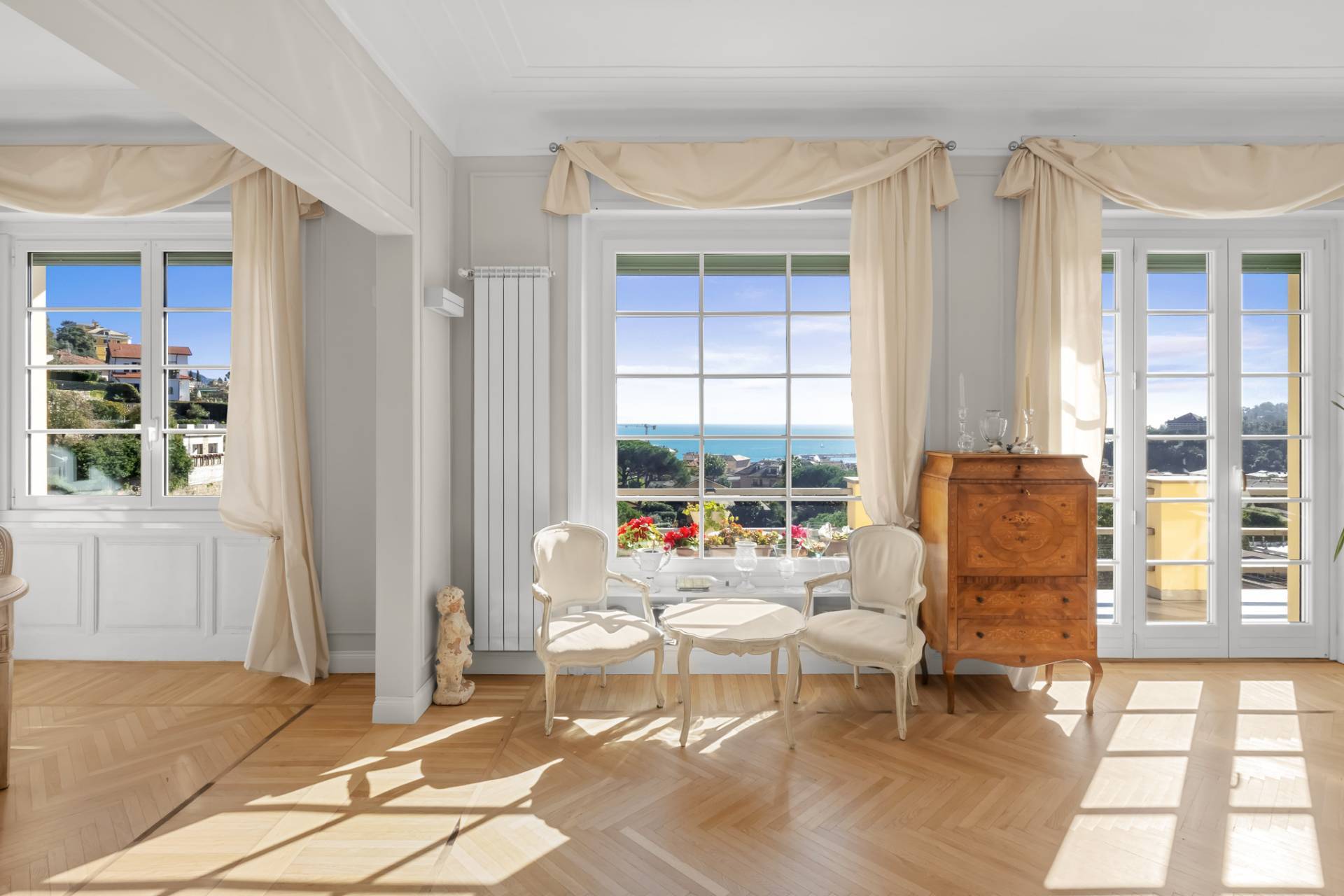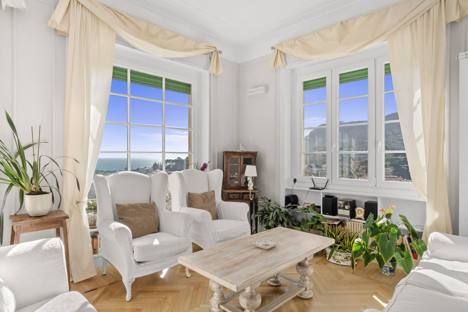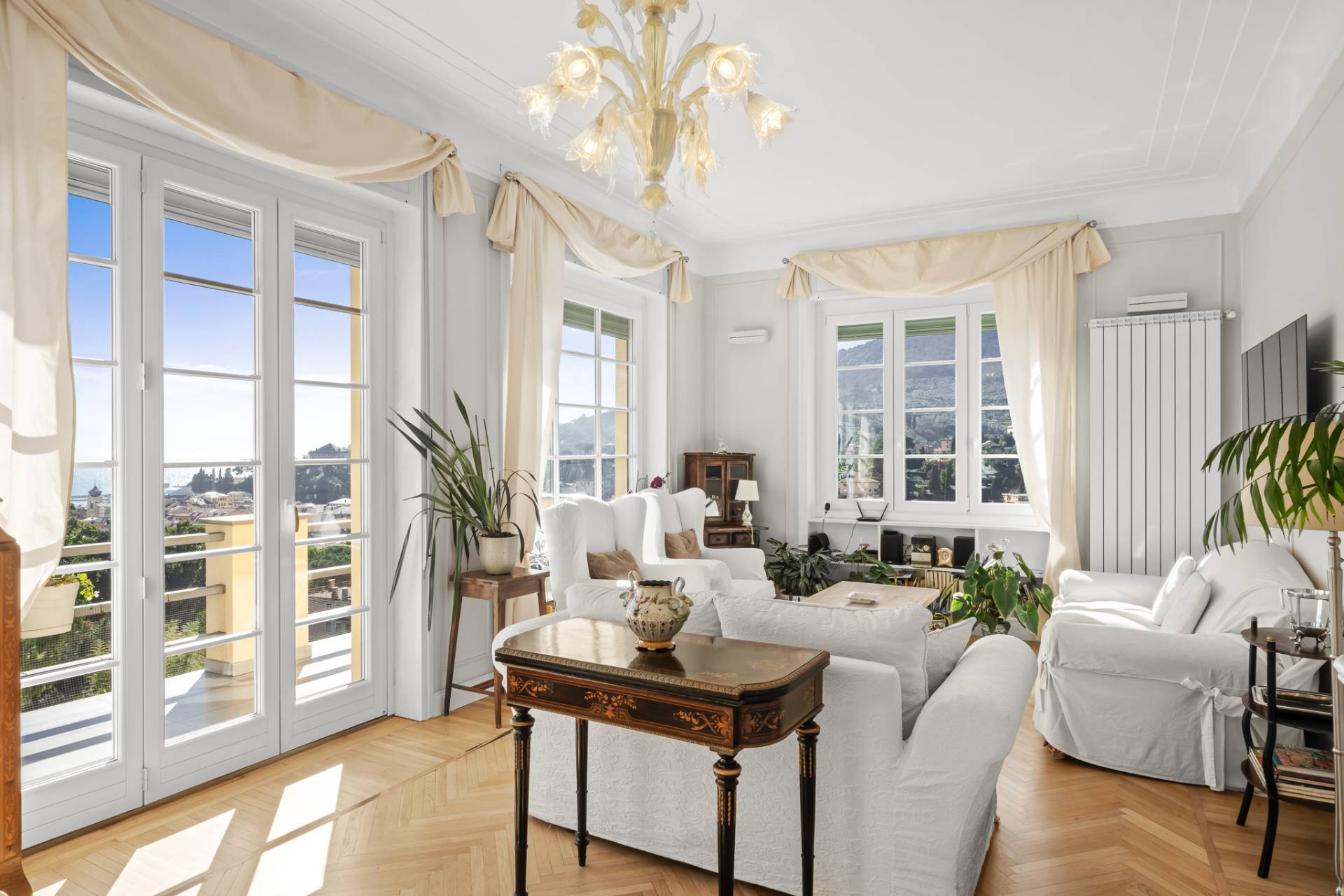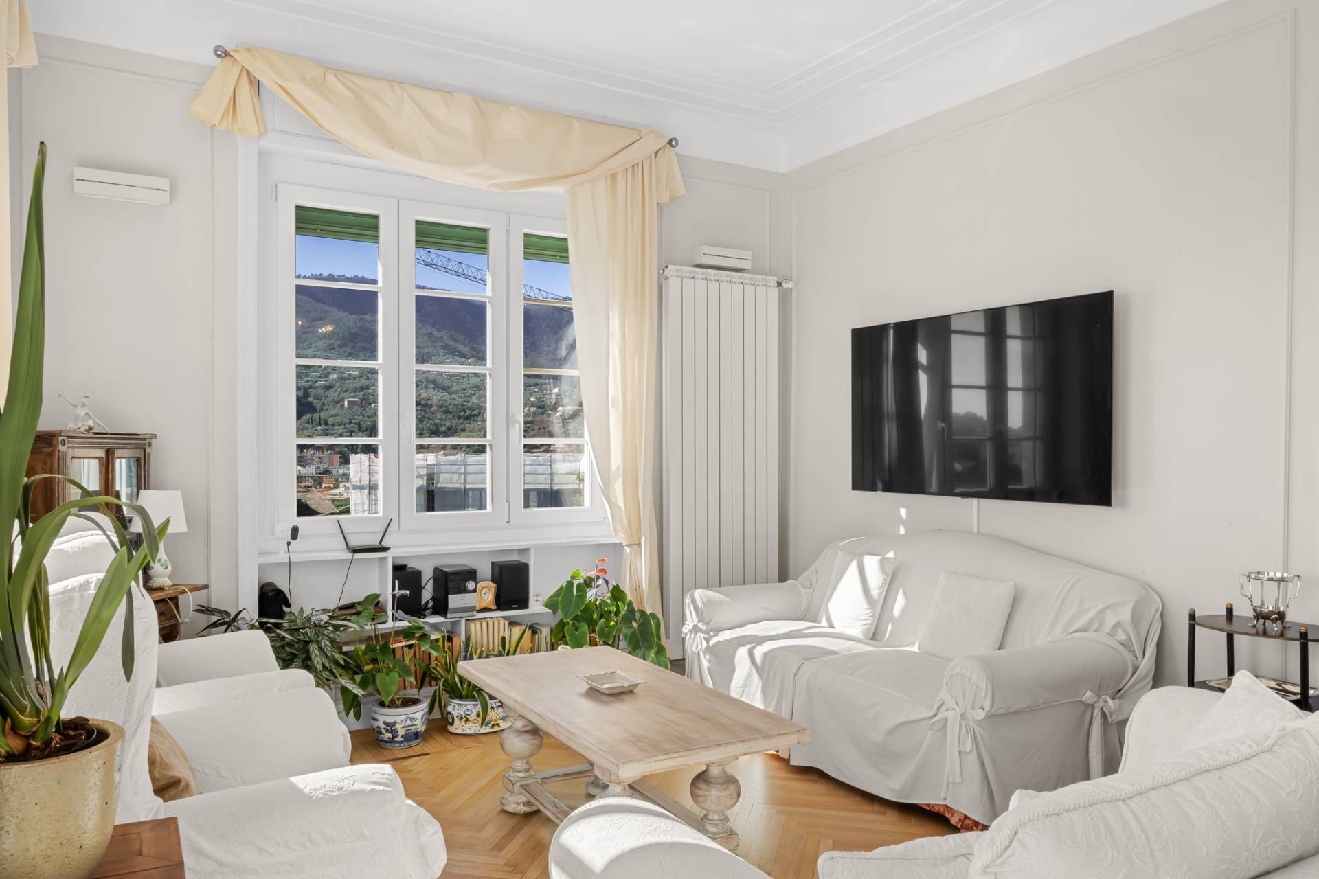Ledificio, costruito nei primi anni 40 su progetto dellarchitetto razionalista Ignazio Gardella, conserva leleganza delle linee originarie ed stato oggetto di un attento intervento di riqualificazione delle facciate nel 2023. Larrivo gi unesperienza: lascensore conduce direttamente allinterno dellabitazione, aprendo su un ingresso che accompagna con naturalezza verso il cuore della casa. Qui si sviluppa un salone triplo di grande rappresentanza, dove le ampie aperture incorniciano il mare e conducono al balcone panoramico.