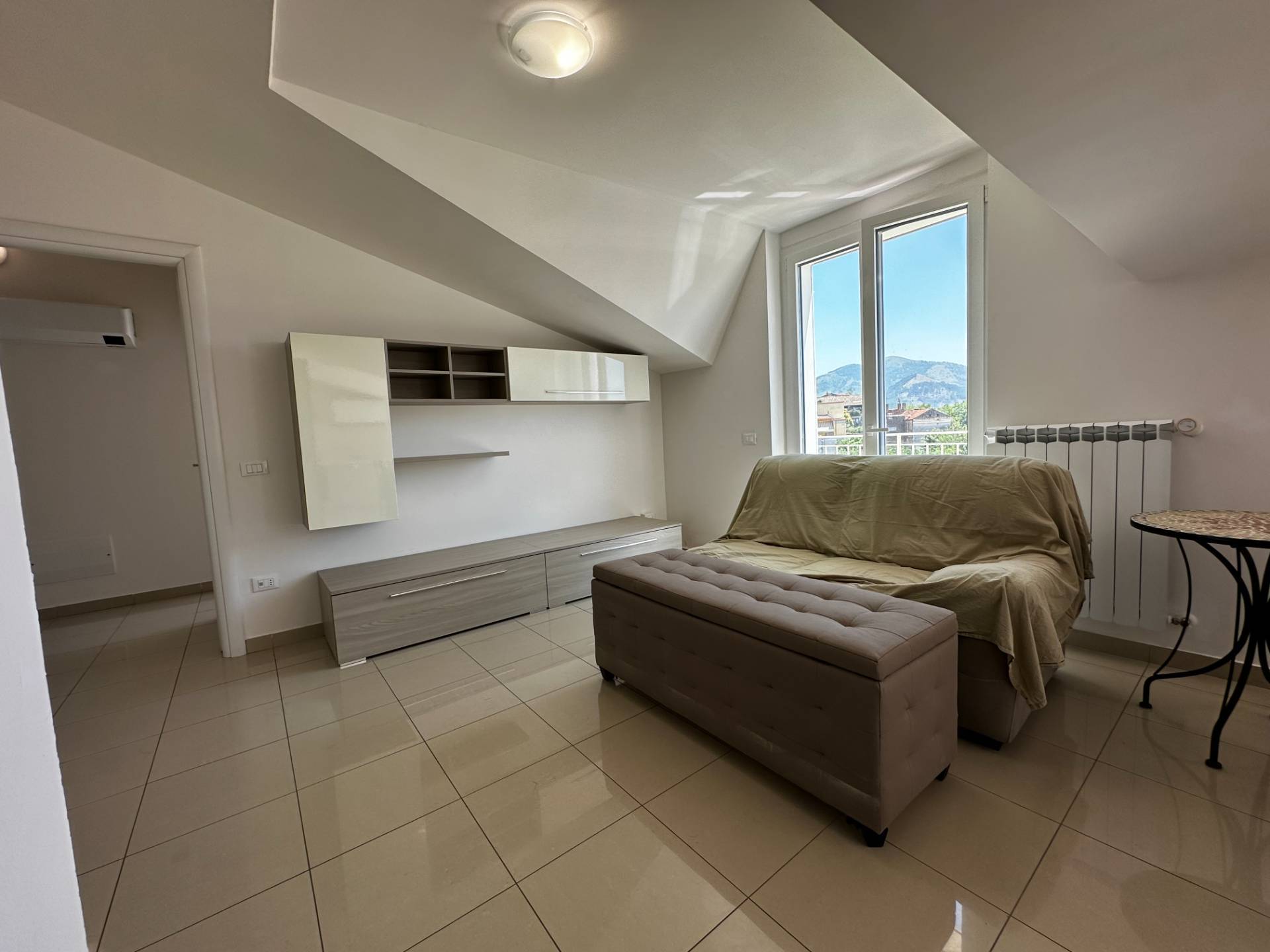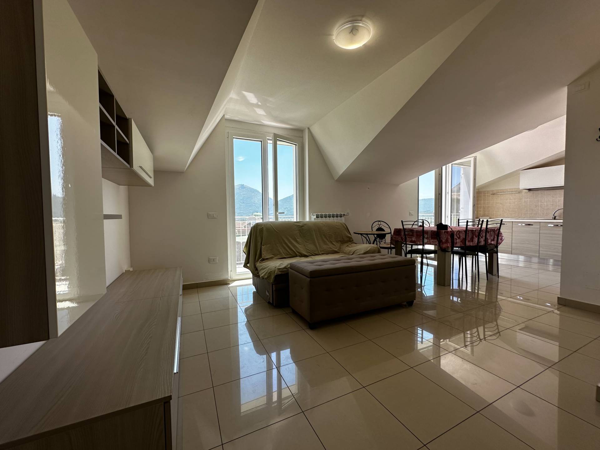 L' appartamento composto da tre locali, di cui due camere da letto, un bagno ed una luminosissima zona living con cucina a vista.