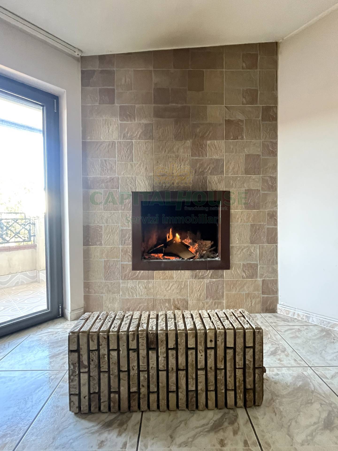Lingresso apre su un ampio salone con camino, ambiente caldo e accogliente, ideale per la vita quotidiana e per ricevere ospiti.