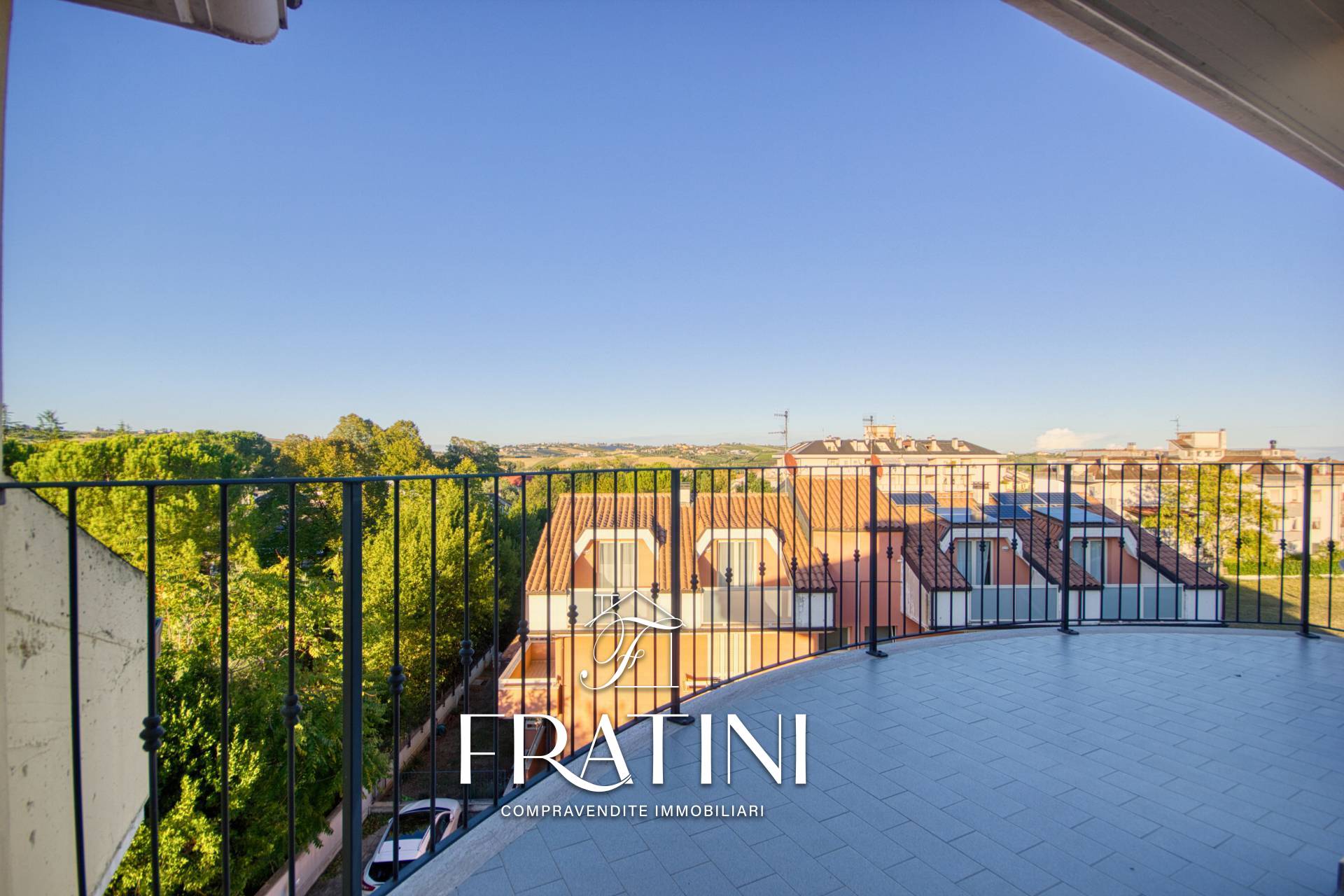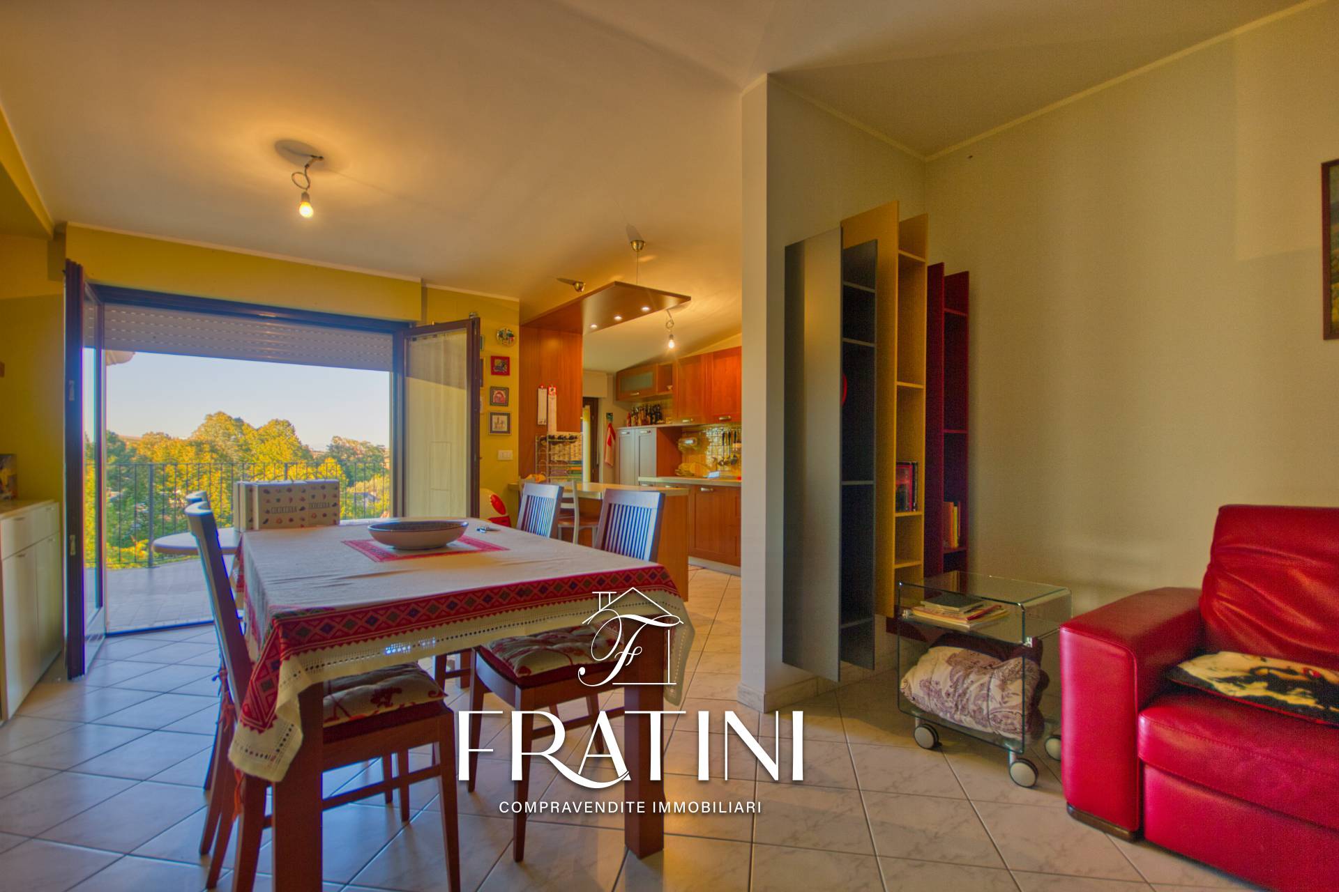Lingresso si apre su unampia e luminosa zona giorno con angolo cottura, dalla quale si accede a una terrazza panoramica molto spaziosa.