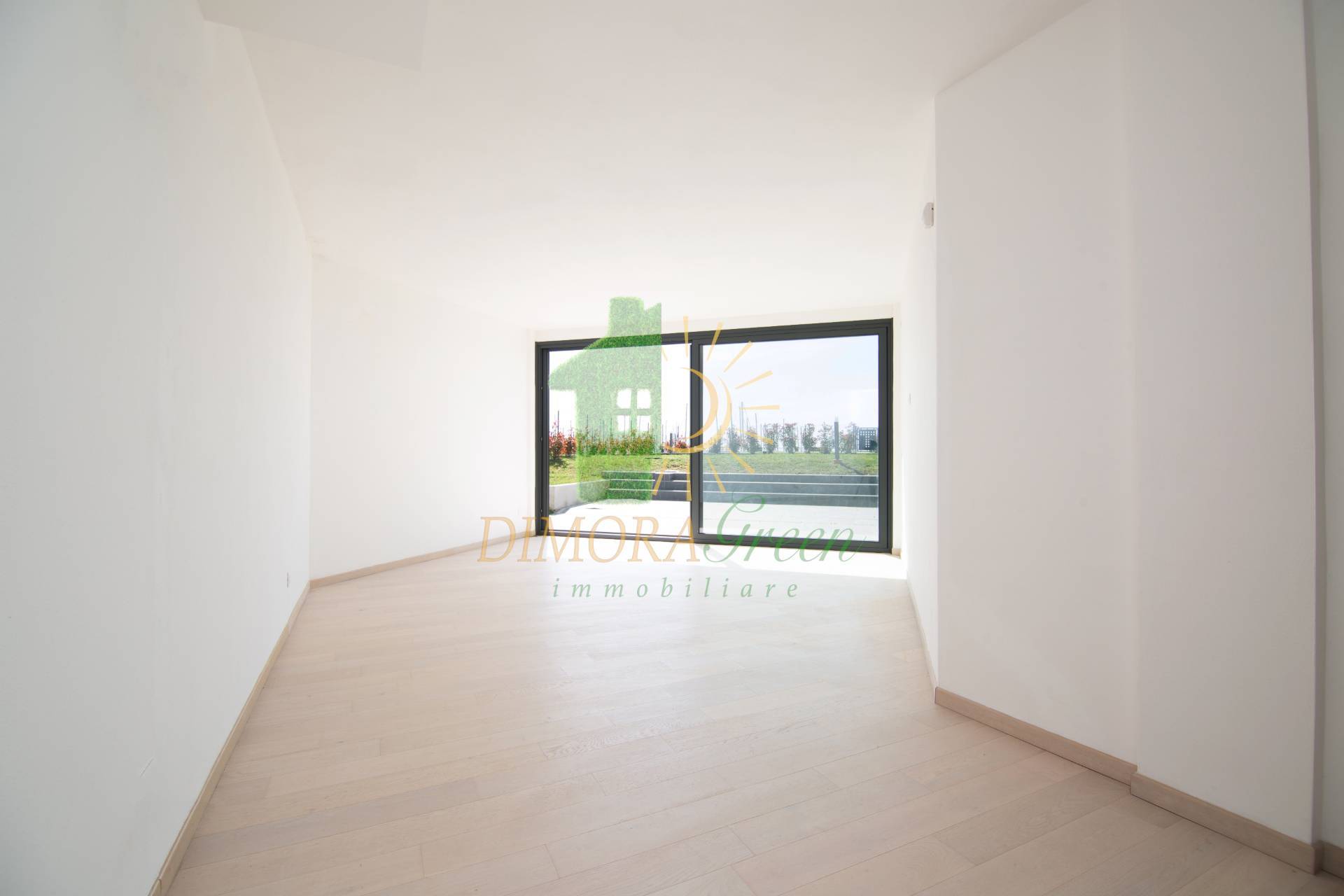 La zona giorno si affaccia su un paicevole spazio esterno rpivato, parzialmente abidito a giardino e parzialmente coperto da un portico ideale per i momenti di relax all'aria aperta.