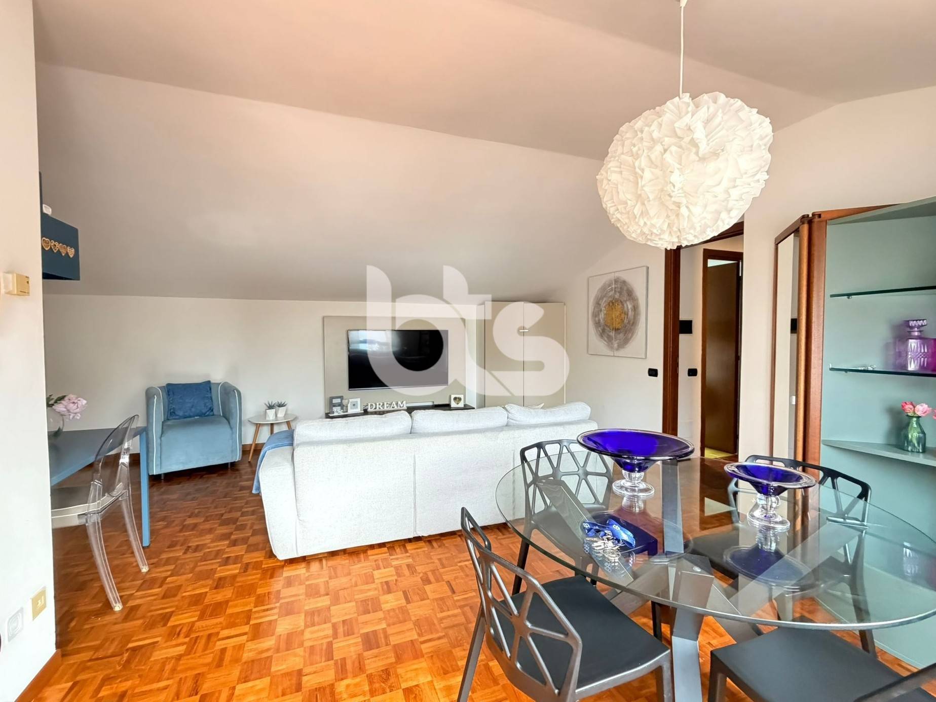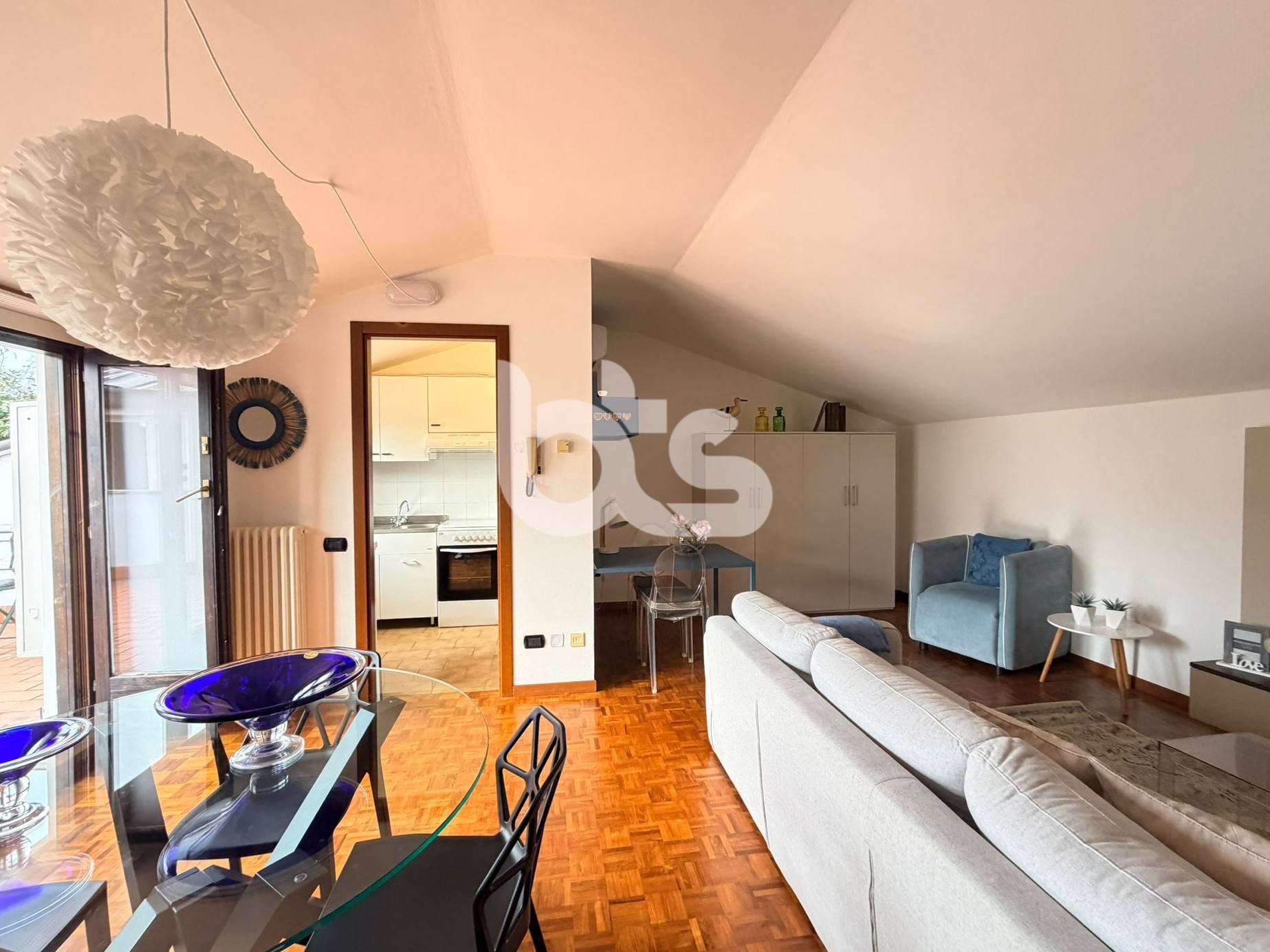 Allinterno, lappartamento si apre su un soggiorno molto luminoso, valorizzato dal calore del soffitto mansardato e completato da un cucinotto separato, pratico e ben organizzato.