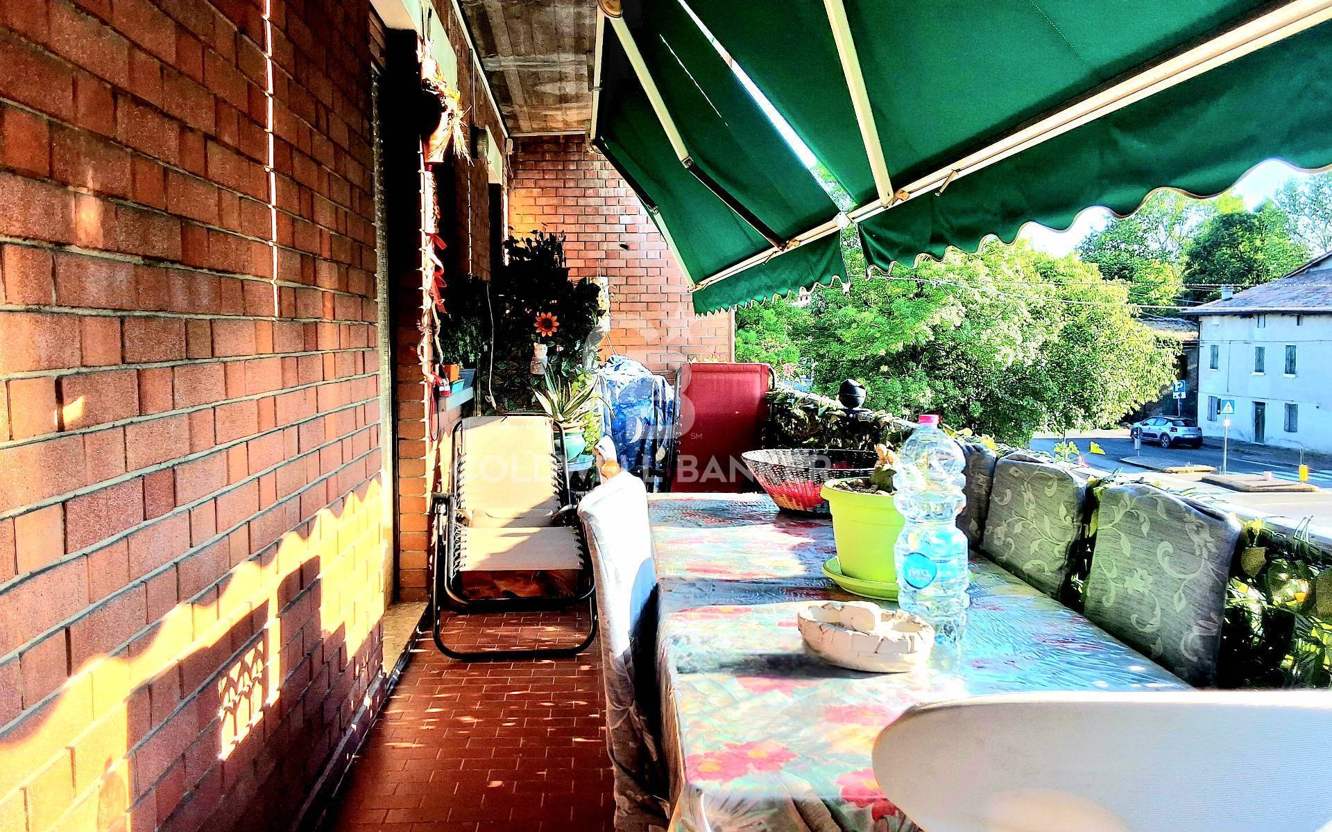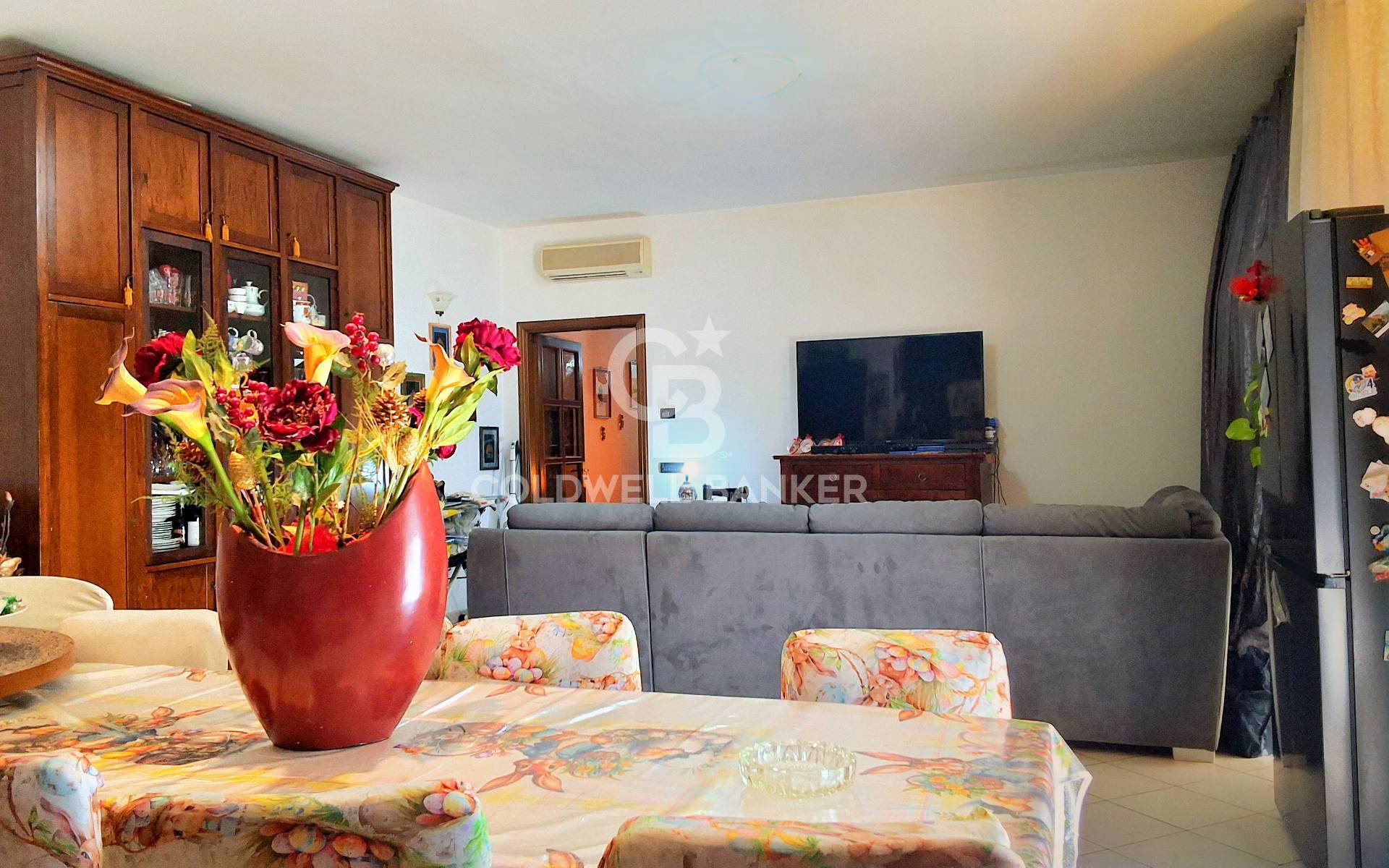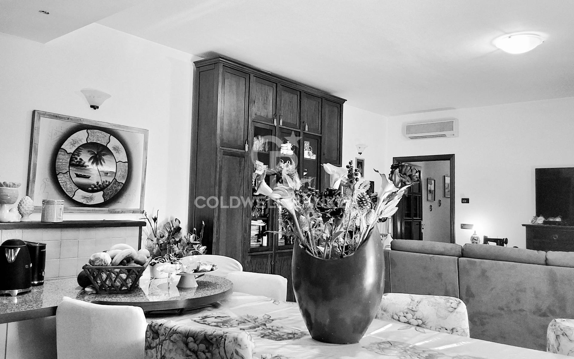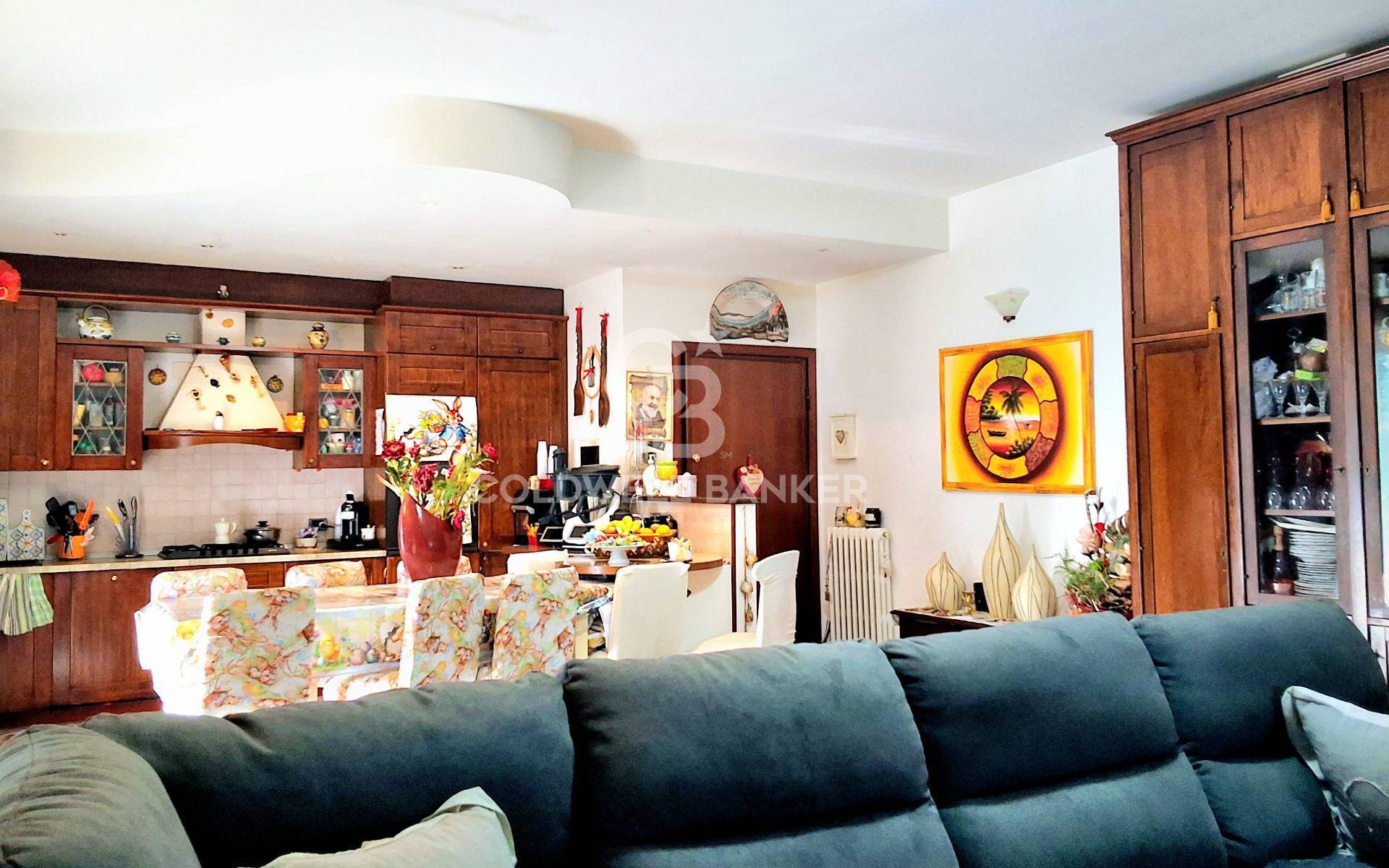 Ingresso su ampio soggiorno con cucina a vista con doppio accesso al balcone abitabile con tendone, zona notte con tre camere di cui due matrimoniali e una singola, due bagni di cui uno finestrato.