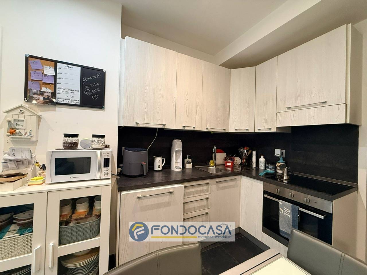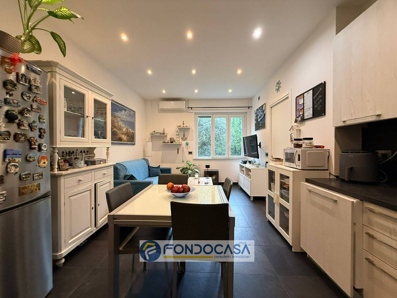 In ingresso unaccogliente zona giorno con cucina a vista che si affaccia direttamente su un grazioso giardino: il verde esterno diventa subito parte della scena quotidiana, donando unatmosfera rilassata e fresca.