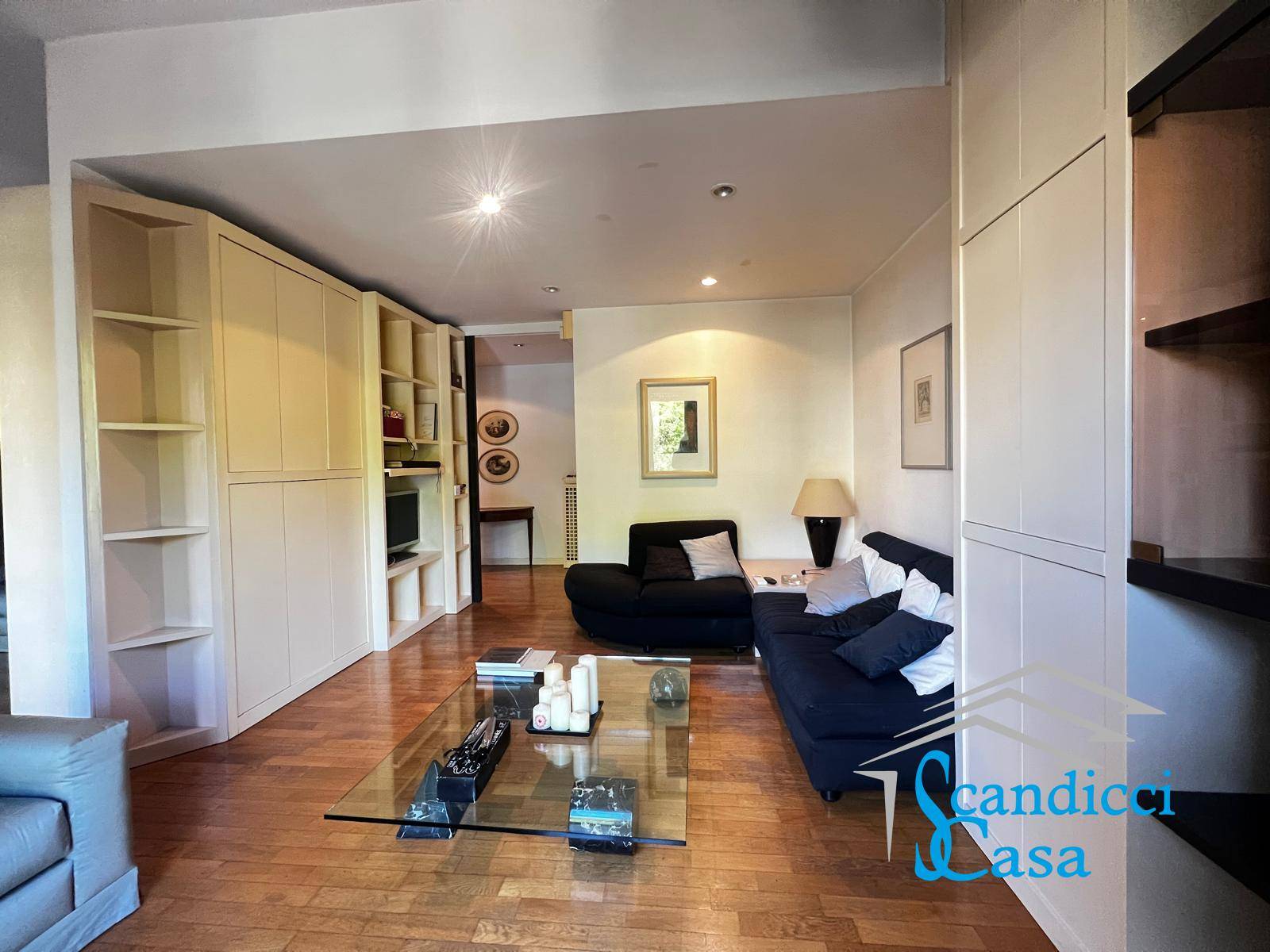 L'immobile si compone di un ampio ingresso da cui si accede a un doppio soggiorno molto accogliente rifinito con particolari armadiature e librerie, con accesso al terrazzo.