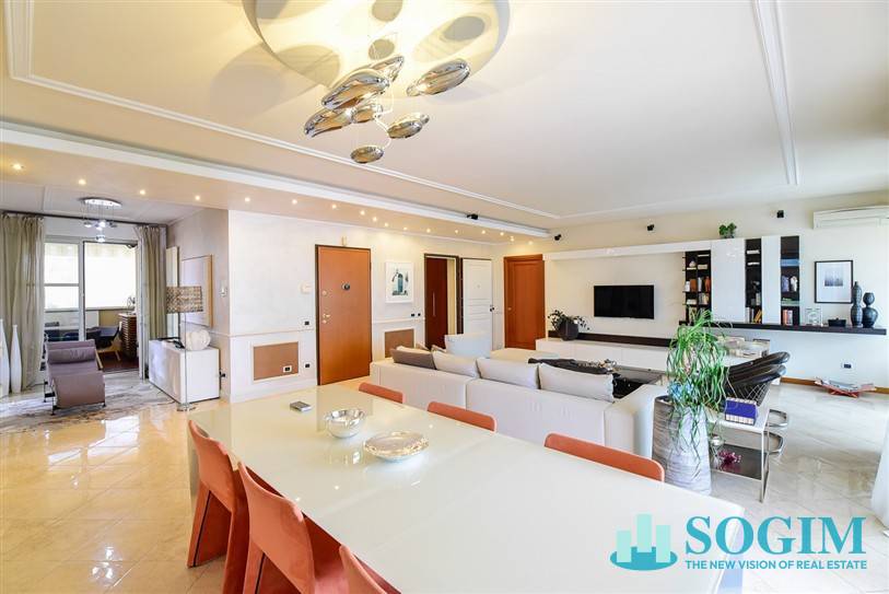 L'abitazione si caratterizza per l'ampiezza dei locali e per l'utilizzo di rifiniture e materiali pregiati: pavimentazione in parquet tipo rovere nella zona notte, nella zona giorno in piastrelle di "Versace Ceramics" che esalta l'eleganza degli ambienti; infissi in legno con doppio vetro, impianto di riscaldamento autonomo, di condizionamento con split a parete e di allarme volumetrico e perimetrale.