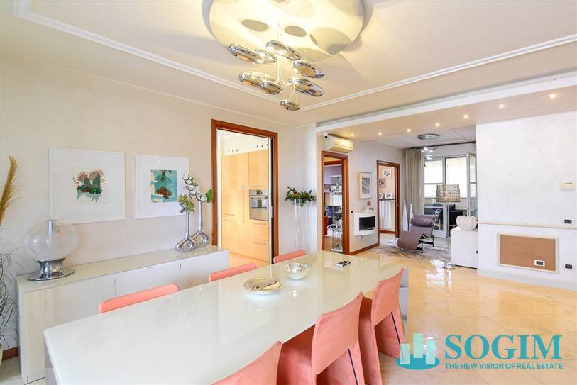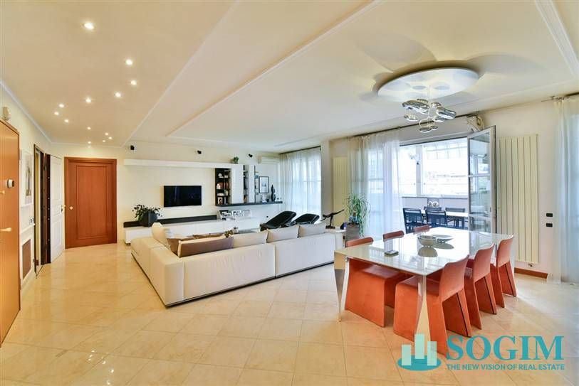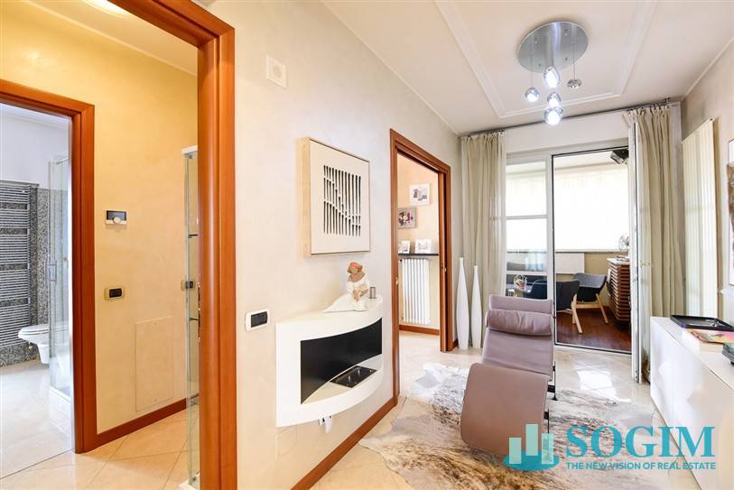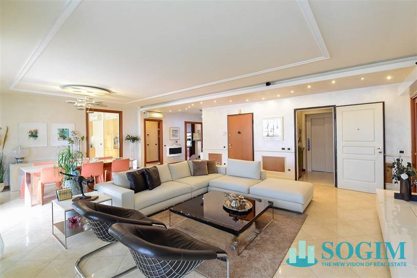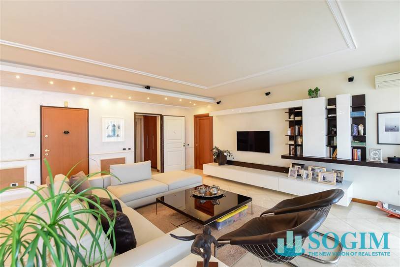 L'abitazione si caratterizza per l'ampiezza dei locali e per l'utilizzo di rifiniture e materiali pregiati: pavimentazione in parquet tipo rovere nella zona notte, nella zona giorno in piastrelle di "Versace Ceramics" che esalta l'eleganza degli ambienti; infissi in legno con doppio vetro, impianto di riscaldamento autonomo, di condizionamento con split a parete e di allarme volumetrico e perimetrale.