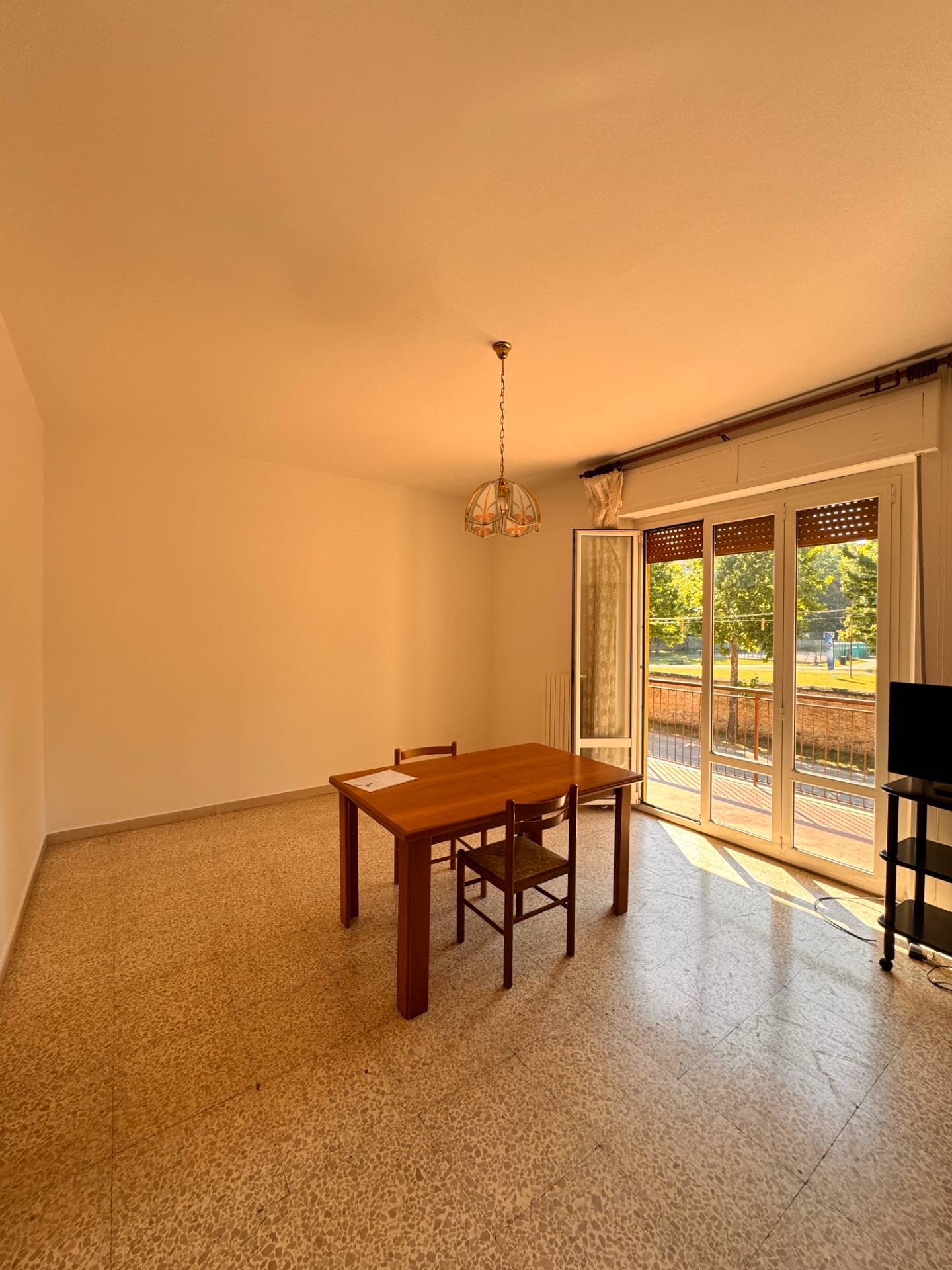 La sala ha un balcone di otto metri che affaccia sul bellissimo parco della Pace del paese.