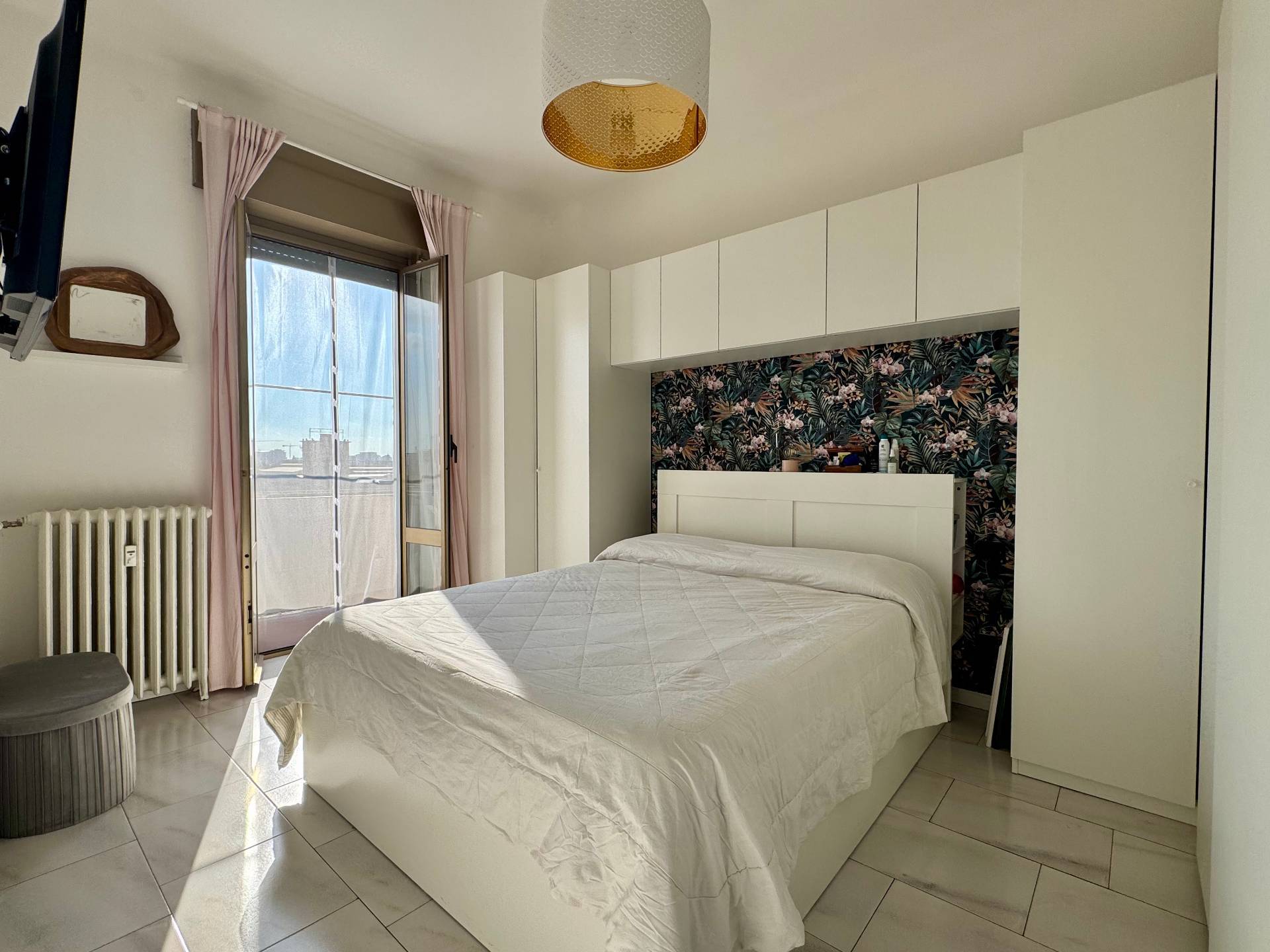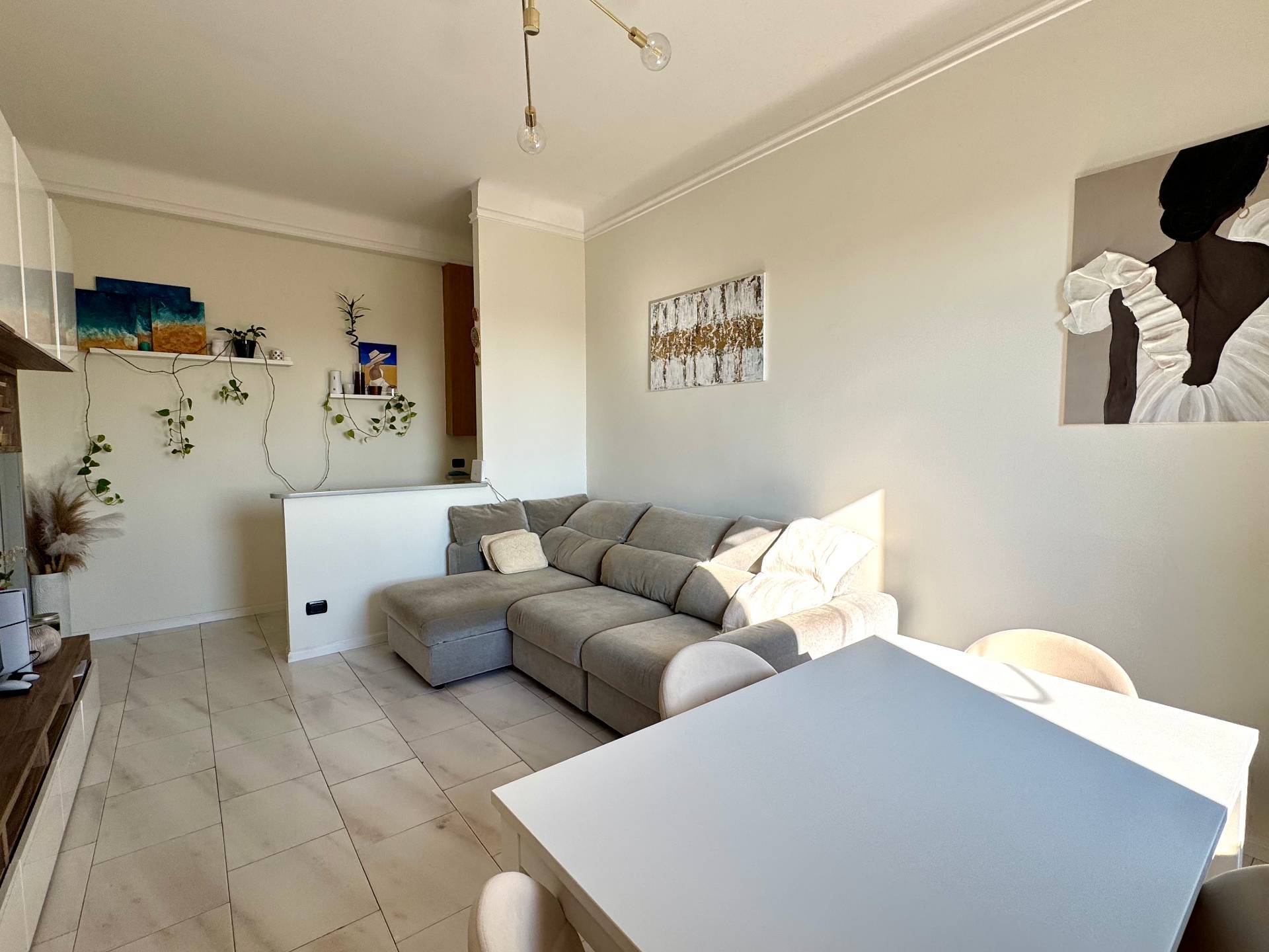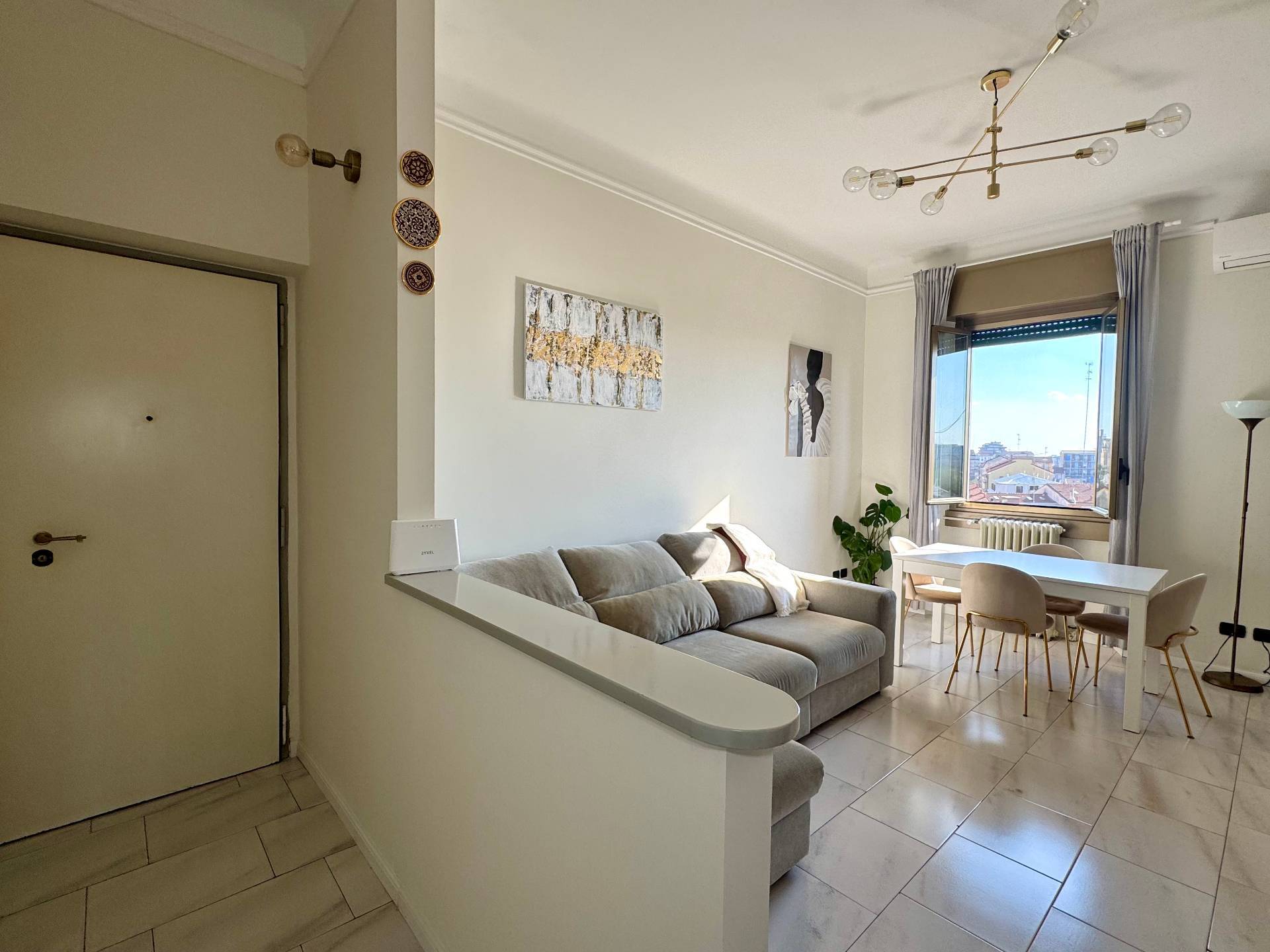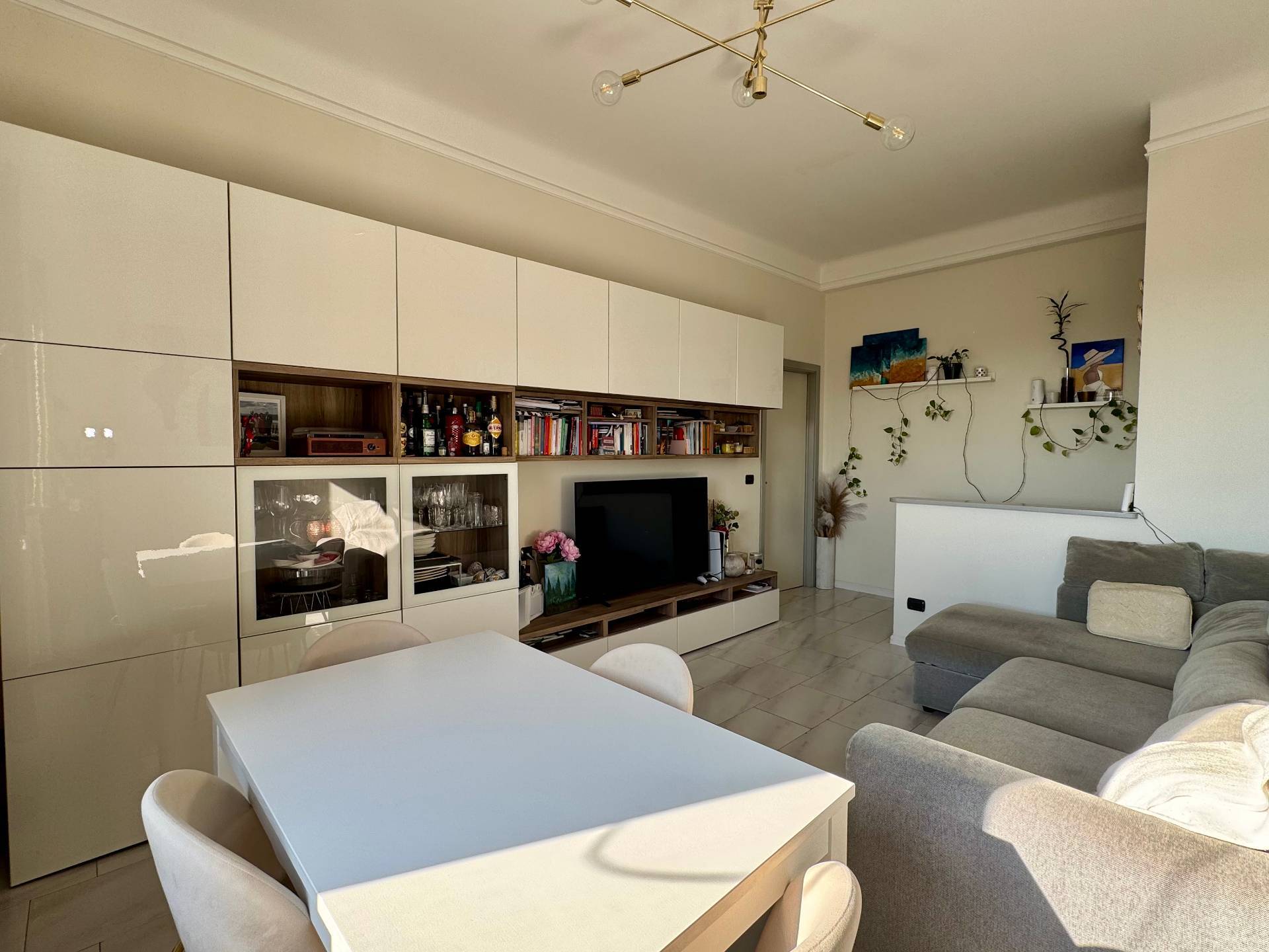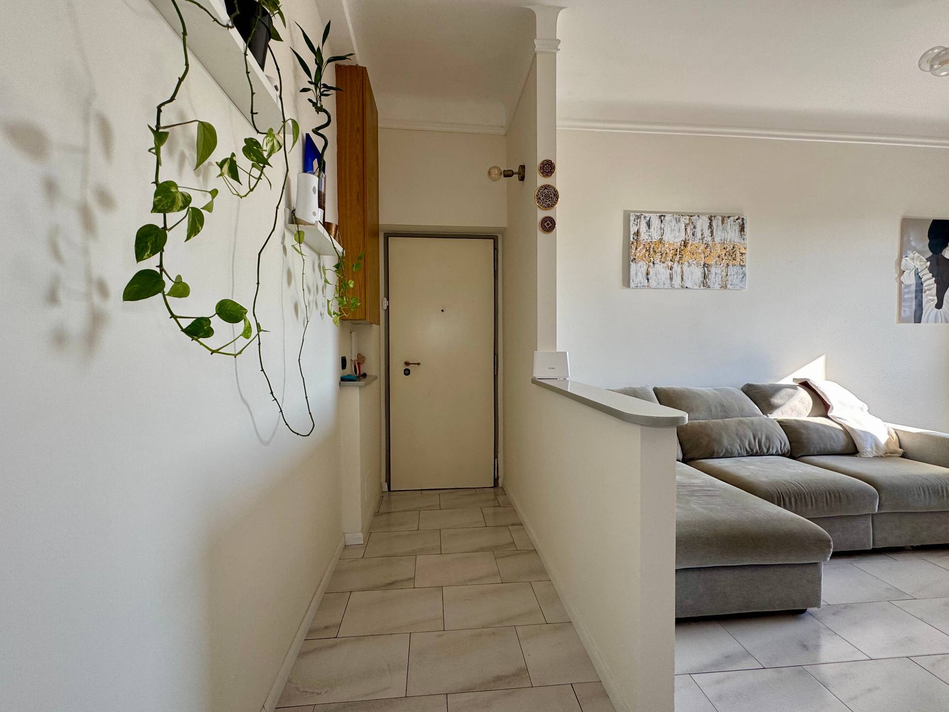 Accedendo dalla porta blindata troviamo lo spazioso soggiorno (20 mq ca). Dal disimpegno, dove troviamo un comodo armadio a muro utilizzato come ripostiglio, possibile raggiungere la spaziosa cucina, ove poter collocare un tavolo, la camera matrimoniale (che gode di accesso al balcone angolare) ed il bagno con vasca (oggetto di recente e totale riqualificazione). La pavimentazione interamente in ceramica e gres porcellanato.