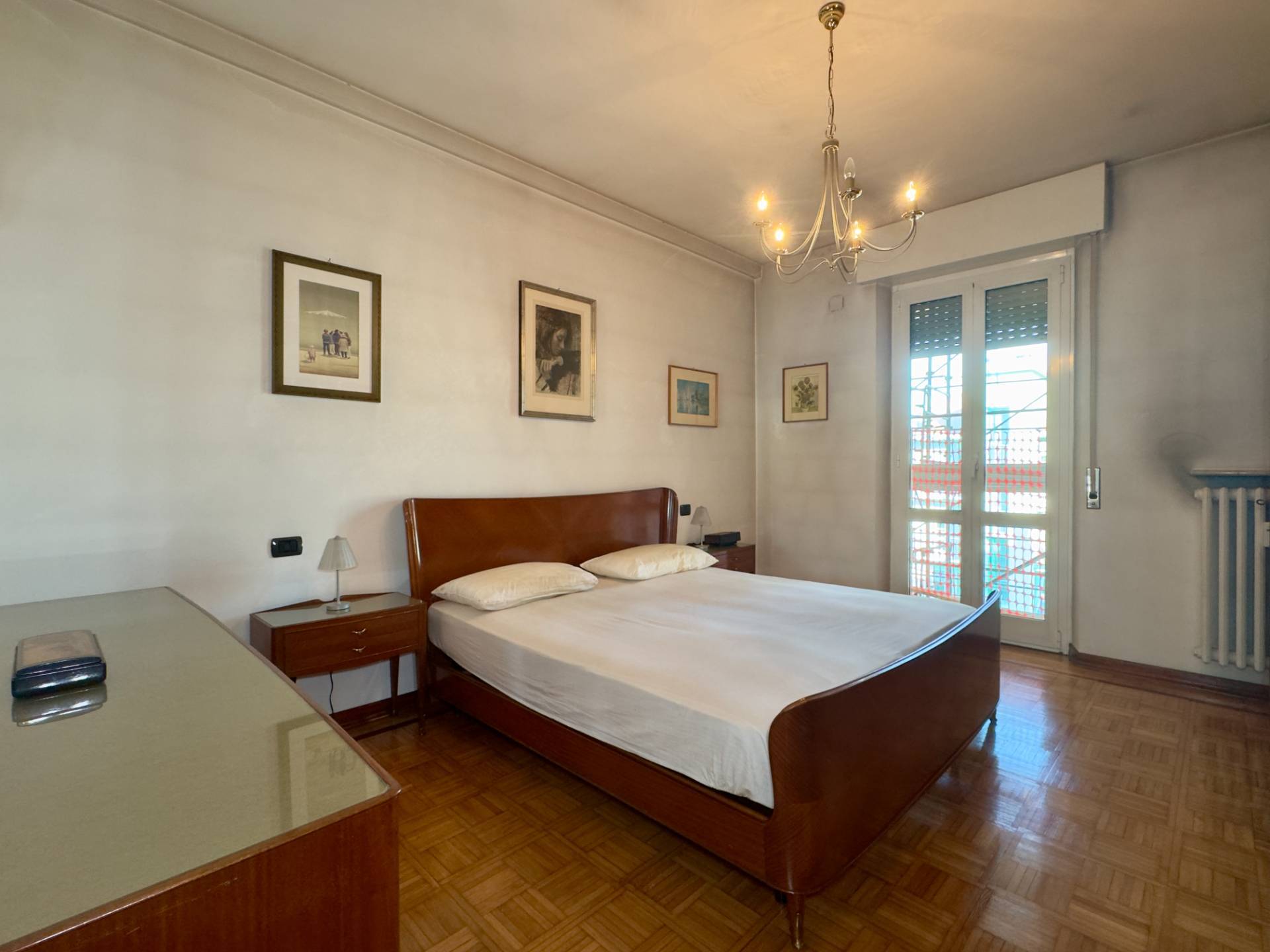 Il corridoio prosegue verso la camera matrimoniale, rifinita con parquet originale e servita da un balconcino riservato, e verso un pratico ripostiglio.
