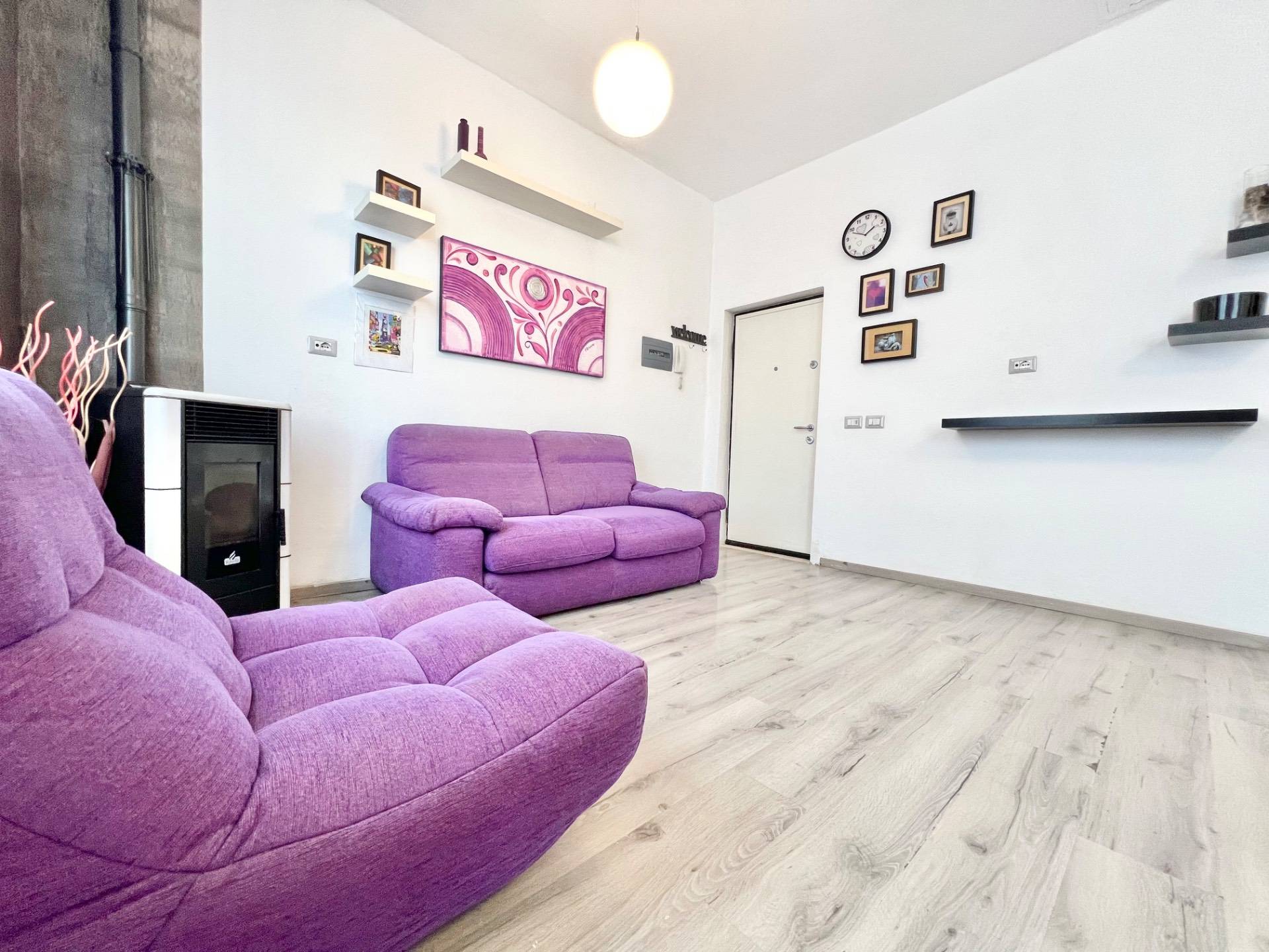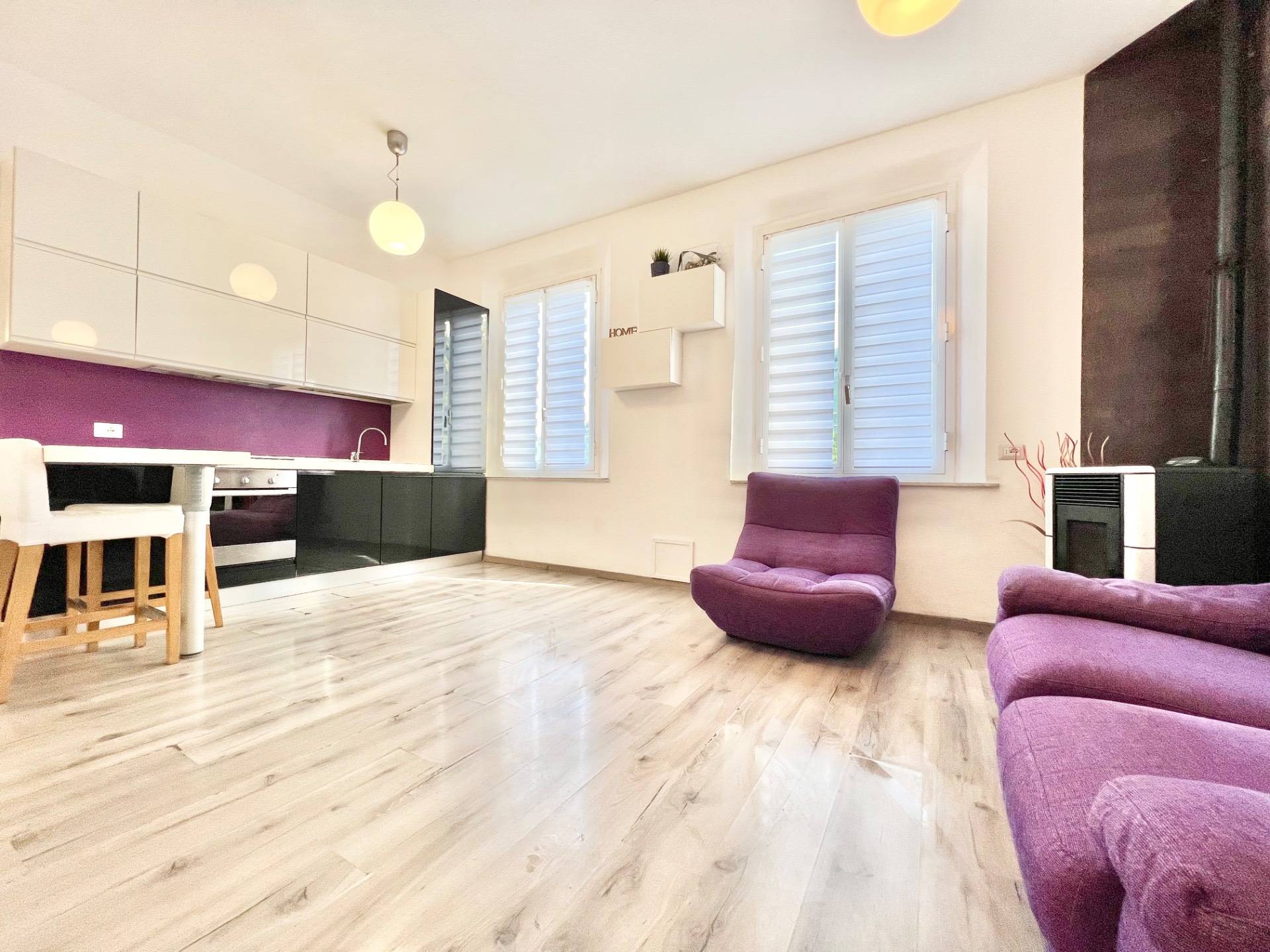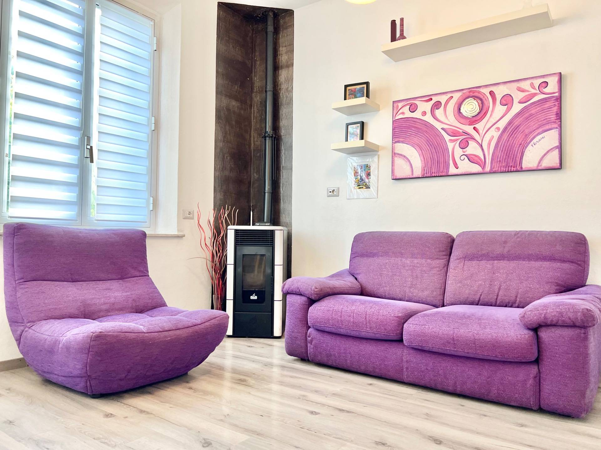 Limmobile si apre su un accogliente open space dove convivono armoniosamente la zona soggiorno e la cucina a vista, arricchita dalla presenza di una stufa a pellet, ideale per creare unatmosfera calda e confortevole nelle stagioni pi fredde.