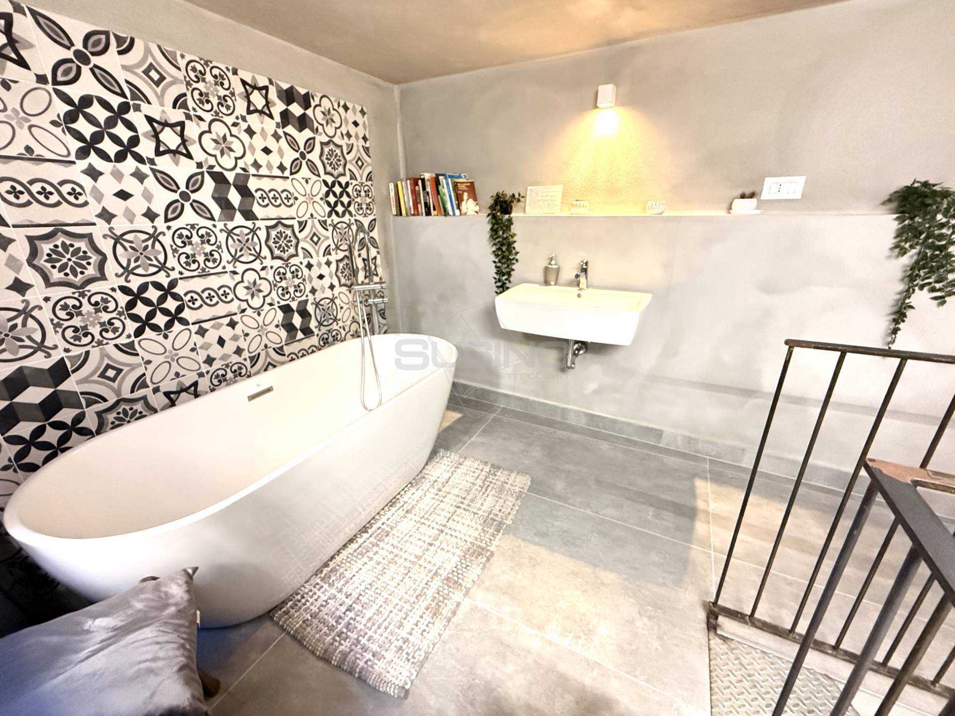 A seguire: il bagno, un cucinino disimpegnato e, al livello superiore, un area relax con vasca d'arredo.