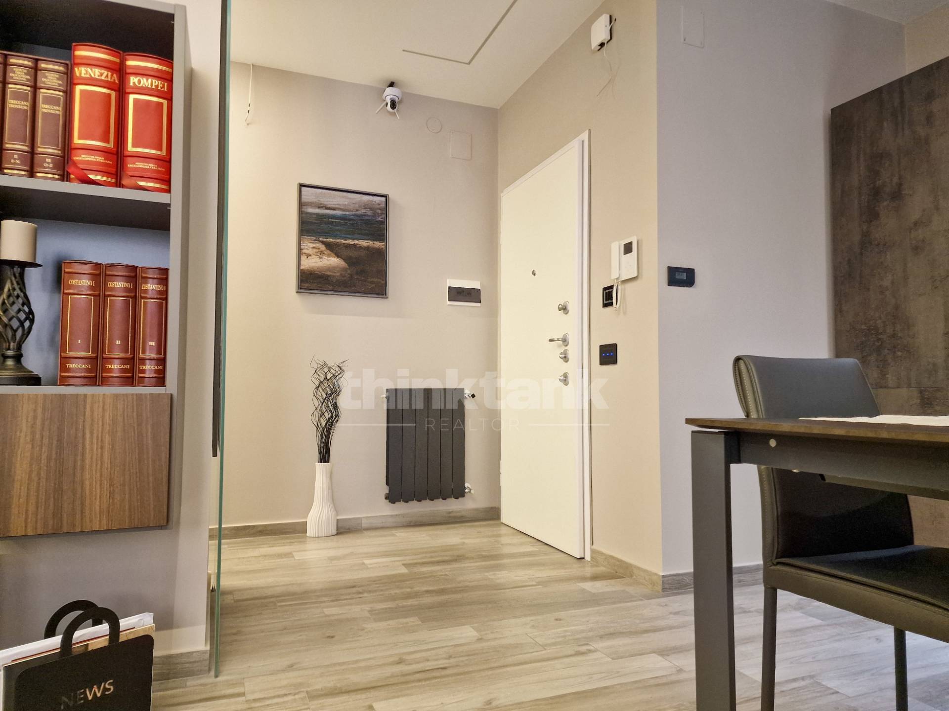 Internamente, l'appartamento stato sapientemente riprogettato con un design moderno che include illuminazione a LED incassata nel controsoffitto, creando un'atmosfera raffinata e accogliente.