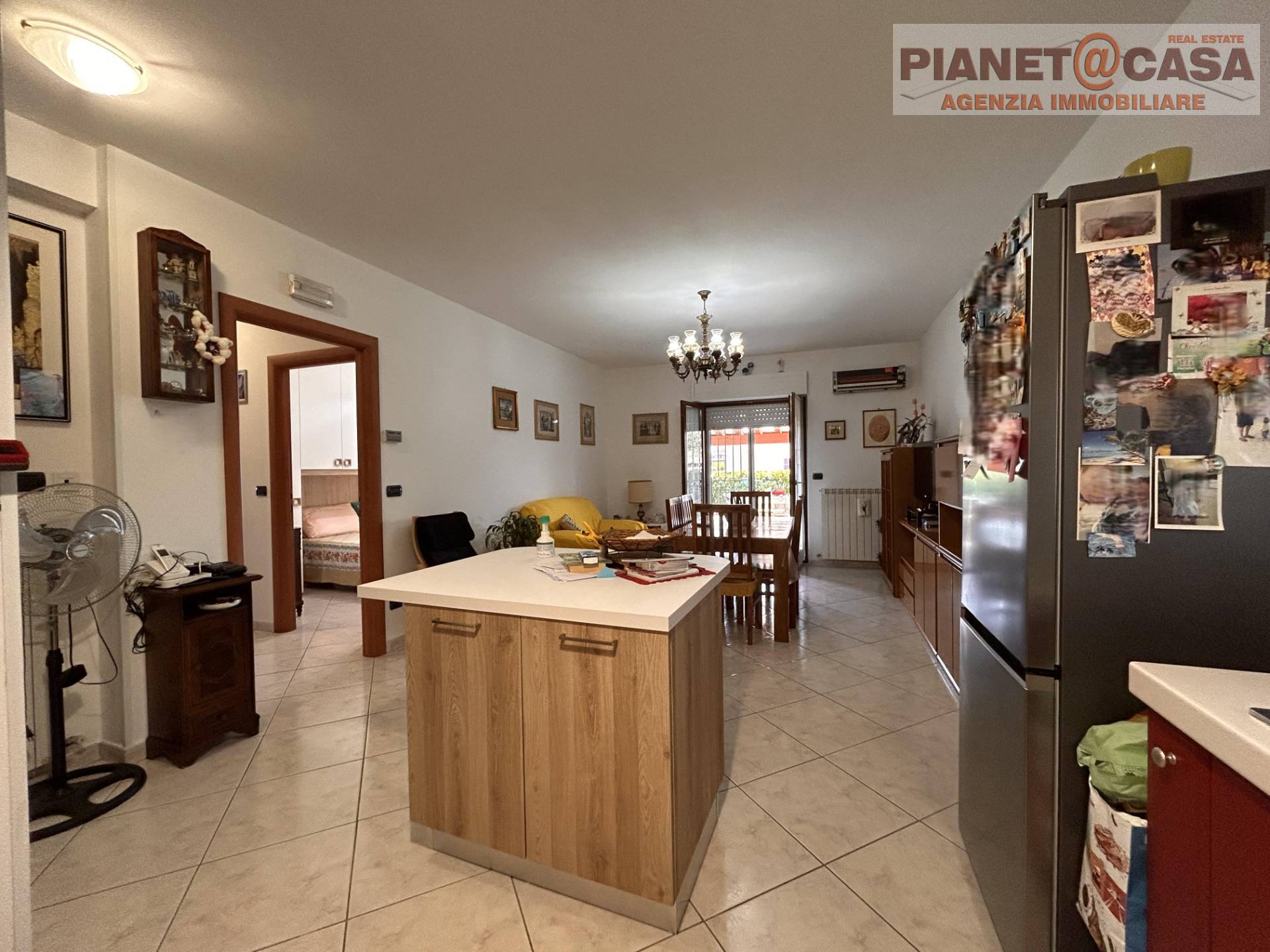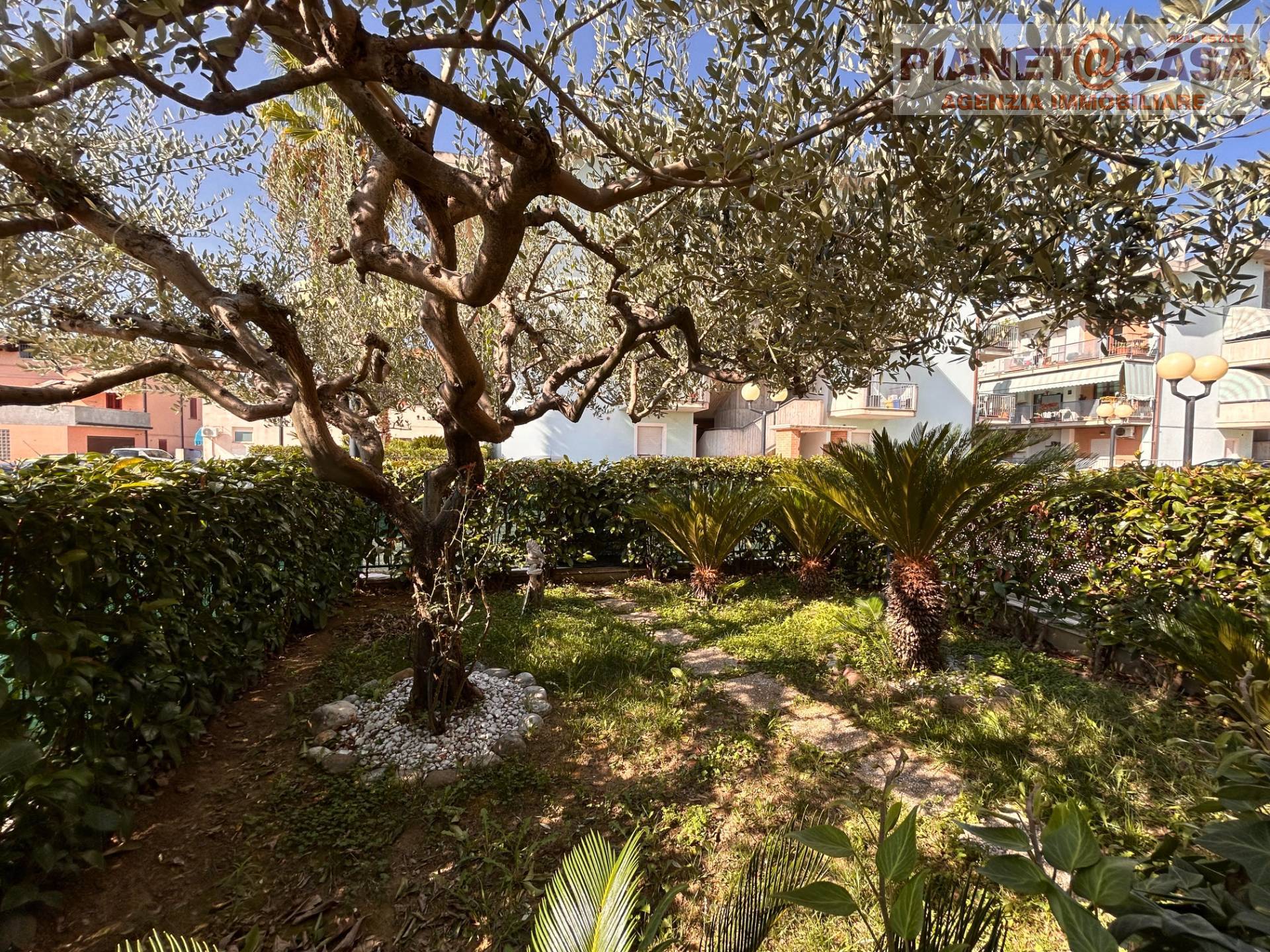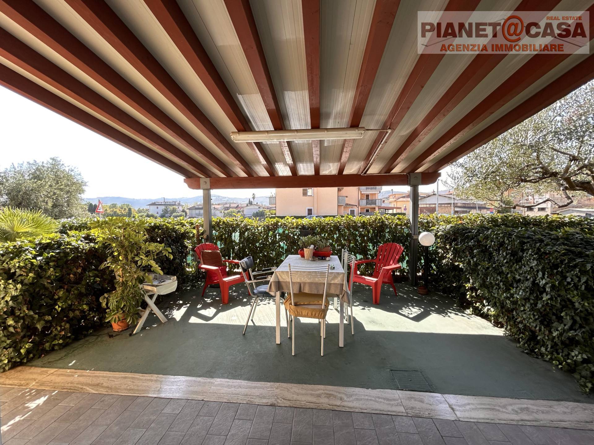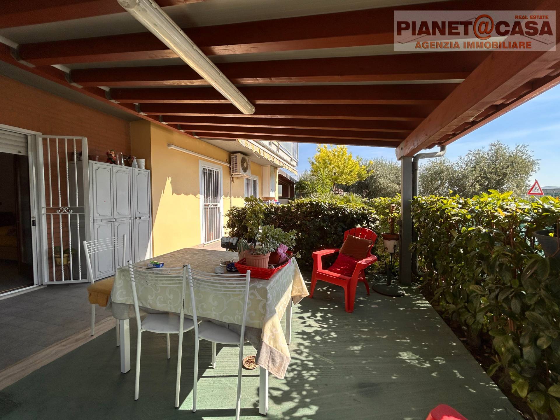 L' immobile, sito in palazzina di recente costruzione in ottimo stato di manutenzione, composto da ingresso su ampio soggiorno, cucina, disimpegno, due camere da letto, un bagno con box doccia, oltre ad una corte esterna esclusiva su tre lati, in parte pavimentata in parte a giardino con gazebo fisso e accesso carrabile.