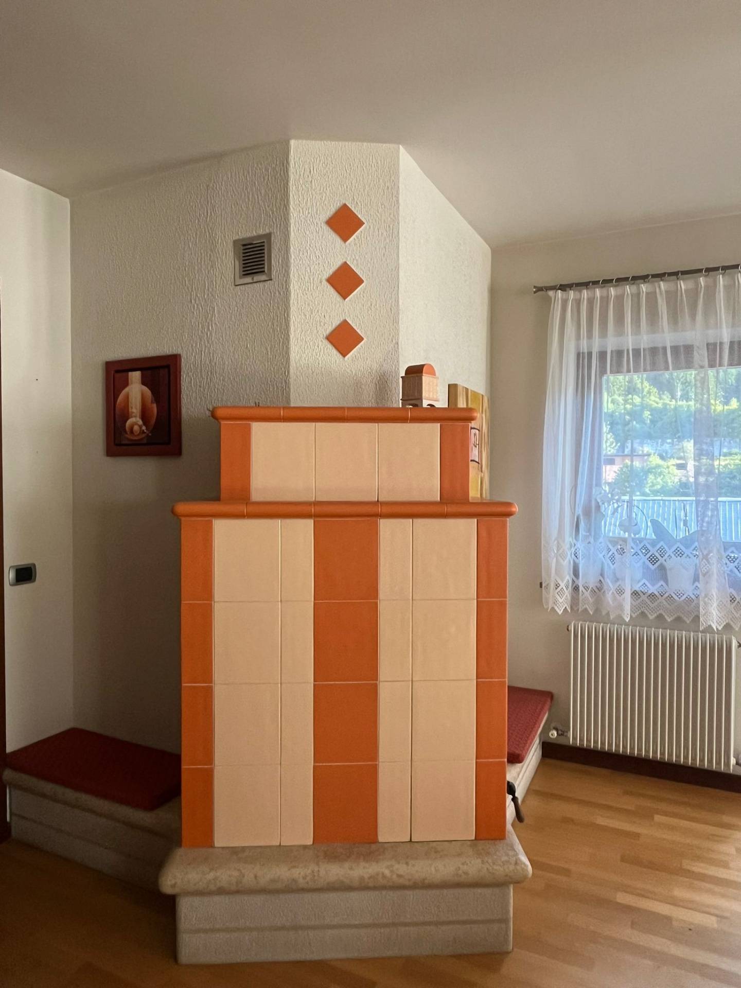 Situato al terzo piano di una palazzina, si sviluppa su due livelli: al piano inferiore troviamo lingresso, il soggiorno con bellissima stufa in maiolica, una ampia cucina abitabile e parzialmente arredata, un bagno finestrato, un salottino/studio, due camere da letto e tre terrazze; tramite una scala interna in legno si accede al piano superiore, dove troviamo il disimpegno con unulteriore ampia stanza e un secondo bagno, sempre finestrato.