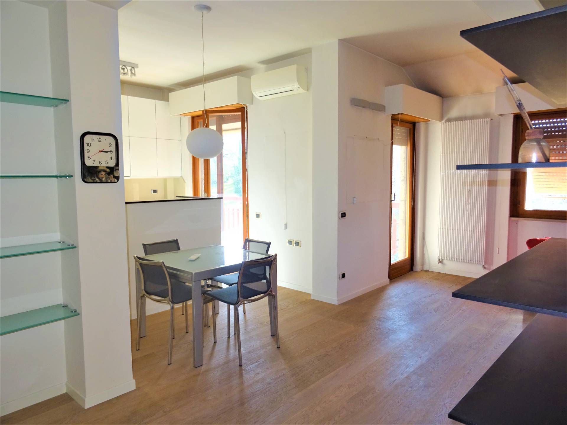 La zona giorno si sviluppa in un luminoso open space con cucina completa di elettrodomestici e lavastoviglie - tutto mai utilizzato e accesso a un terrazzo perimetrale, ma ampio, di circa 20 mq, che affaccia sul verde parco Le Grazie, vero valore aggiunto della propriet.