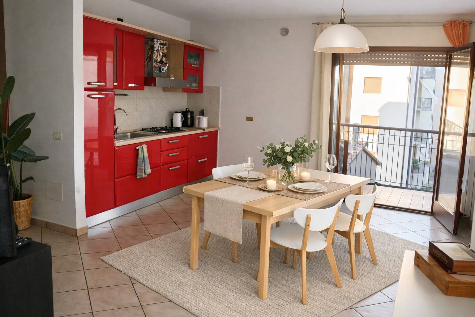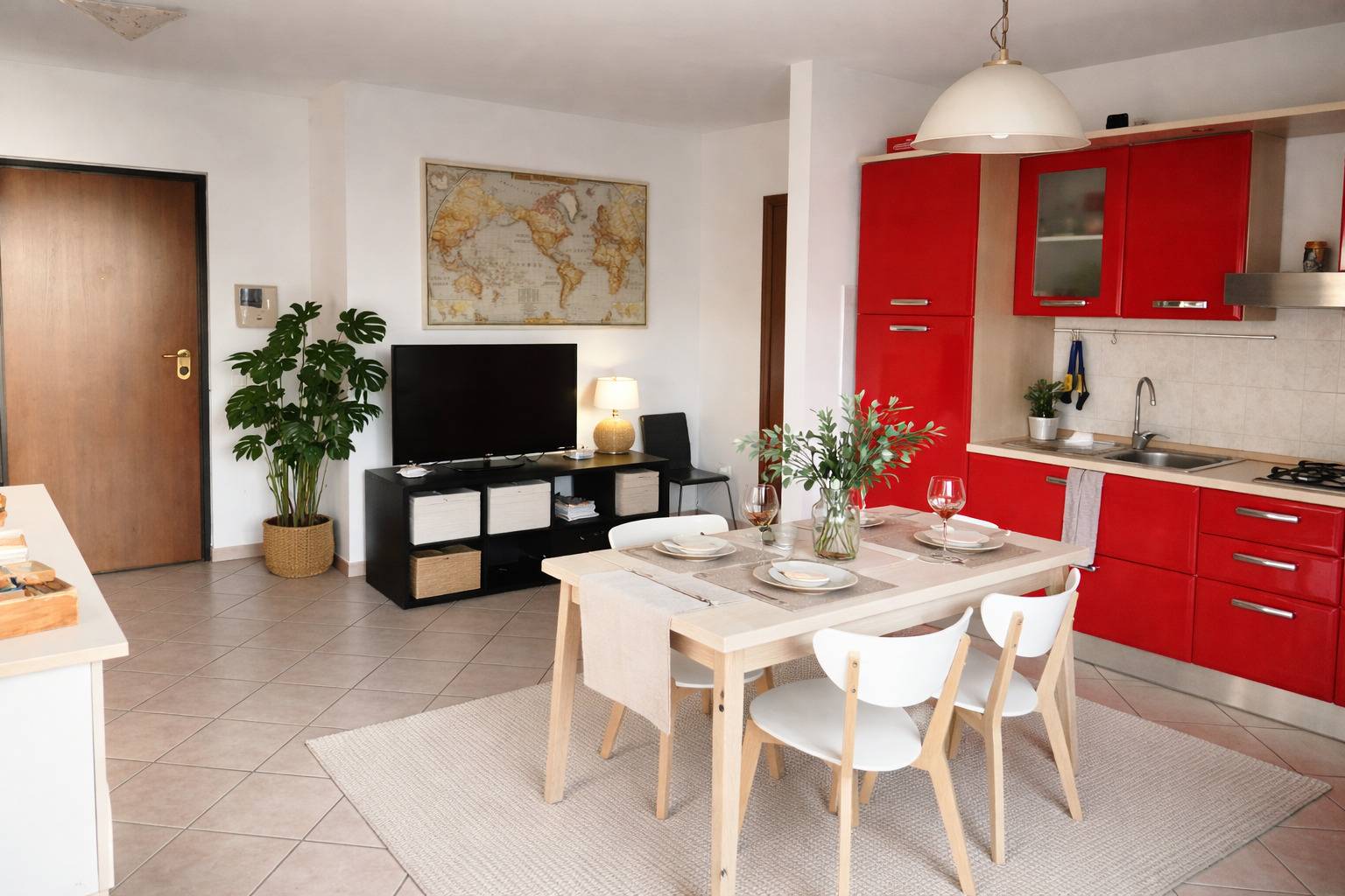 Lappartamento si apre su una luminosa zona giorno con sala a vista e angolo cottura.