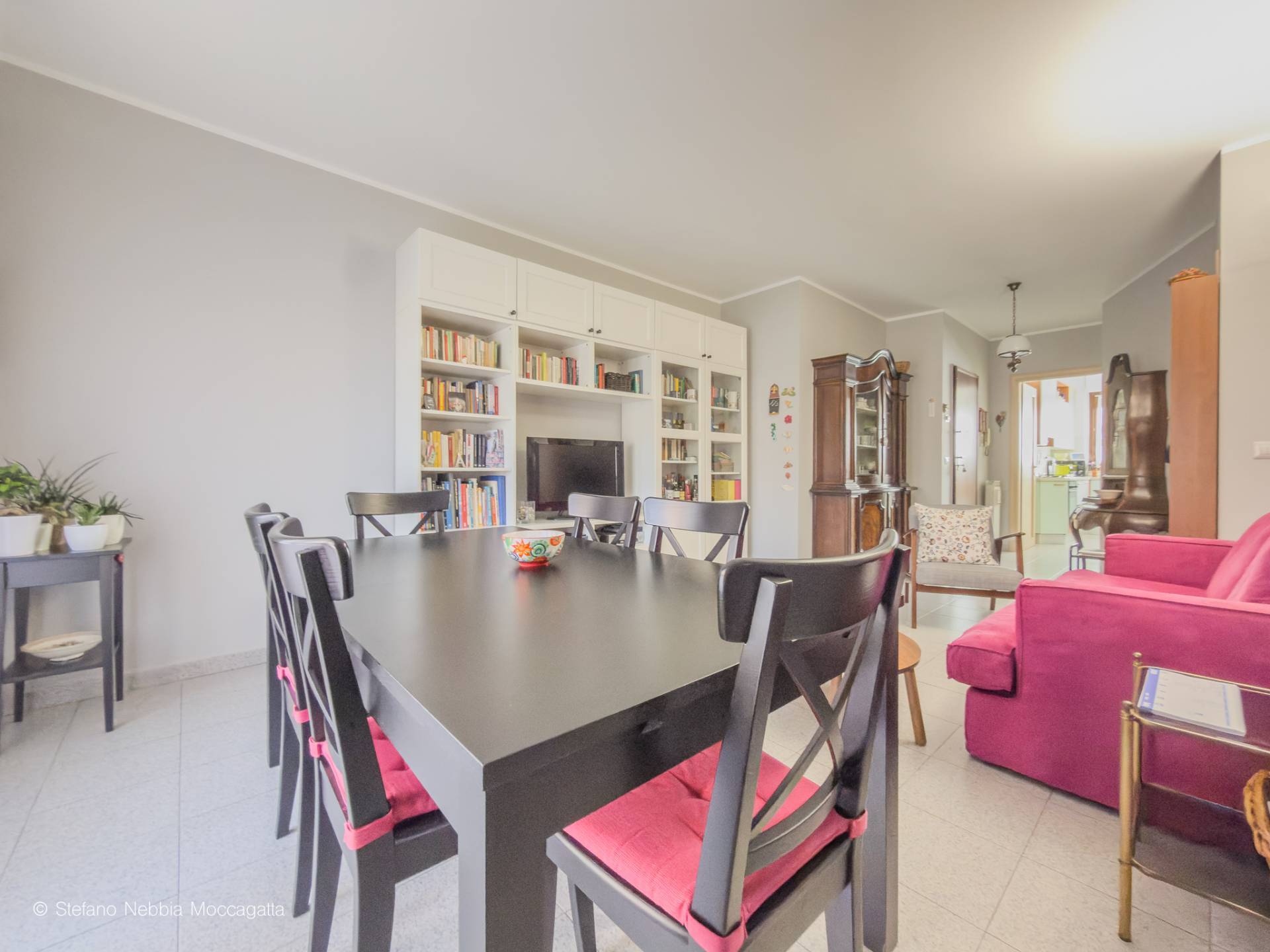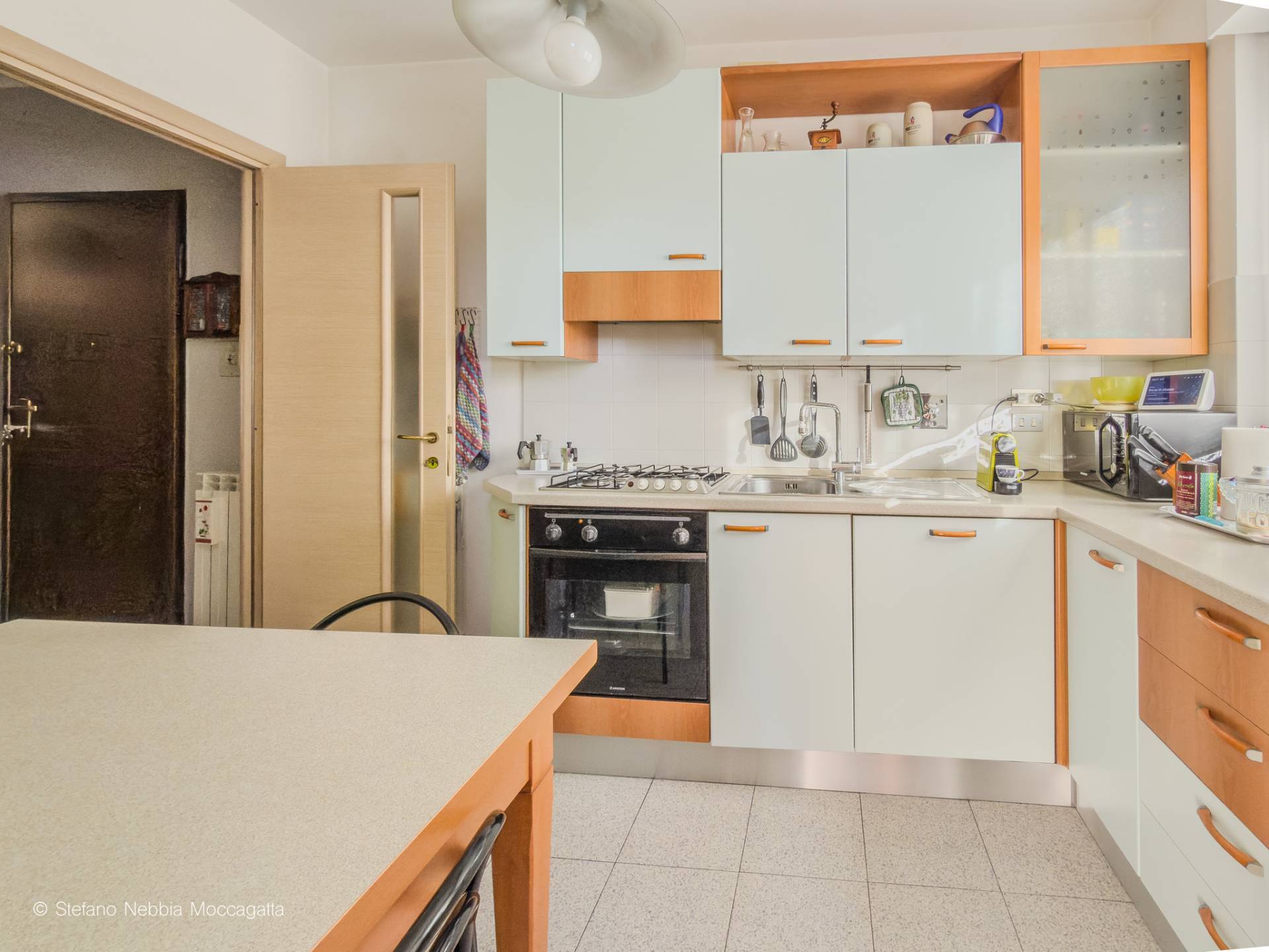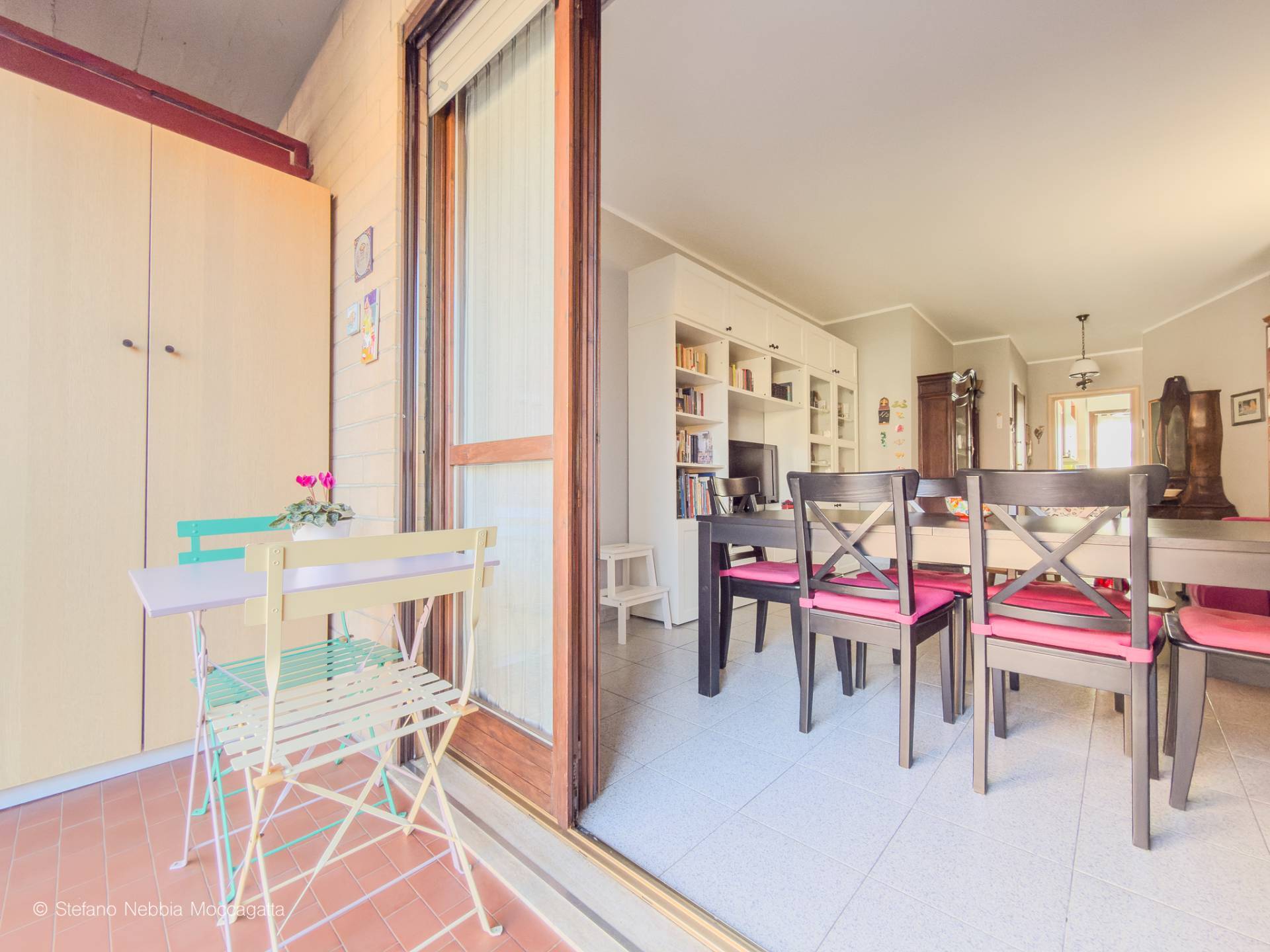 Ingresso su soggiorno e piccolo terrazzino che pu ospitare un tavolo per quattro persone, cucina semiabitabile con secondo balcone, disimpegno con doppi servizi e due camere da letto.