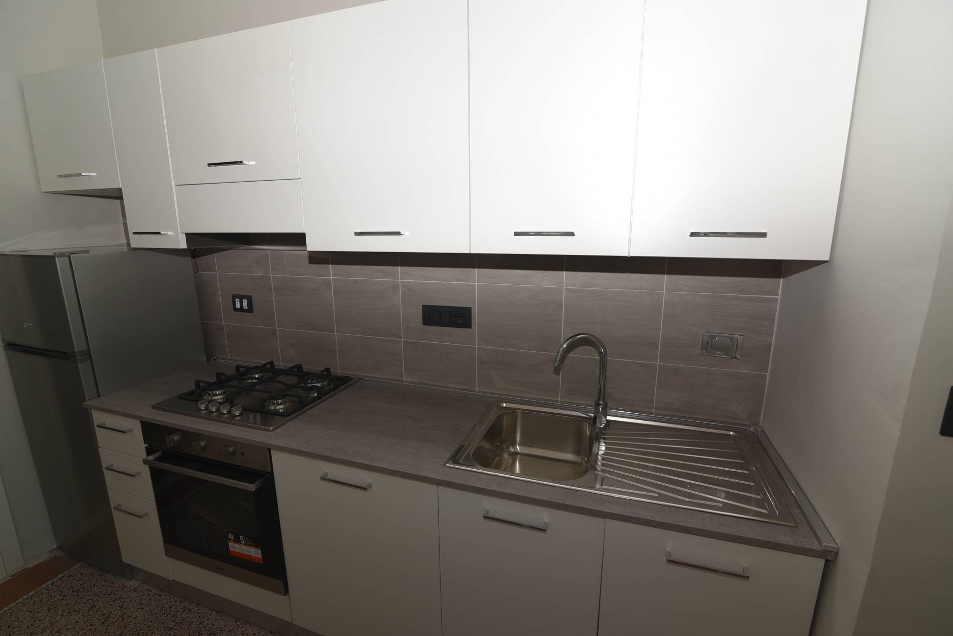 La cucina dotata di elettrodomestici (forno, frigorifero) e lavatrice.